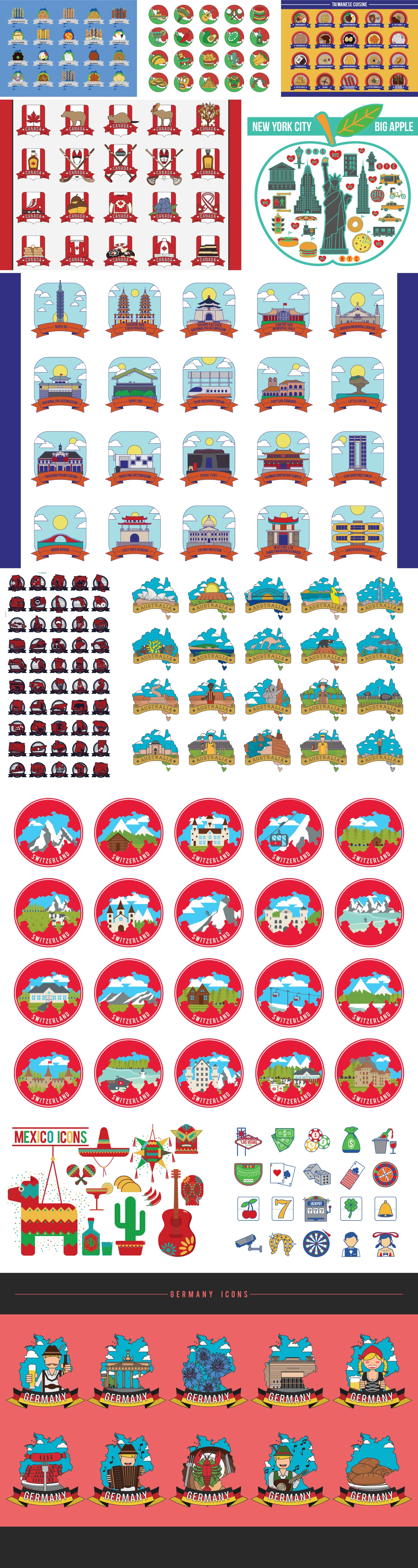 In 2016, I created cohesive country-themed icon sets for StockUnlimited.com—20 icons per set, blending landmarks, food, and culture under tight deadlines.