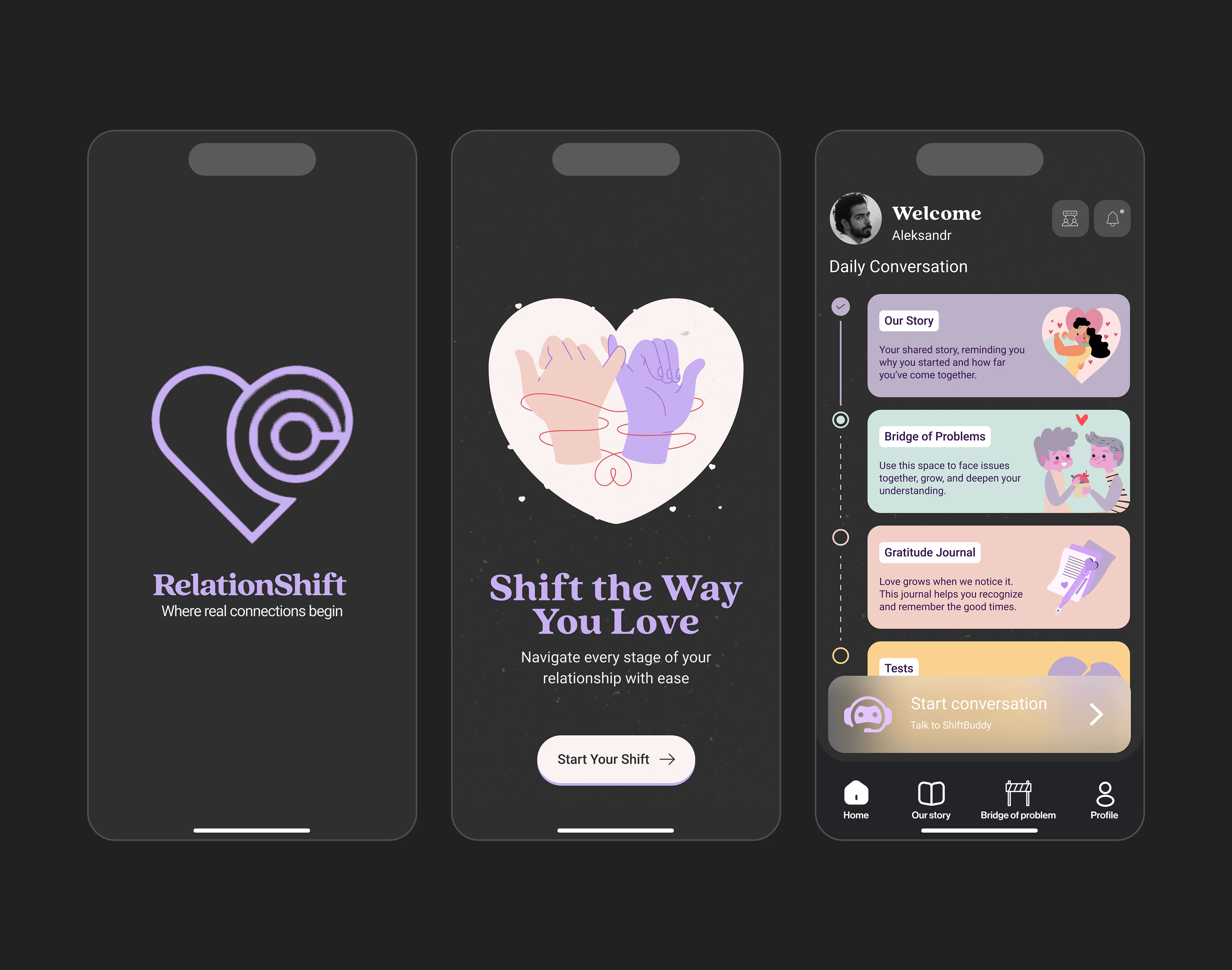 Relationshift is a self-initiated concept focused on nurturing meaningful relationships through intentional design. I crafted a brand identity and key screens for a mobile app that encourages couples and close connections to grow emotionally, track milestones, and stay connected.