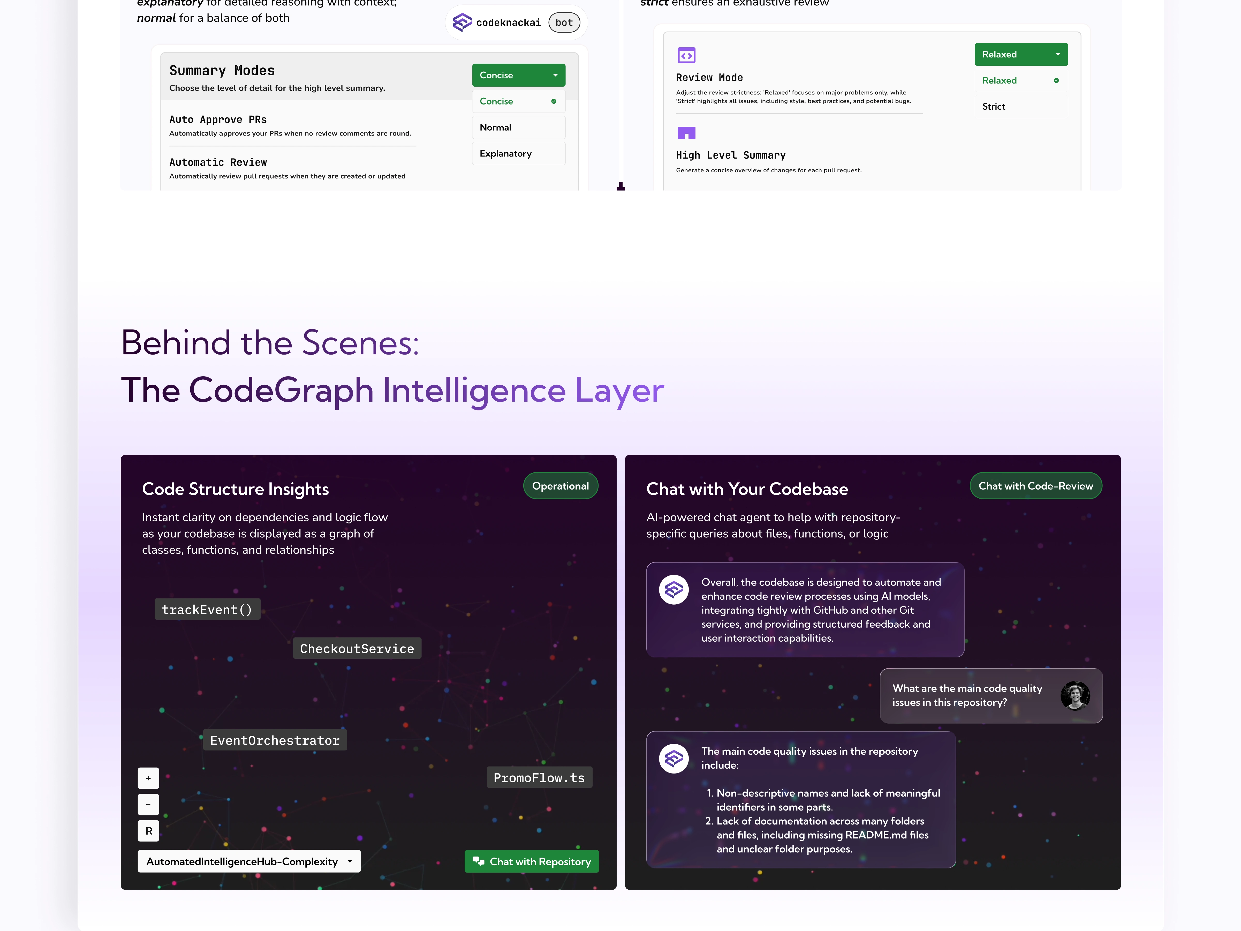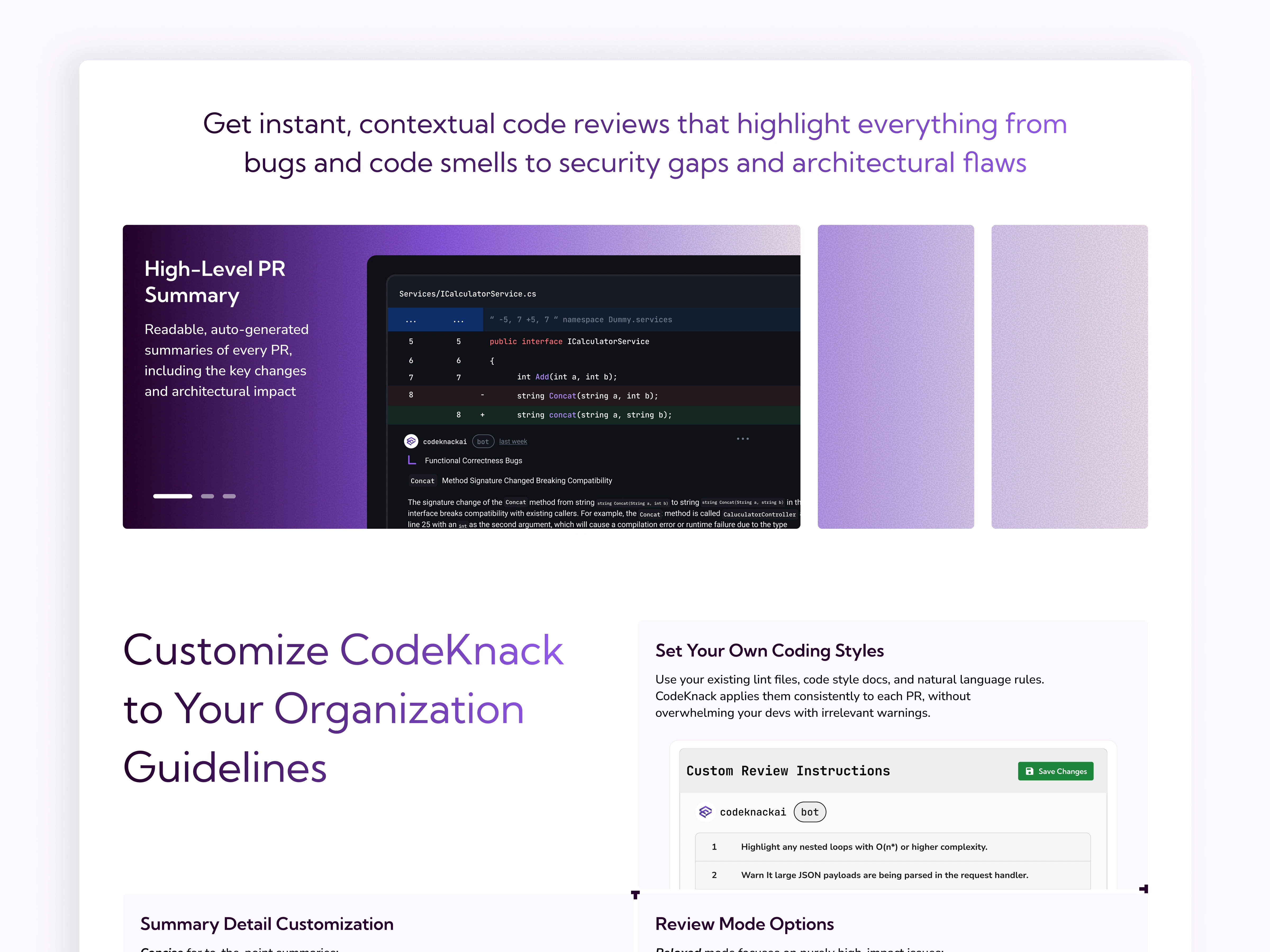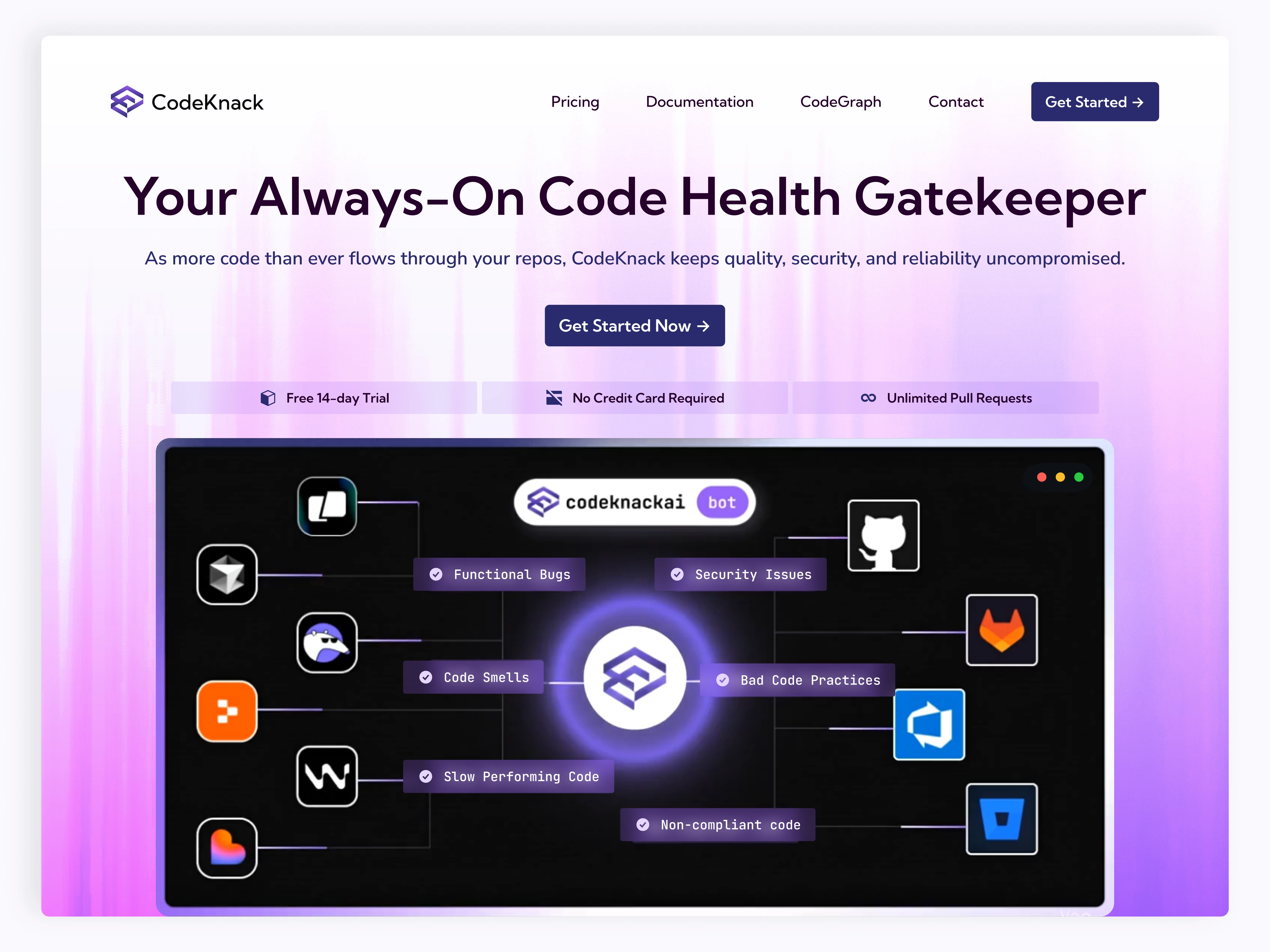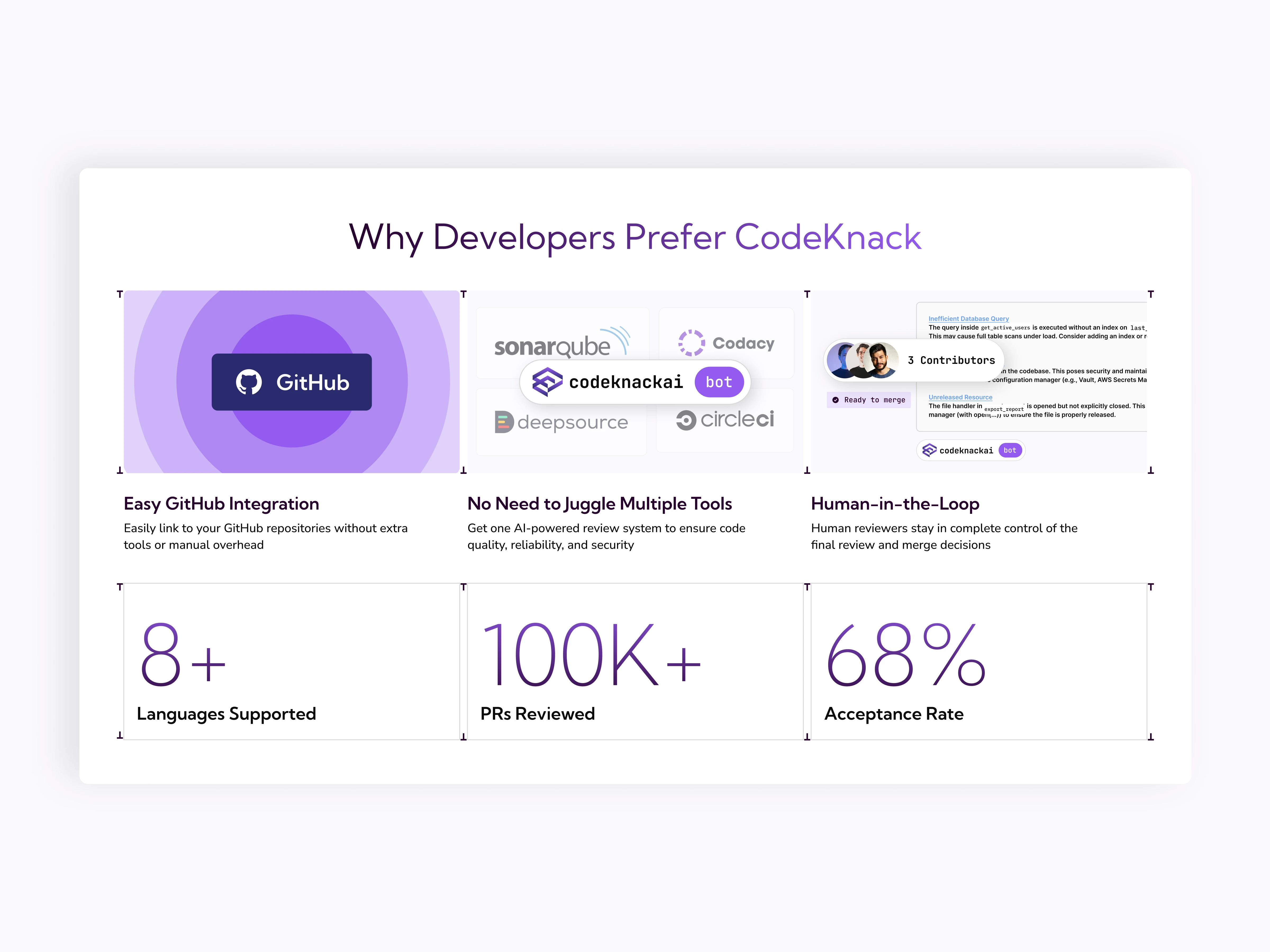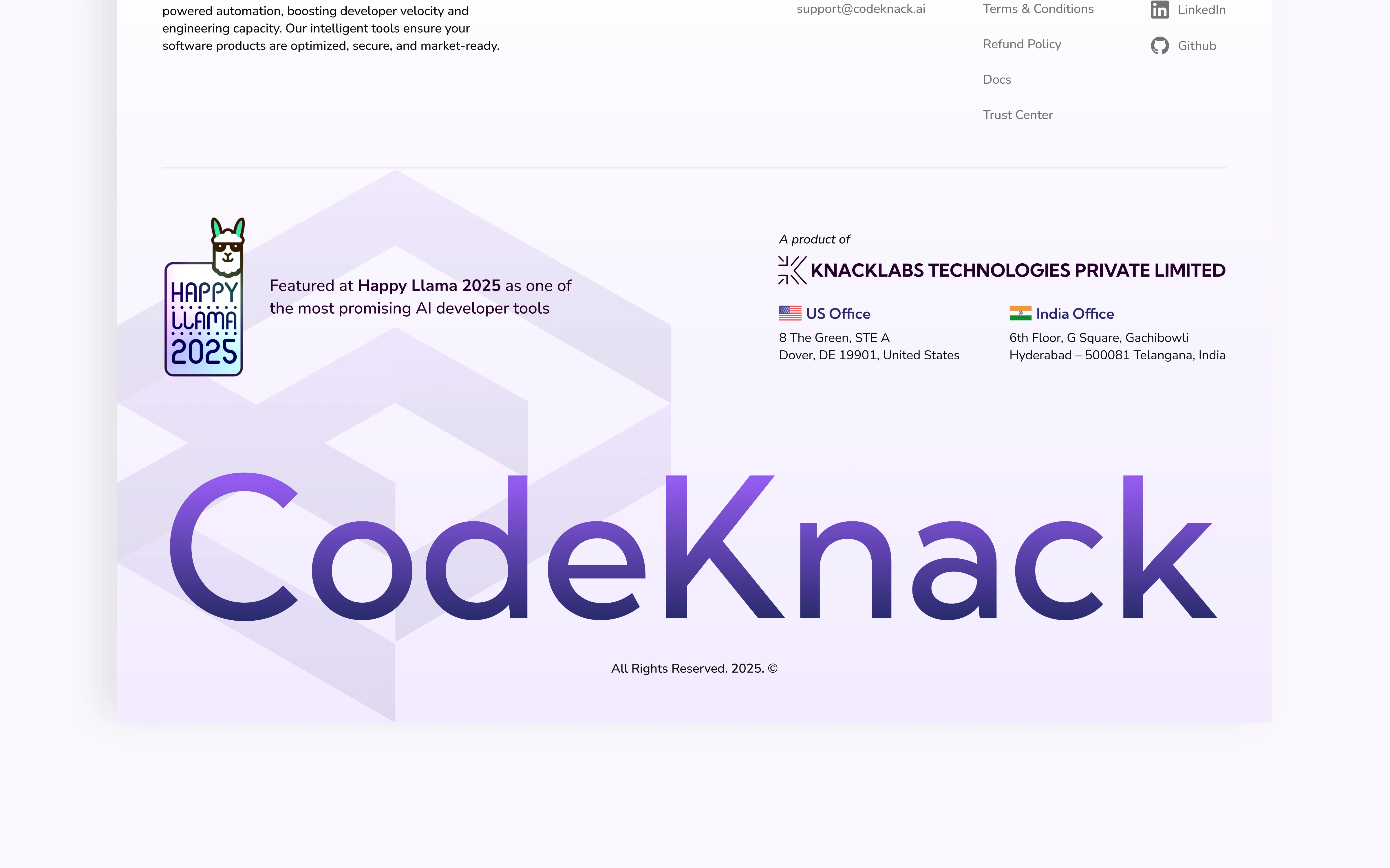 Delivered a professional brand presence that successfully communicates CodeKnack's value to development teams, with clear positioning as an essential code quality tool.
