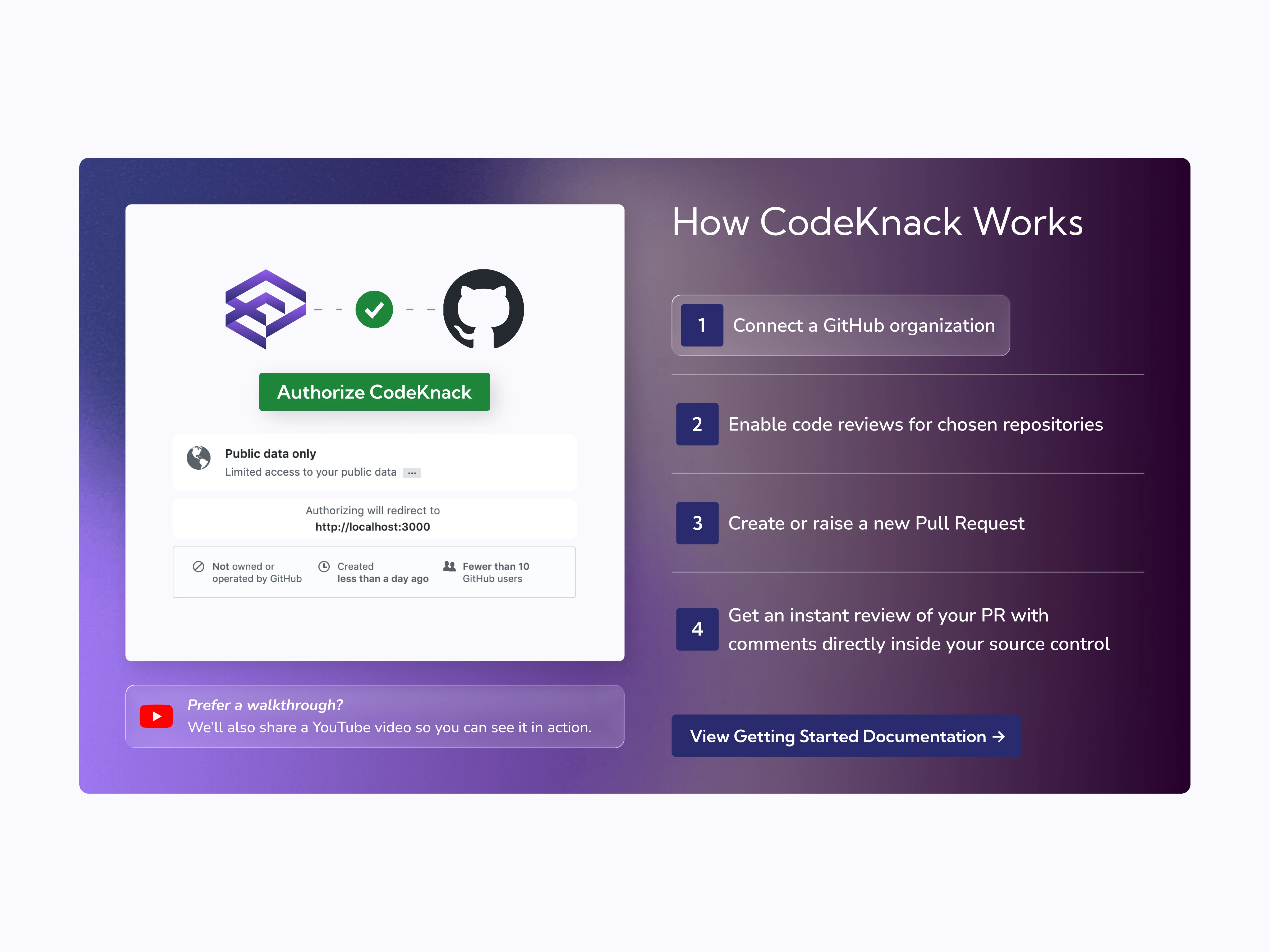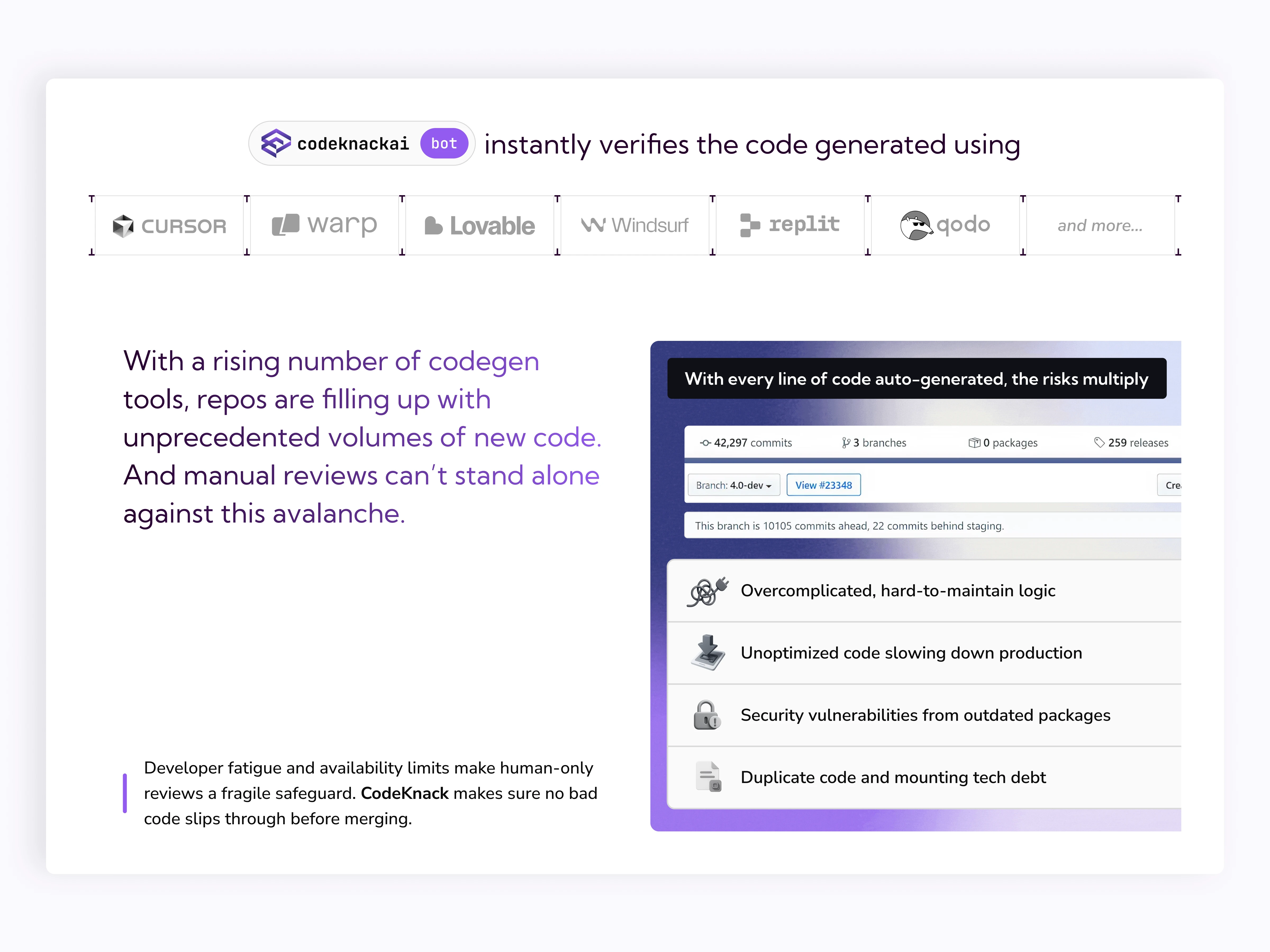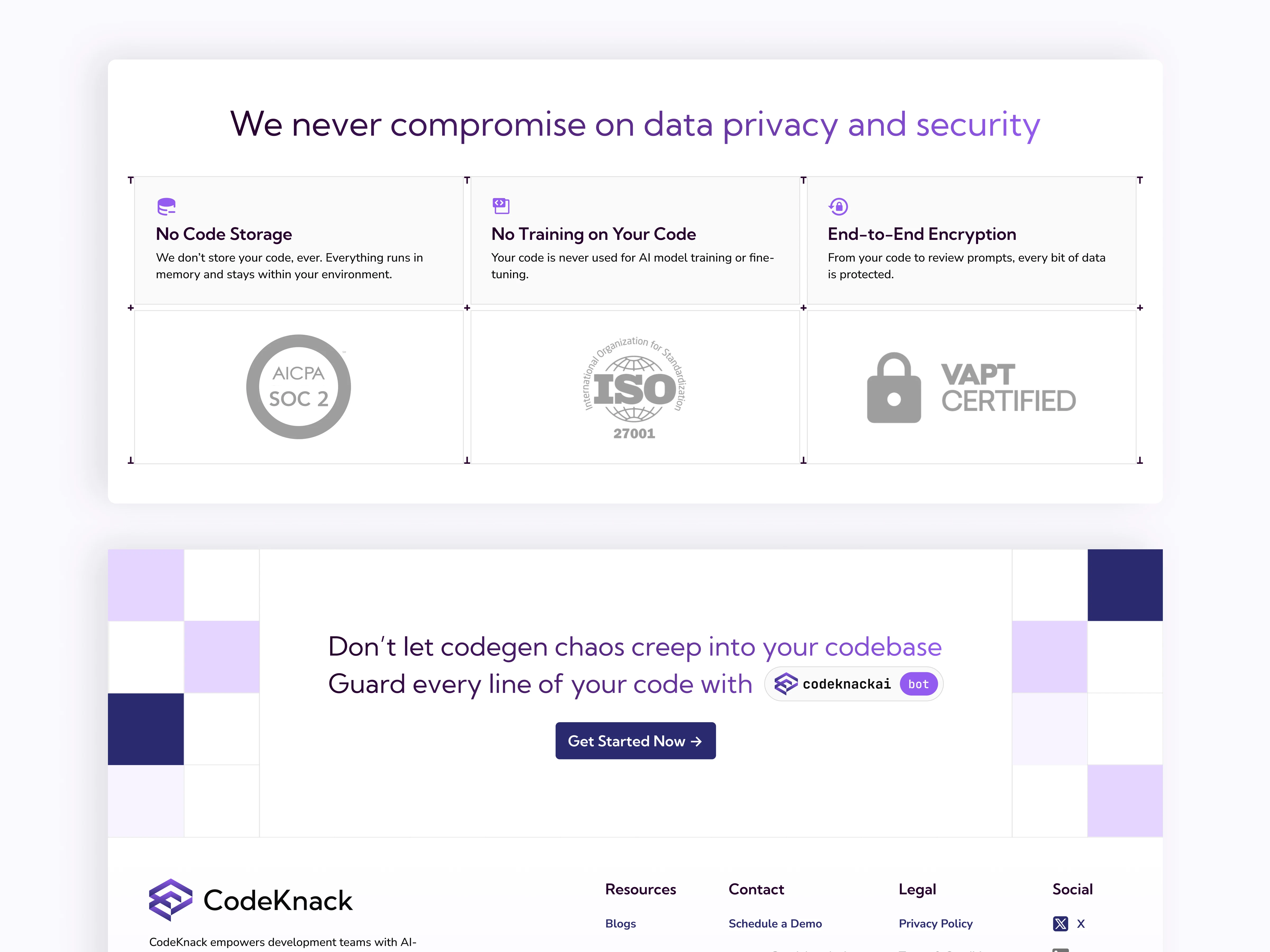 Designed the complete brand identity and landing page experience for CodeKnack, an AI-powered code review platform that serves as a "gatekeeper" for code quality and security in developer workflows.