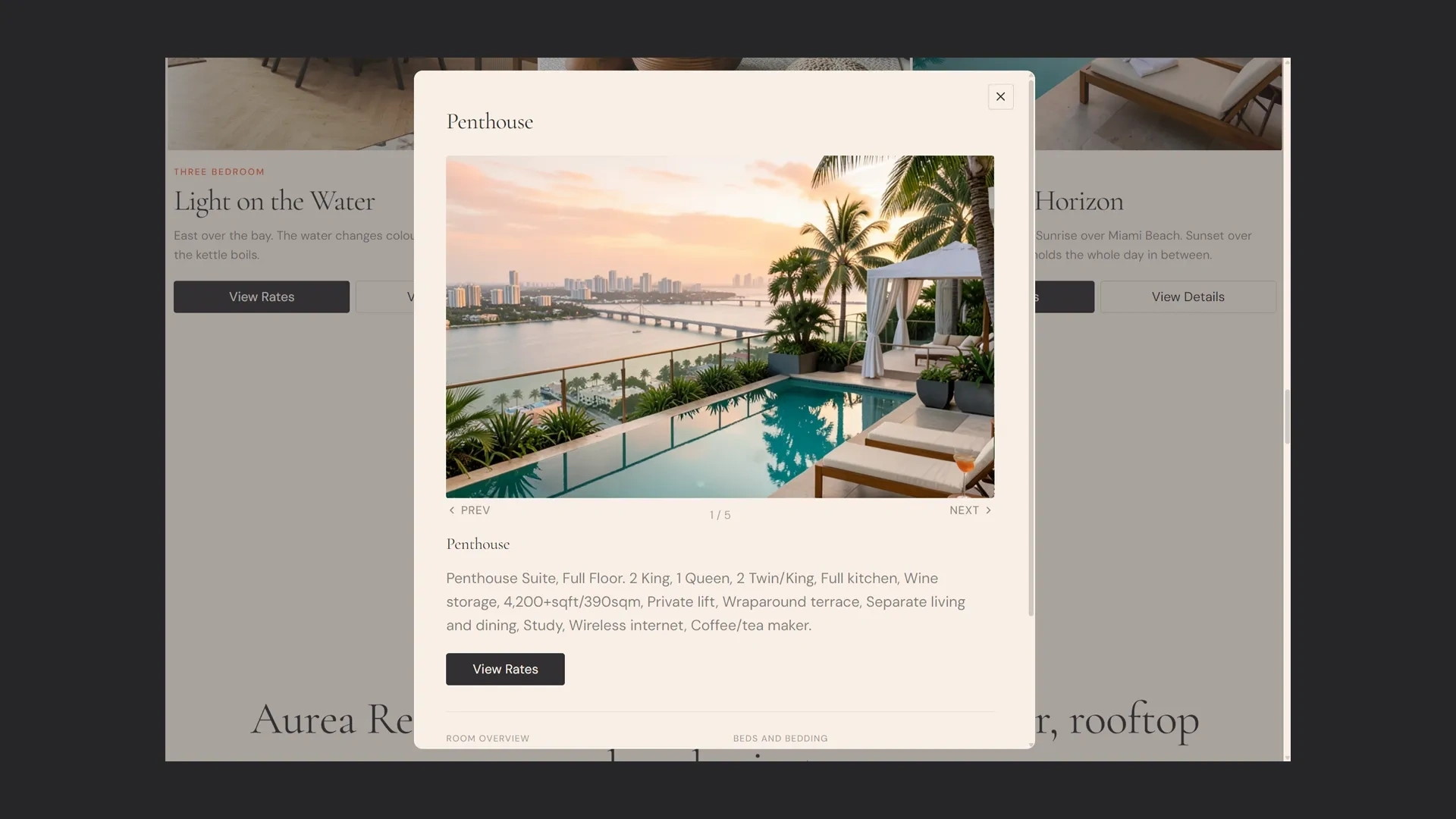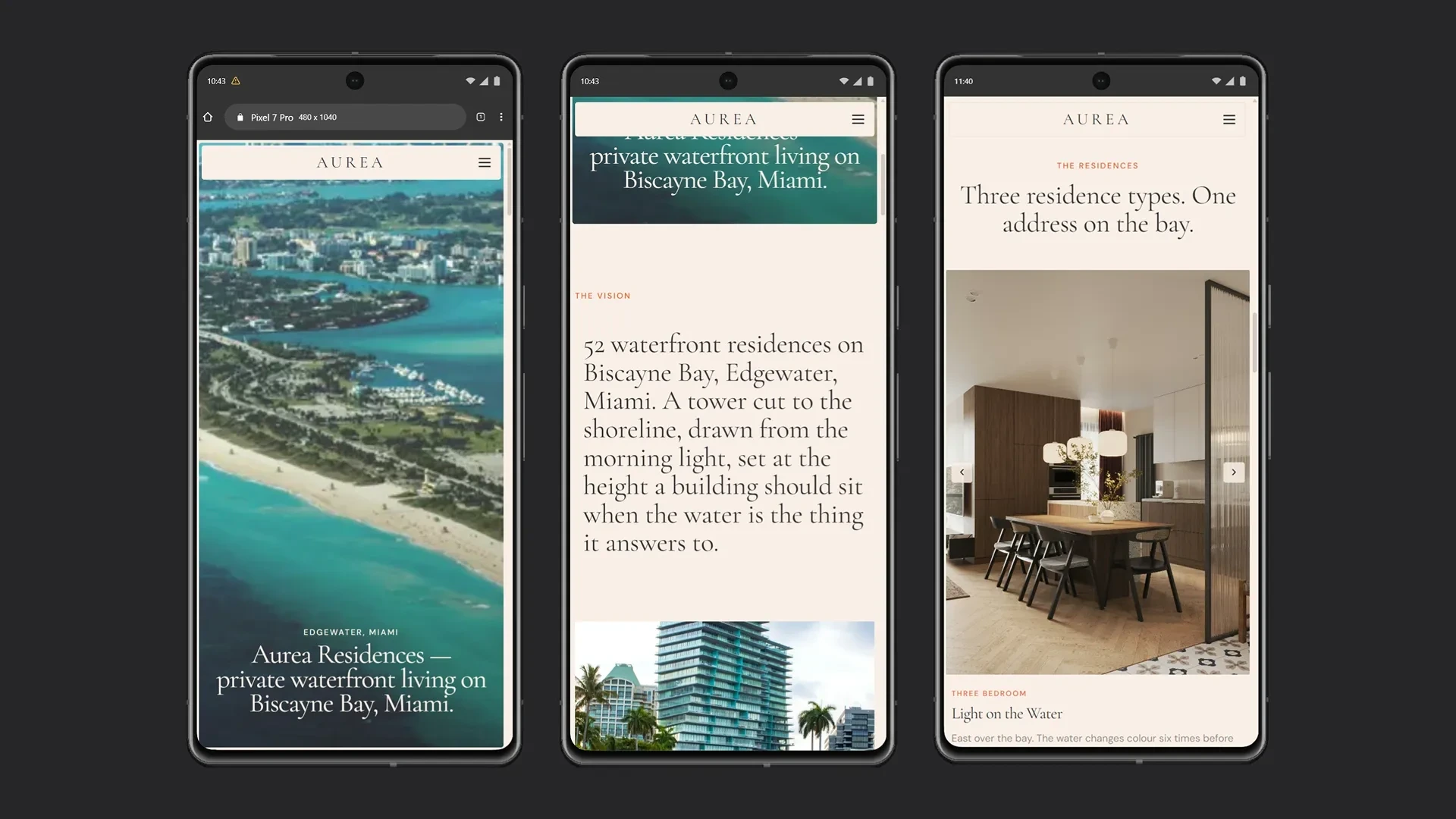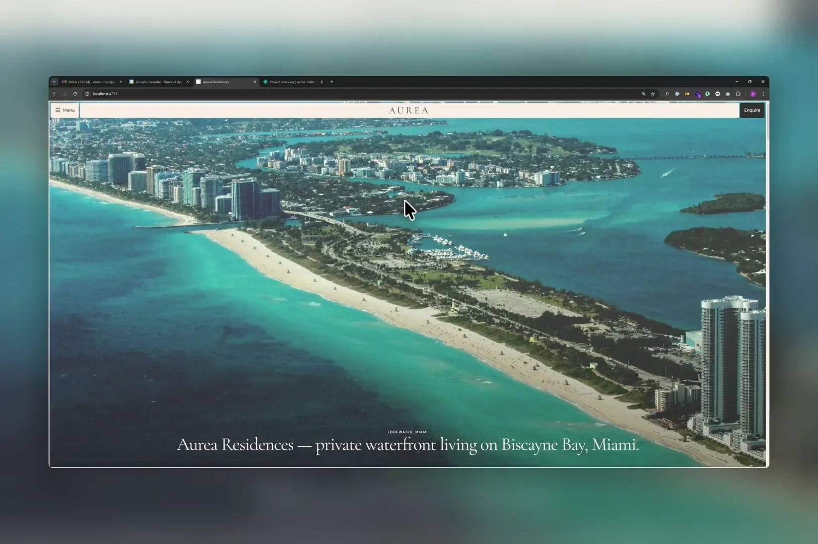 Aurea Residences is a spec project. A fictional 52-storey luxury tower in Miami’s Edgewater district, with direct Biscayne Bay frontage. I wrote the brief as if the development were real. Four weeks, one person, everything from brand to build.