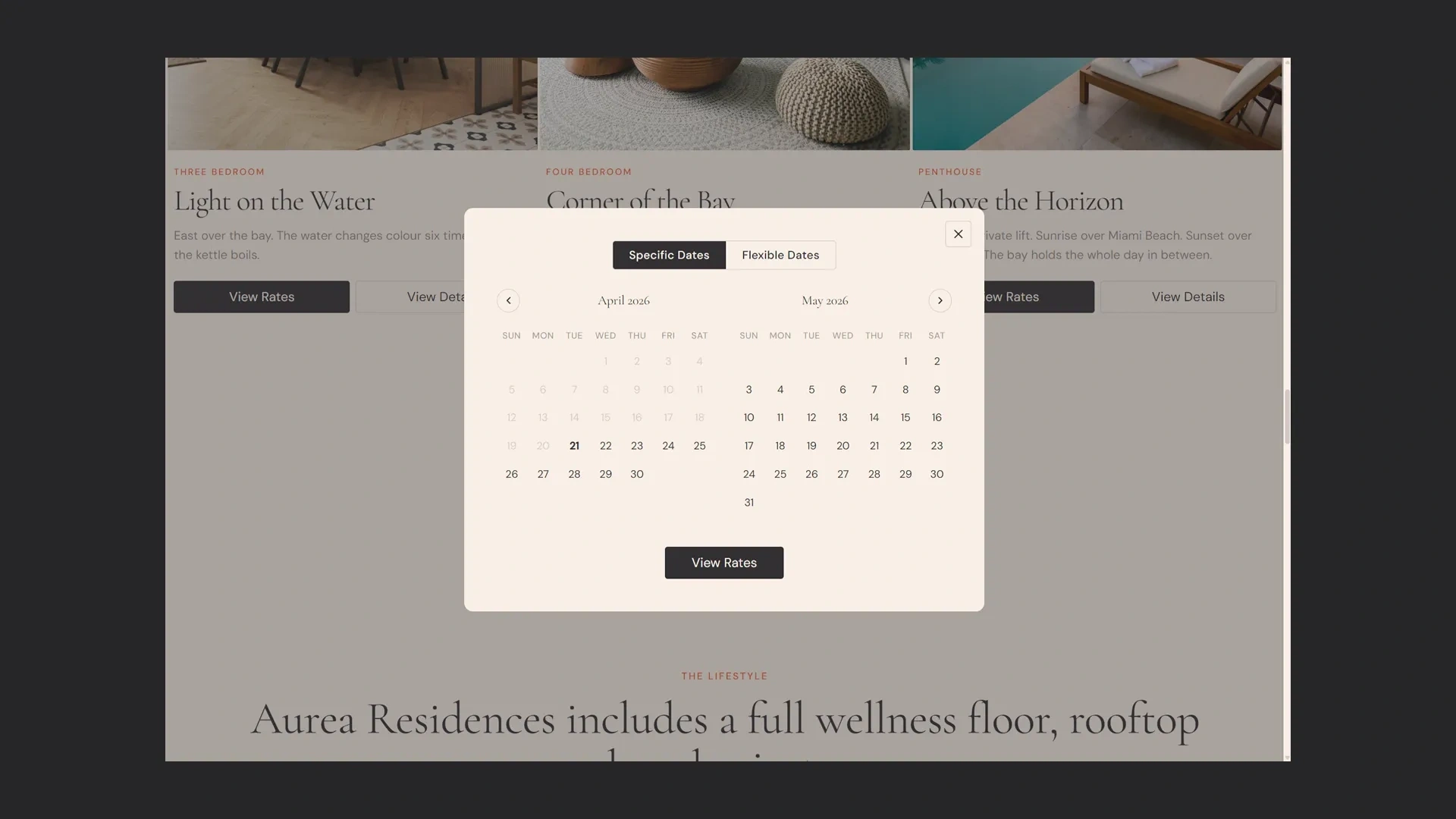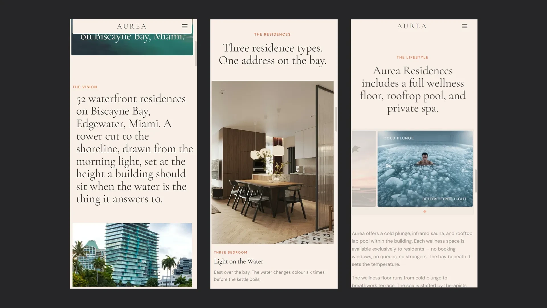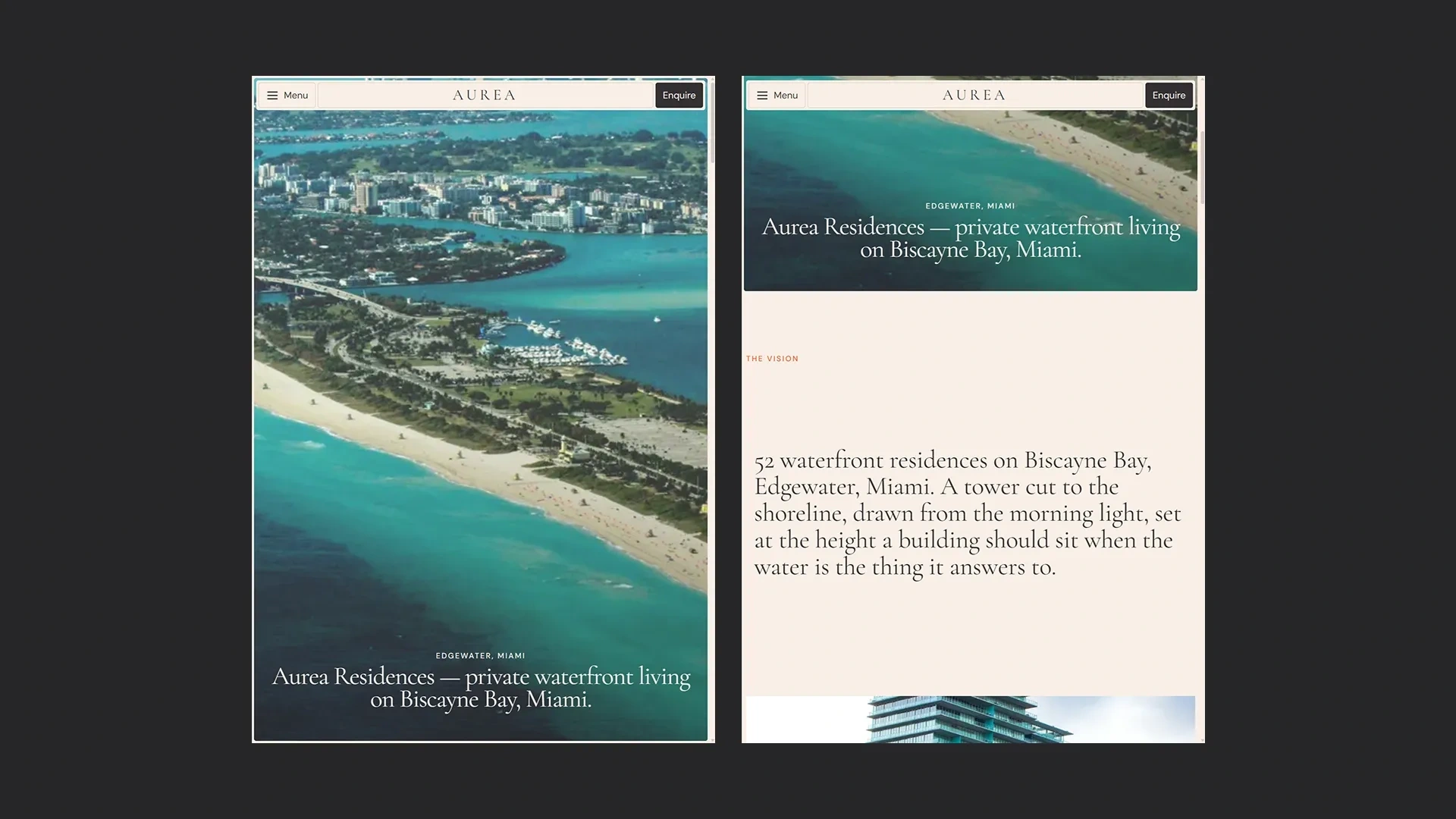 Each section has a job. Hero sets the mood. Vision states the thesis. Residences covers the apartment typologies. Lifestyle reframes the amenities as a day in the building. Neighbourhood places Edgewater in context. Enquiry asks for the minimum needed to start a conversation.