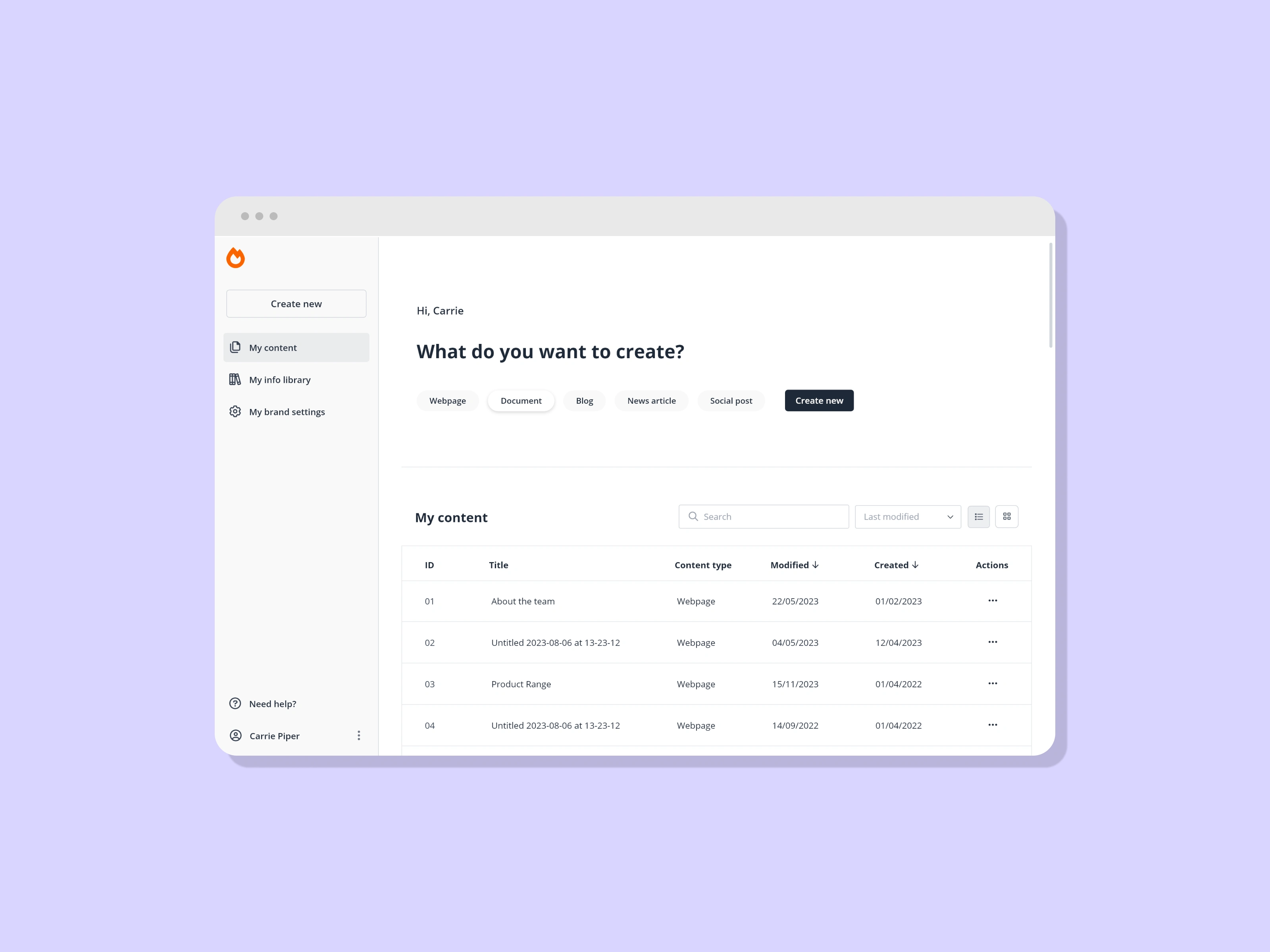 Built an AI content hub dashboard with clear hierarchy and dev-ready UI, helping teams generate, review, and organize content at scale.