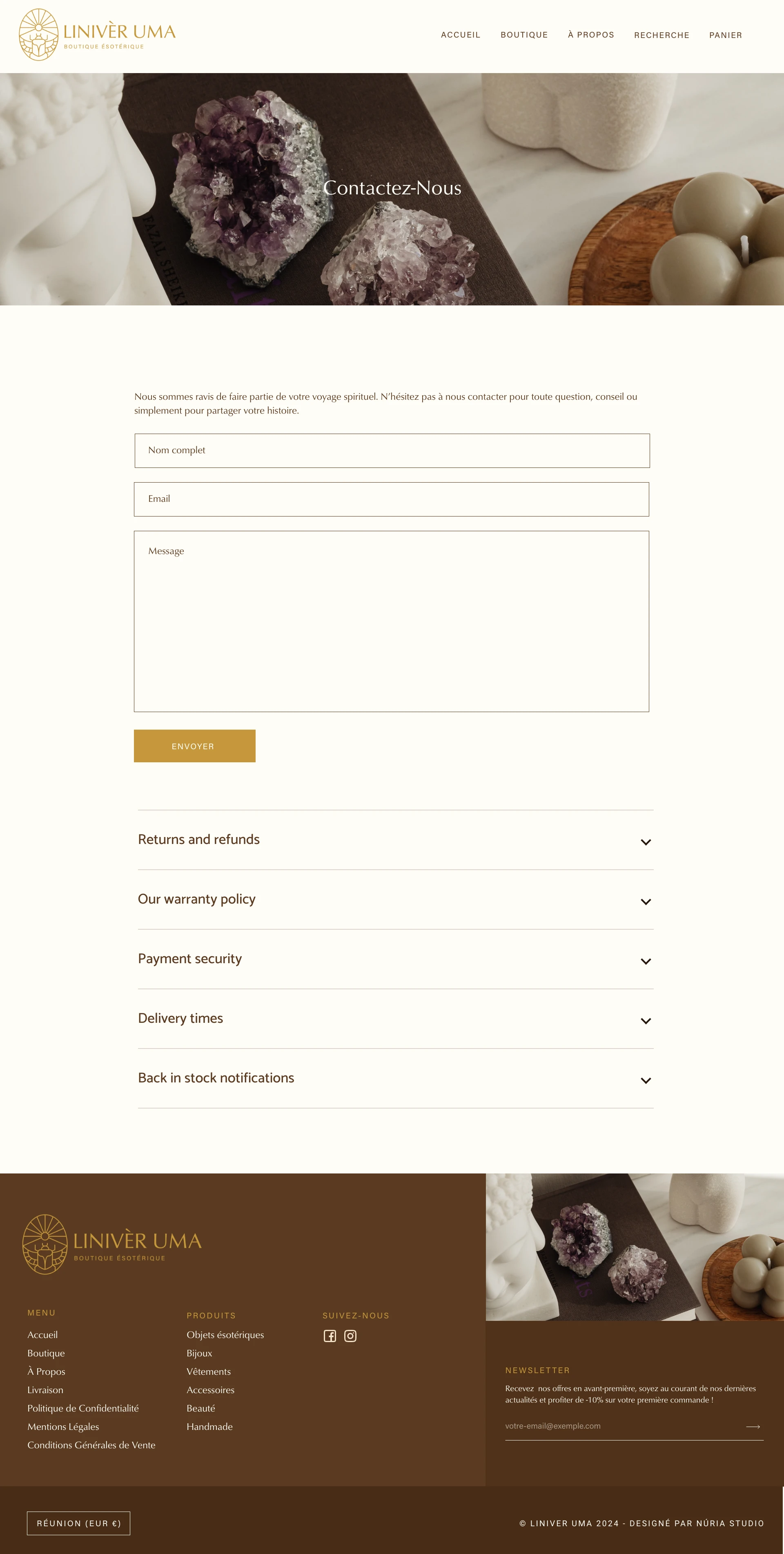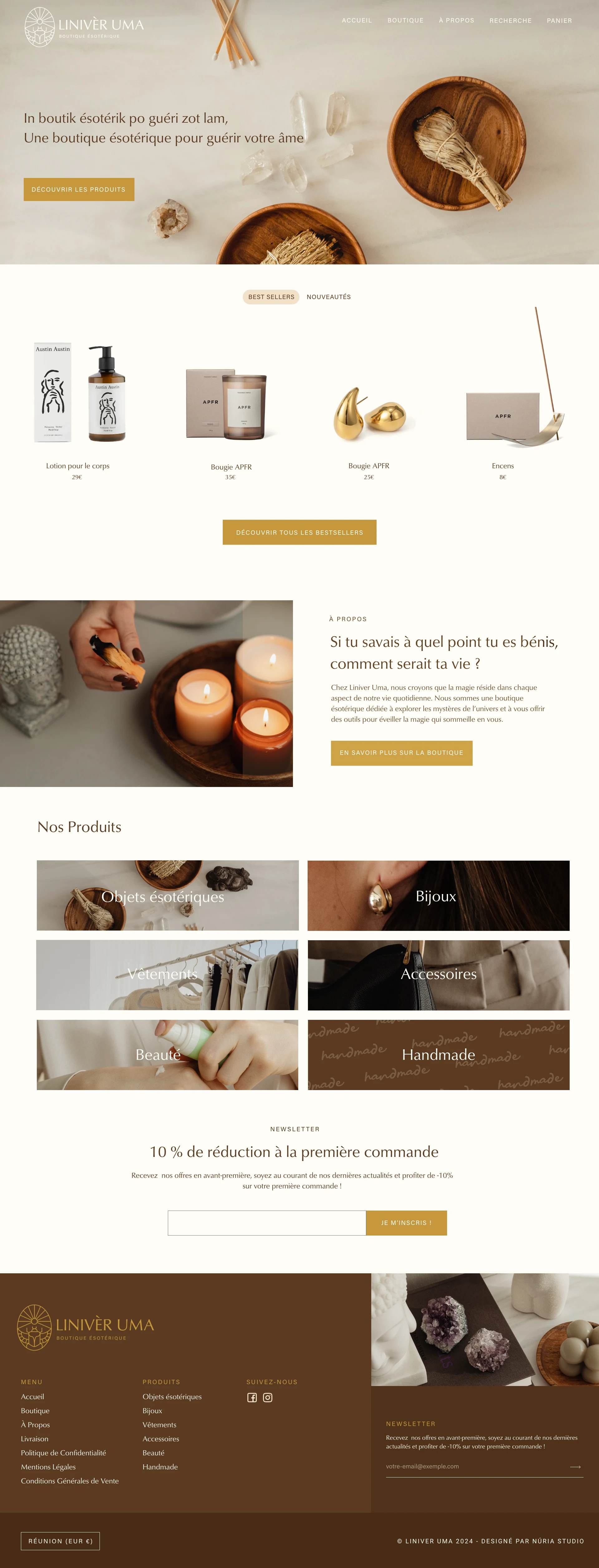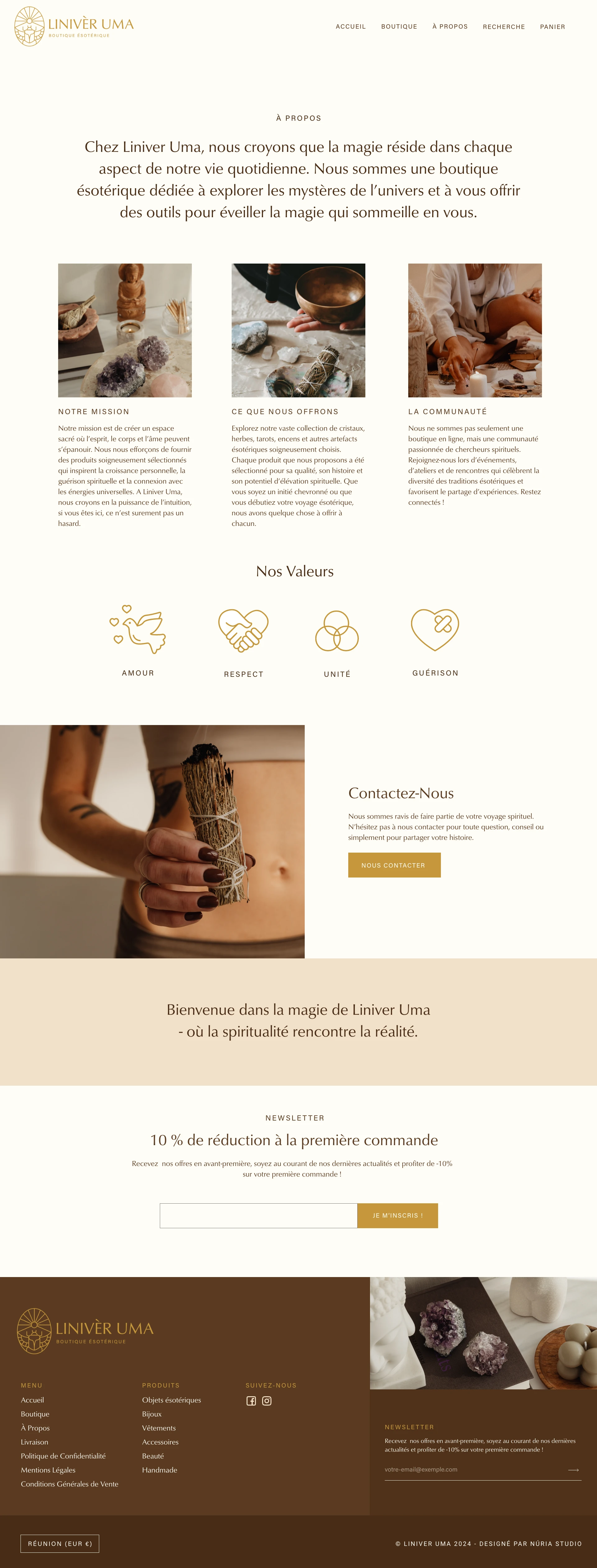 I designed and developed a Shopify website with a warm, earth-toned aesthetic that evokes tranquility and spiritual connection. The design features natural imagery, soft textures, and a muted color palette of beiges, browns, and golds that creates a calming atmosphere. The homepage introduces the brand philosophy with elegant typography and lifestyle photography showing ritualistic moments with candles, crystals, and natural elements. Clear category organization allows customers to explore products by type, while the "About" page communicates the brand's mission and values through three pillars: mission, offerings, and community, supported by core values of love, respect, unity, and healing.