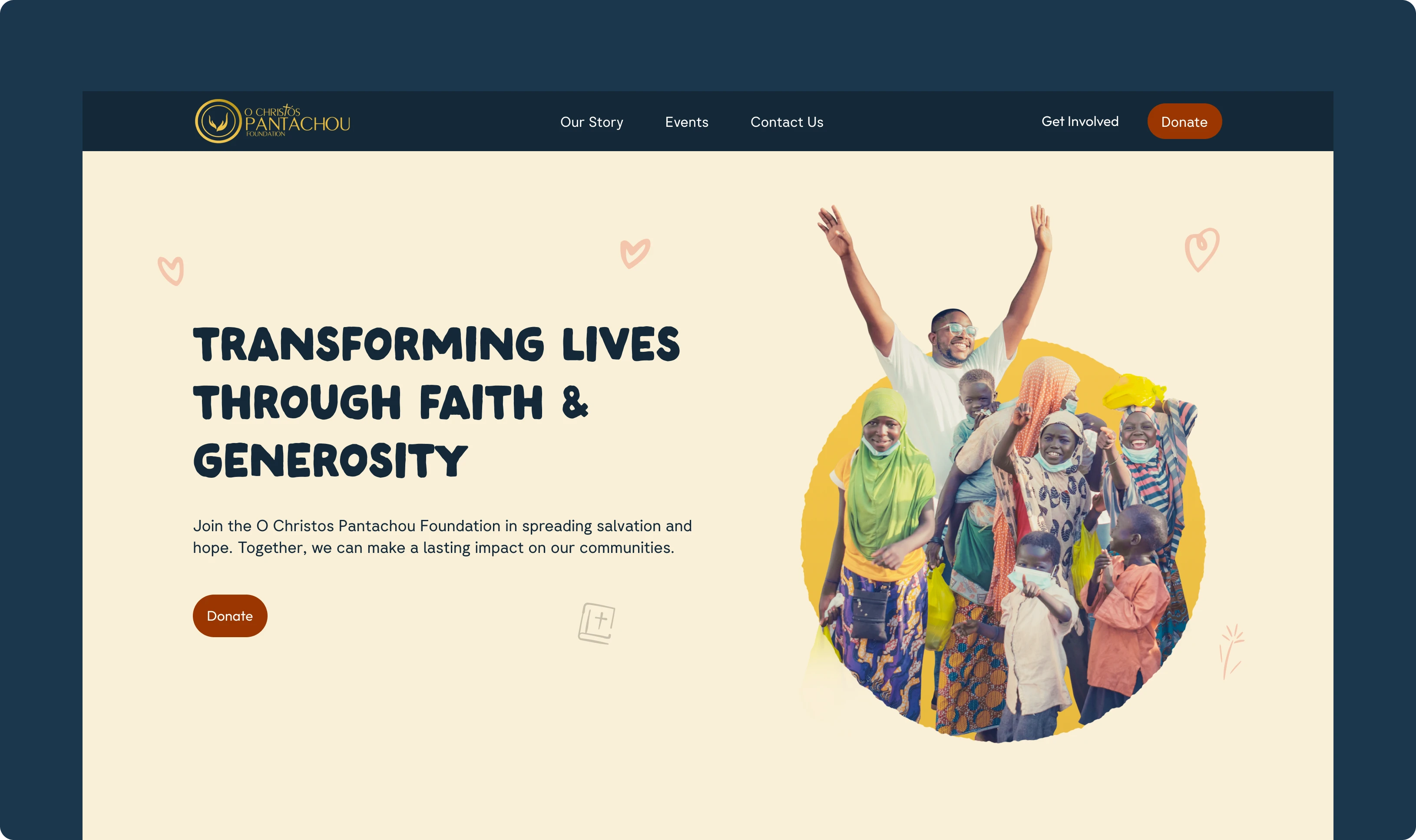 Sections for Story, Events, Donate, and Volunteer