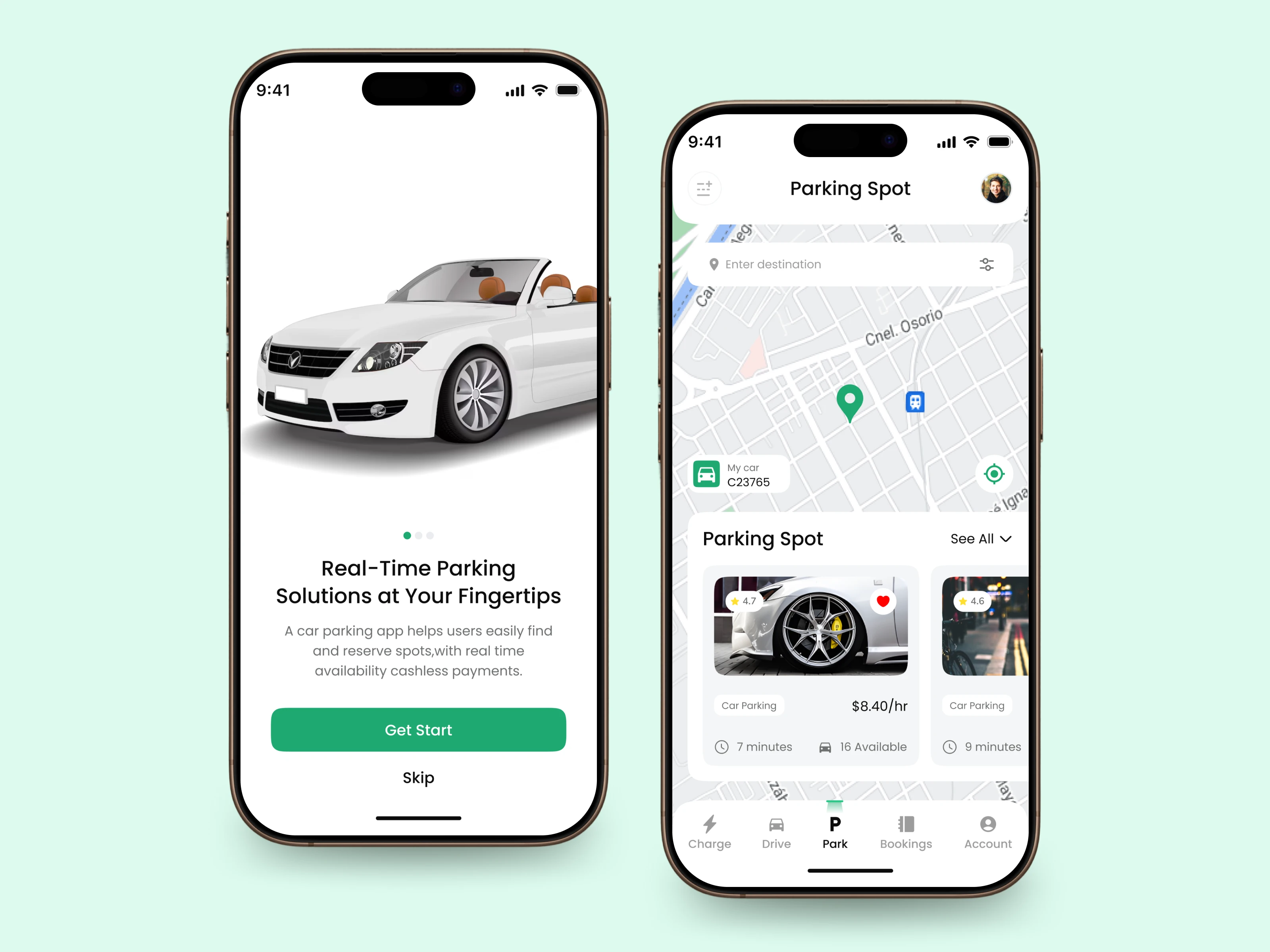 The left screen shows a home page with a map and a search bar where the user can find the nearest parking lots and read short info on the parking. The second screen shows the location of parking that you can book.