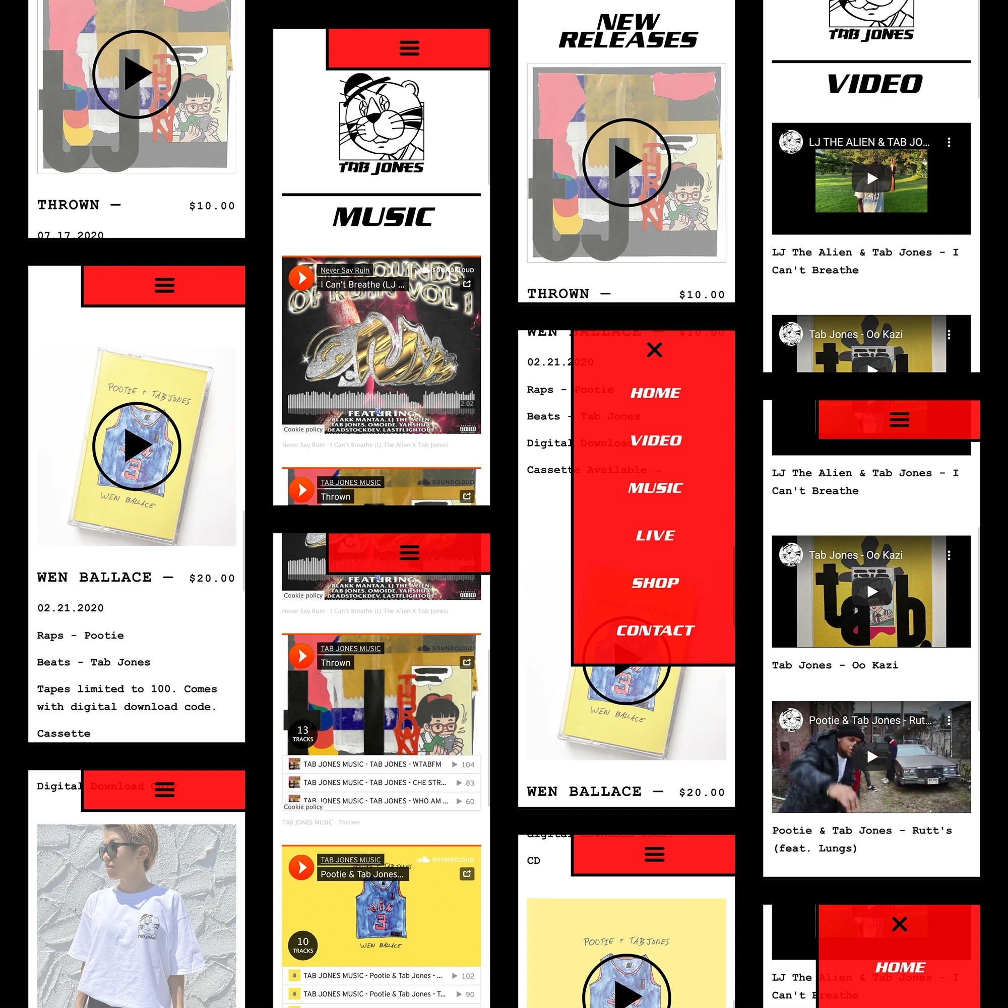 For tabjones.com, the main goal was to provide the DJ / Producer's audience with an easy and straightforward digital experience for purchasing music or merchandise. The design intentionally achieves a visually retro fit that complements Tab's tracks and albums strung with old school samples.