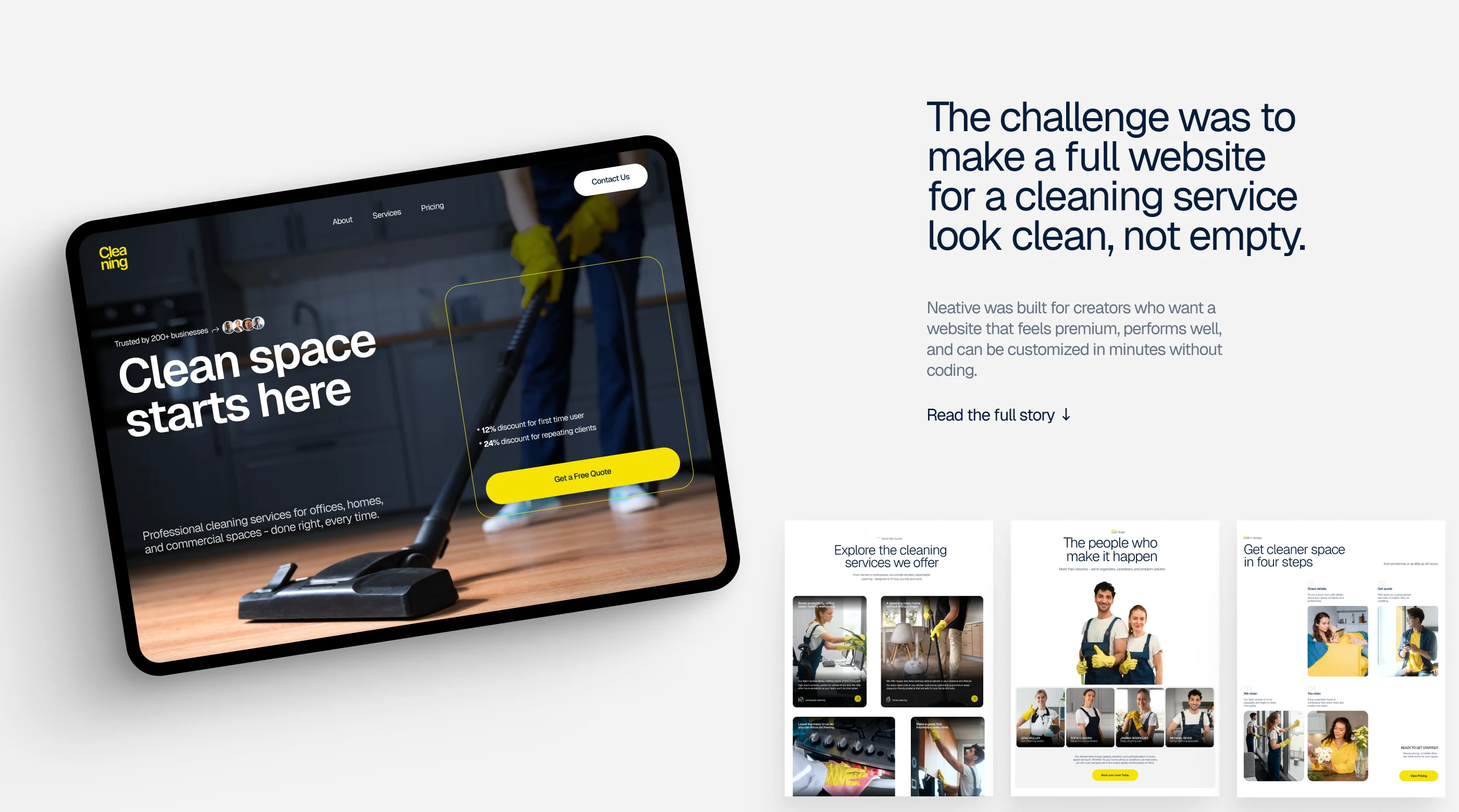 Most local cleaning businesses struggle with the same problem their work is great, but their website doesn’t show it. So I created Neative, a modern Framer template that helps cleaning brands present themselves clearly, build credibility, and turn visitors into paying customers.