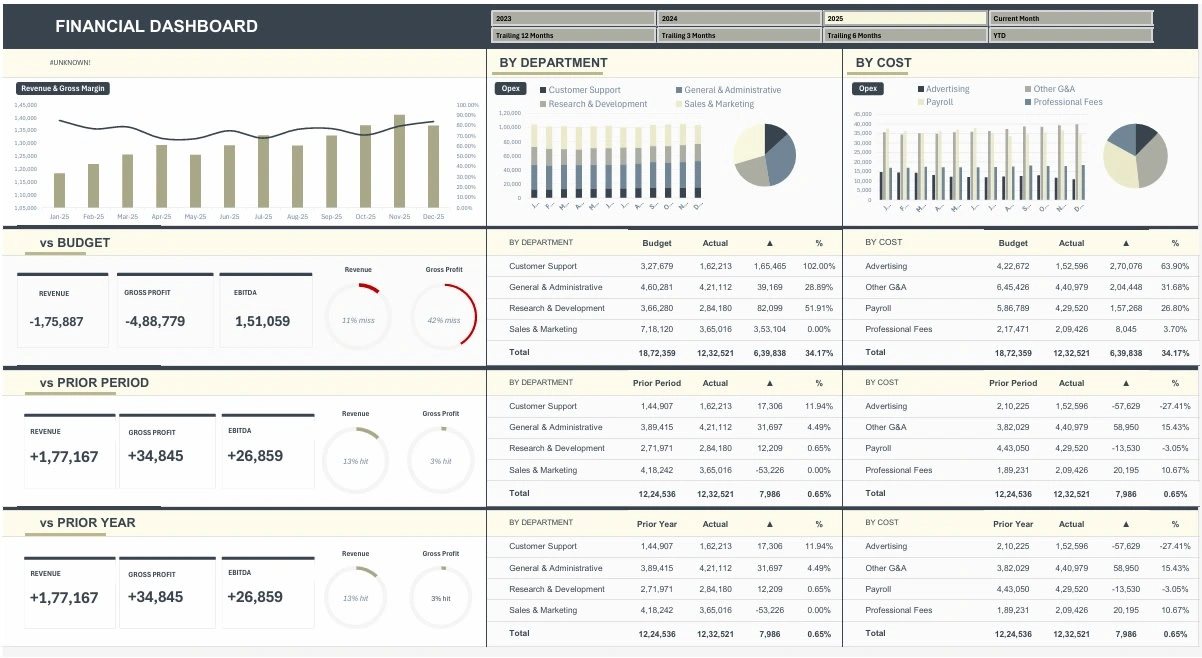 Financial dashboard summarizing revenue, gross margin, budget vs. actuals, and departmental/cost breakdowns with visuals to track business performance trends.