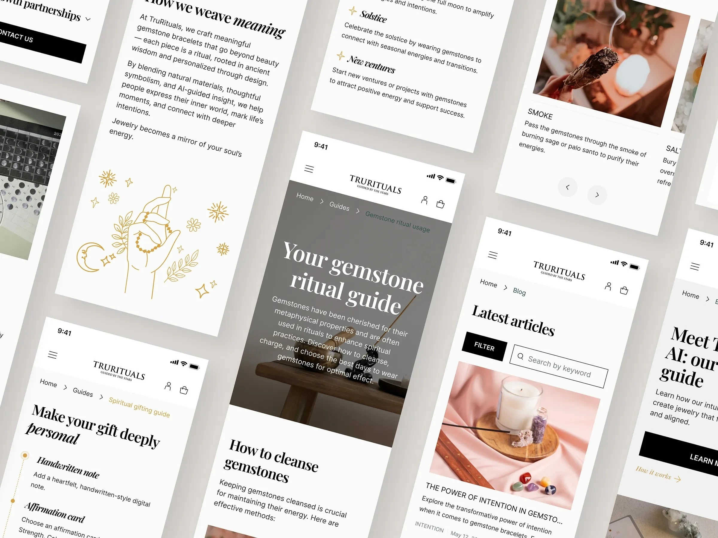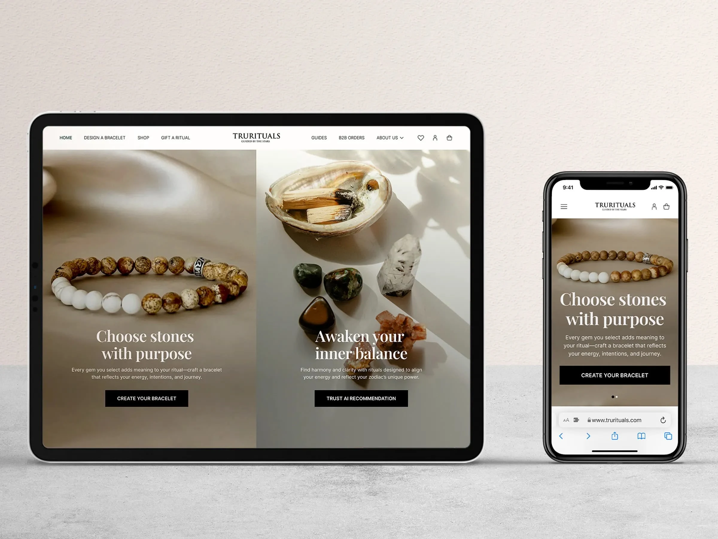 We designed TrueRituals, a premium e-commerce platform dedicated to individually crafted gemstone accessories. Conceived from the ground up in both desktop and mobile versions, the project opens the door to a personalized gemstone journey, where every user can explore, customize, and connect with pieces that reflect their unique story.