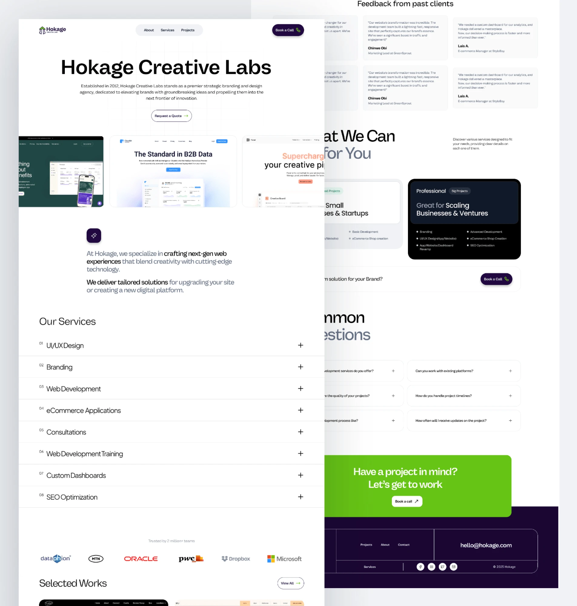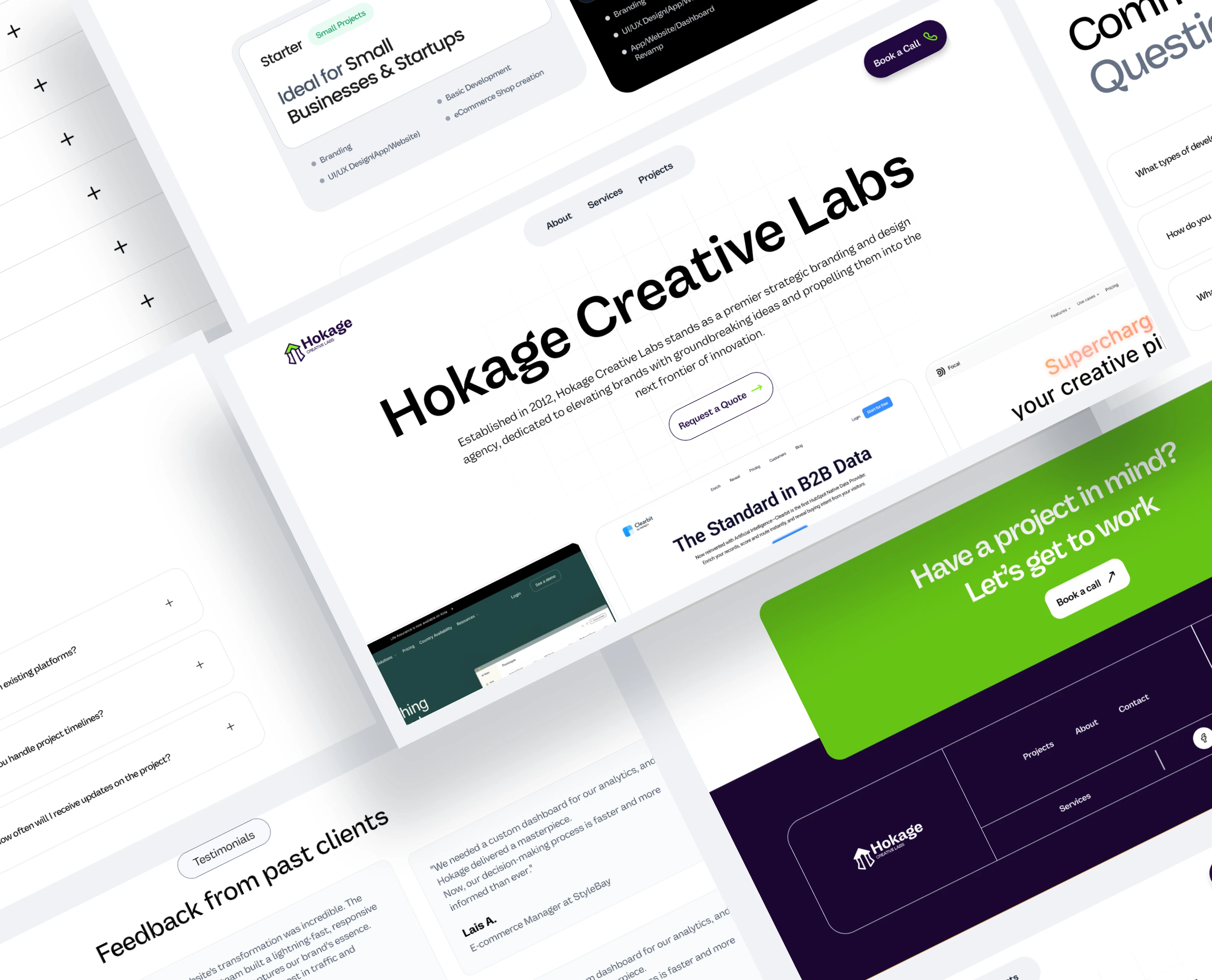 The Hokage Creative Labs website is a modern, visually striking digital presence for a creative agency that merges bold storytelling with innovative design. The layout emphasizes simplicity, confidence, and motion, positioning Hokage as a forward-thinking partner for startups and brands looking to scale.