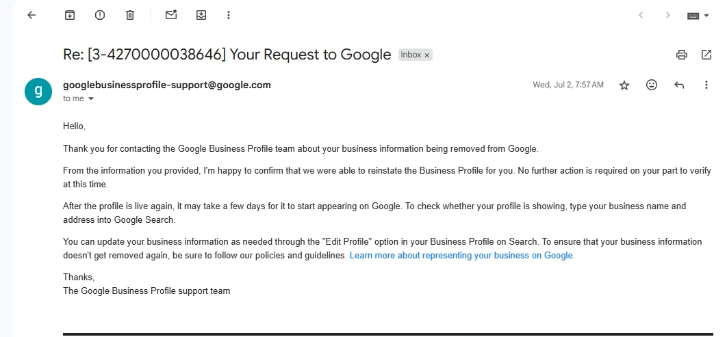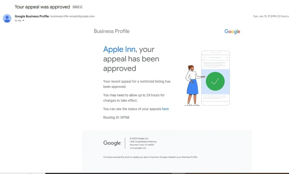 Resolved Google suspension, reinstating Apple Inn's business profile.