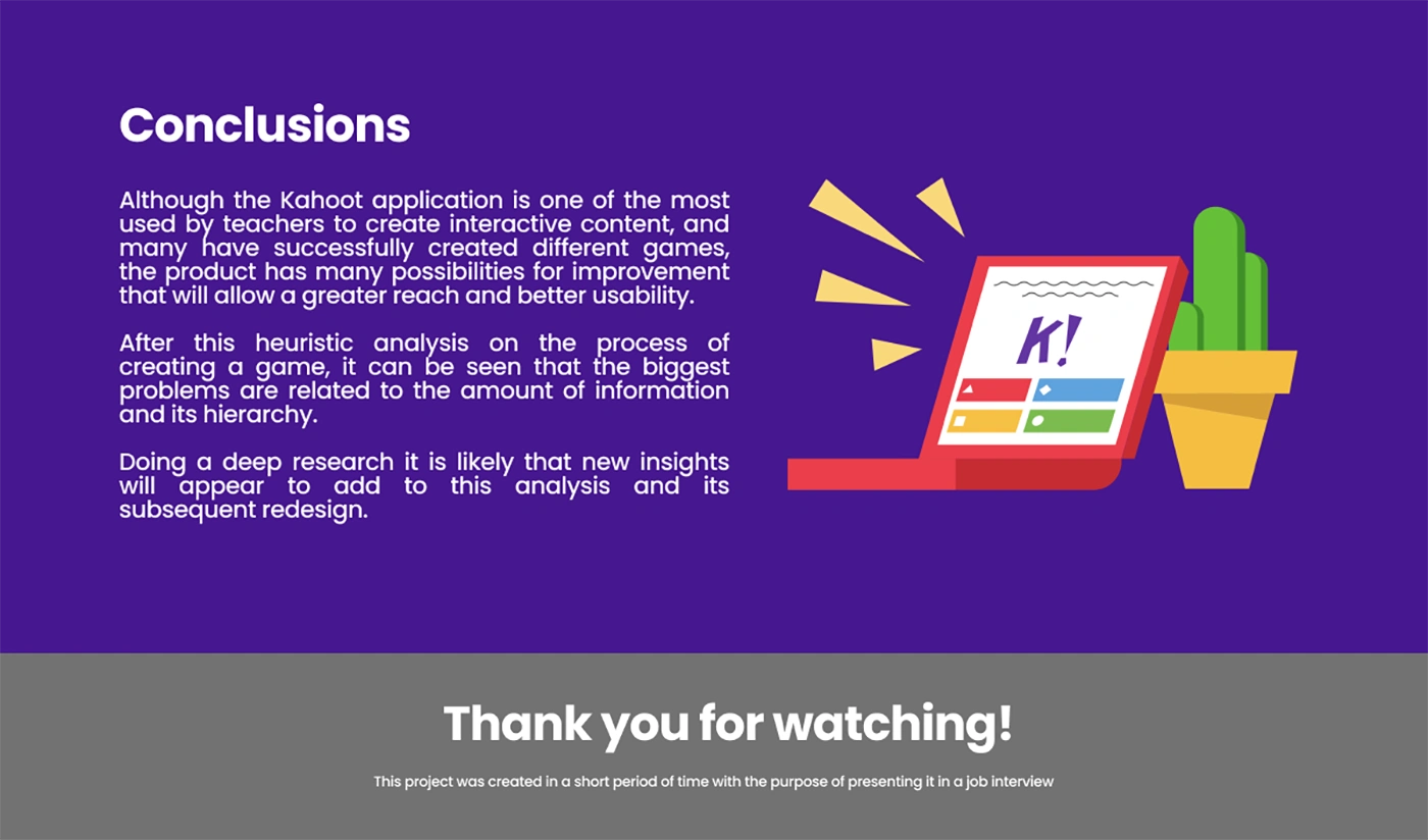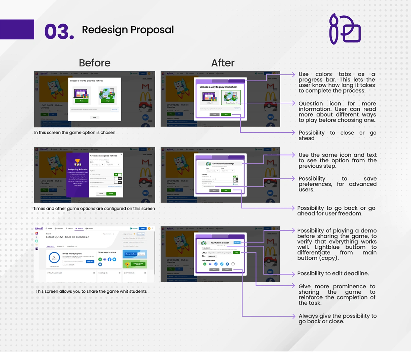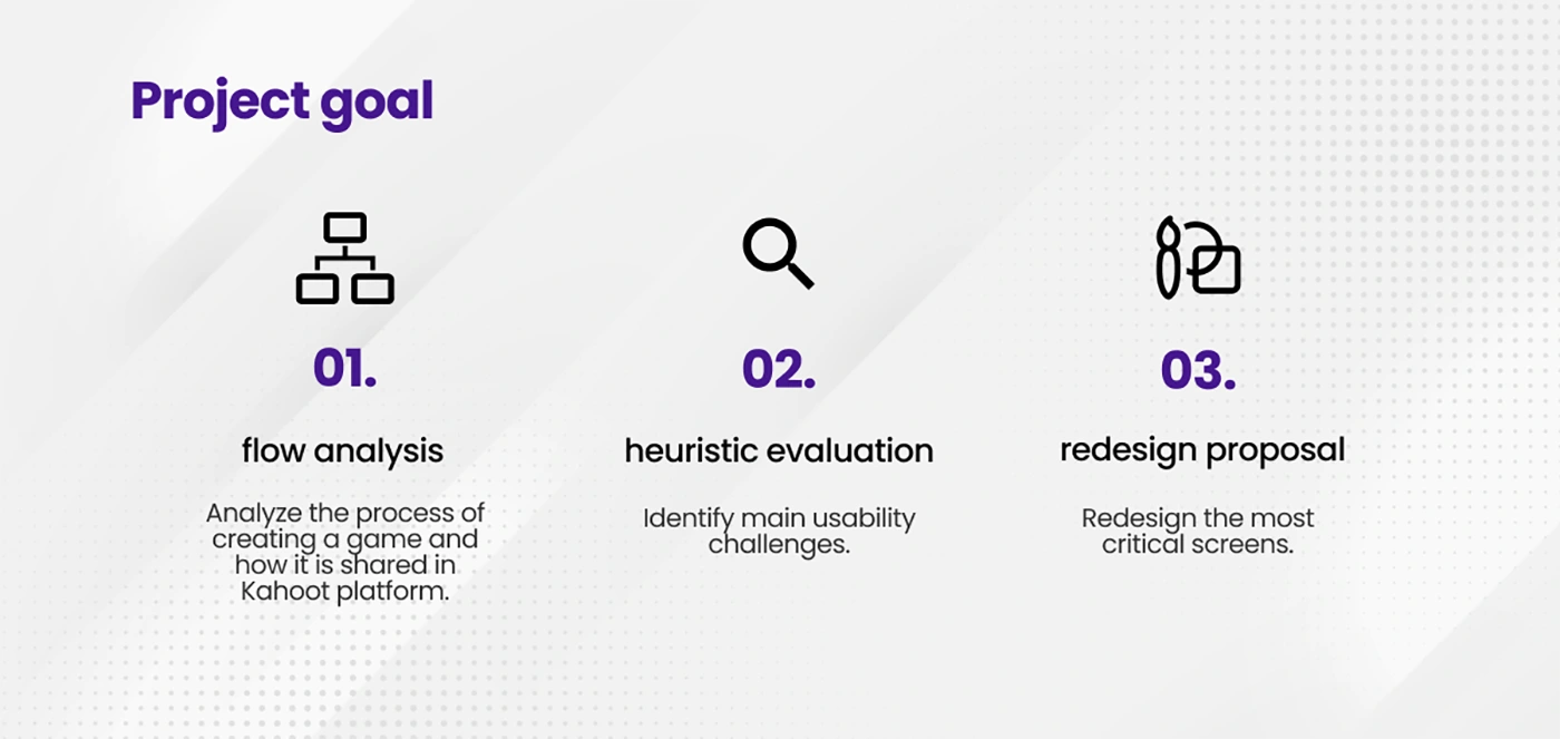 Heuristic analysis of Kahoot!’s user flow with key UX insights and improvement proposals to enhance usability and engagement in the learning experience.