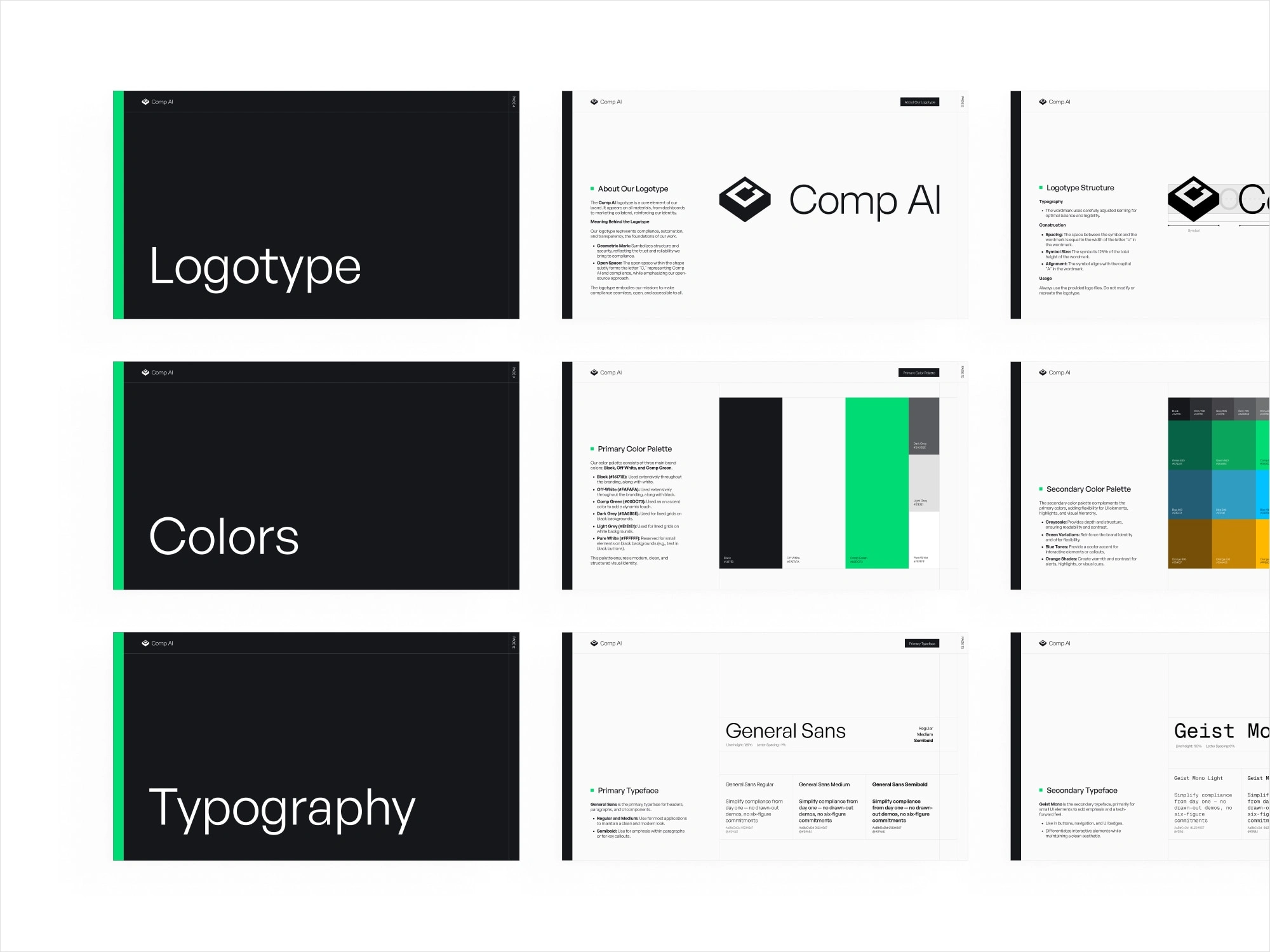 Comp AI needed an identity that signals reliability and clarity without feeling corporate or heavy. The system focuses on precision, structure, and restrained contrast, so the brand can sit naturally inside product UI, docs, and developer-facing surfaces.