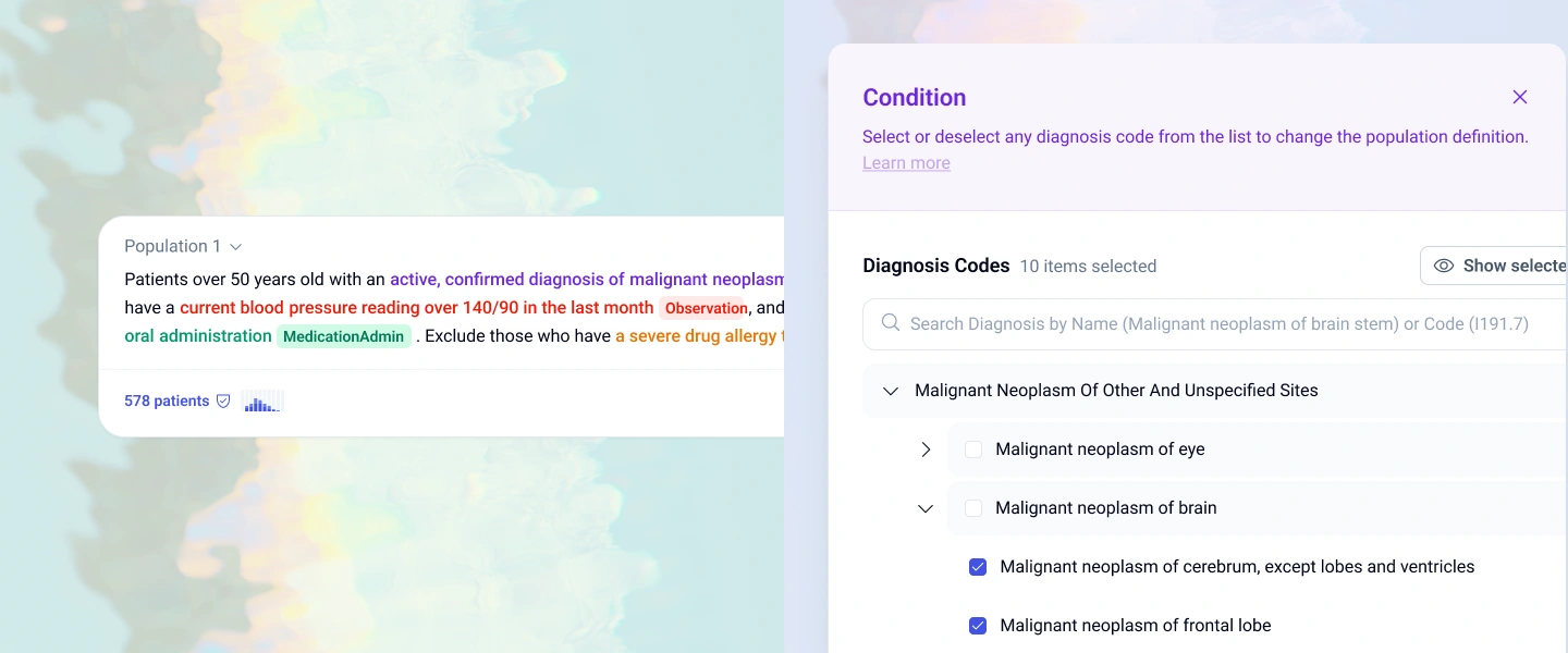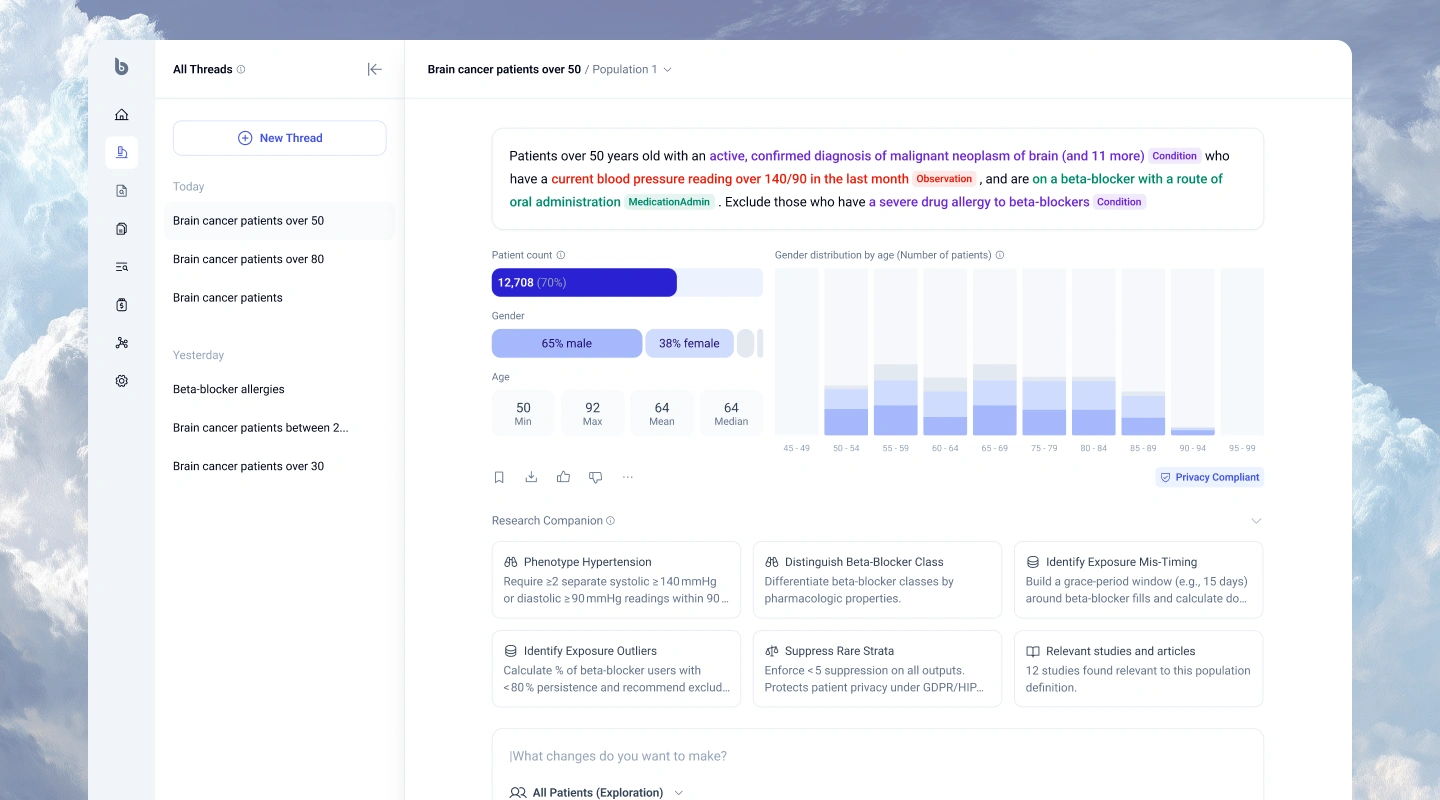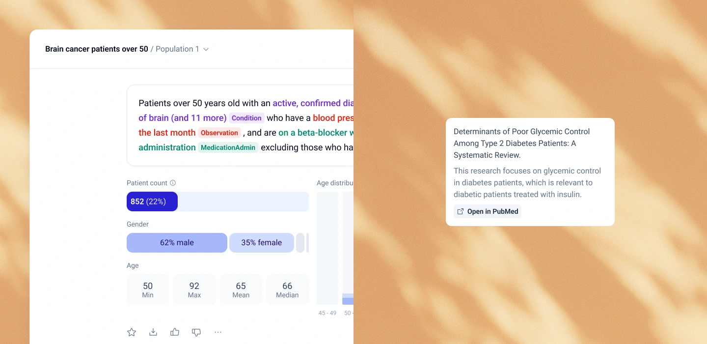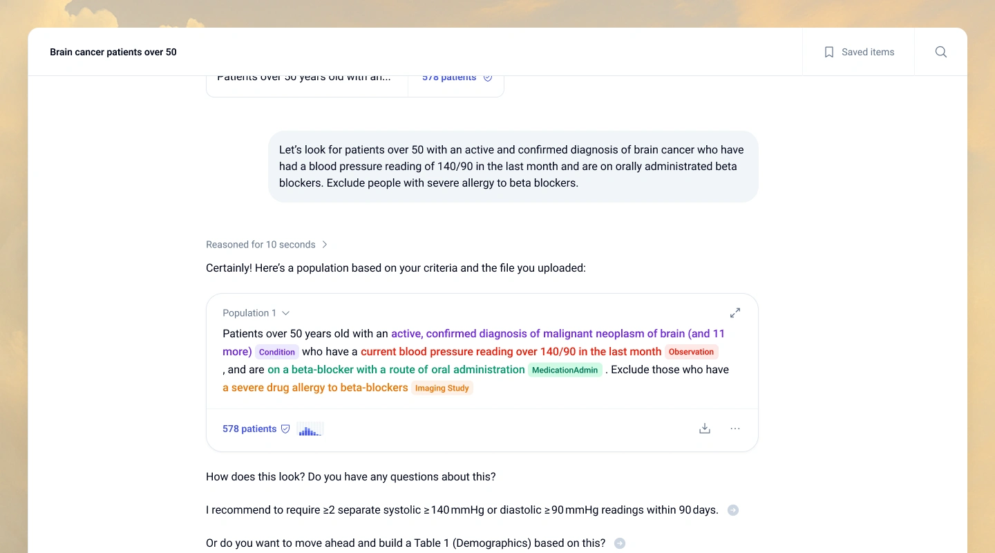 Building on that clean canvas, we introduced flexible, color-coded entity chips: Condition, Observation, Medication, and more, paired with instant KPIs for patient count, age, and gender. Every query adds to a running Populations History to retrace analytical steps, and contextual “Research Companion” cards surface AI-generated insights exactly where they're needed, without forcing users to jump between views.