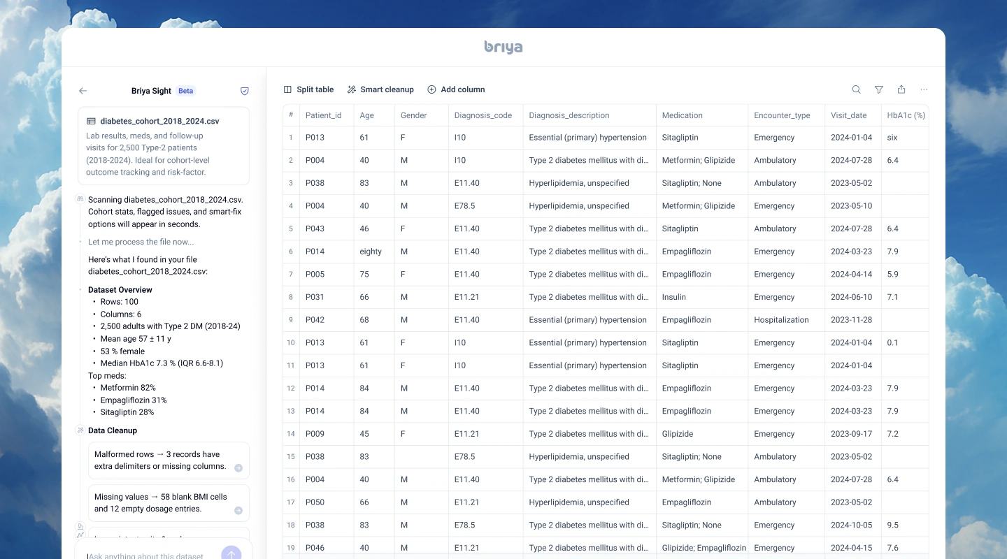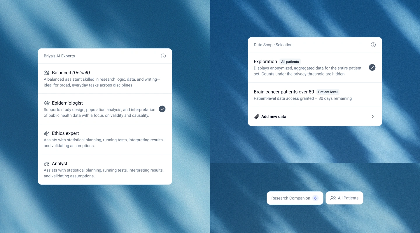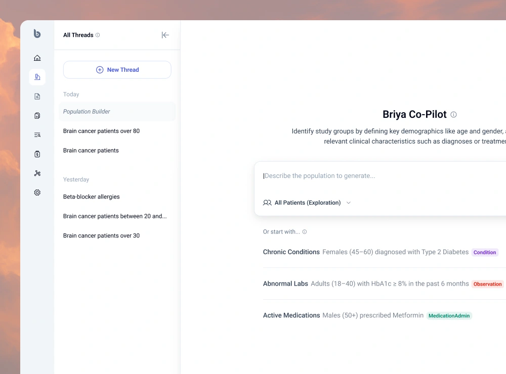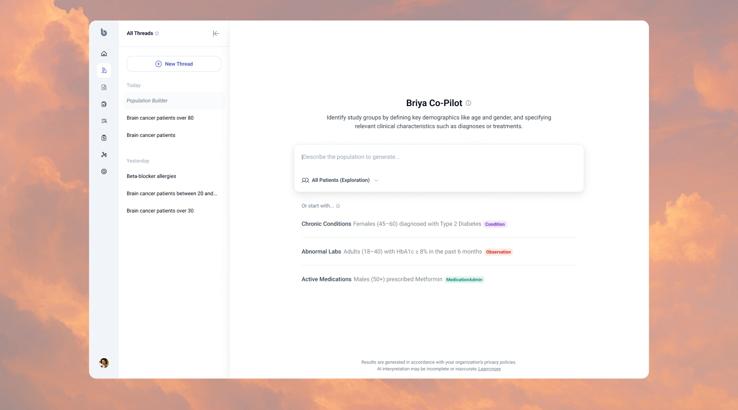 Building on that clean canvas, we introduced flexible, color-coded entity chips: Condition, Observation, Medication, and more, paired with instant KPIs for patient count, age, and gender. Every query adds to a running Populations History to retrace analytical steps, and contextual “Research Companion” cards surface AI-generated insights exactly where they're needed, without forcing users to jump between views.