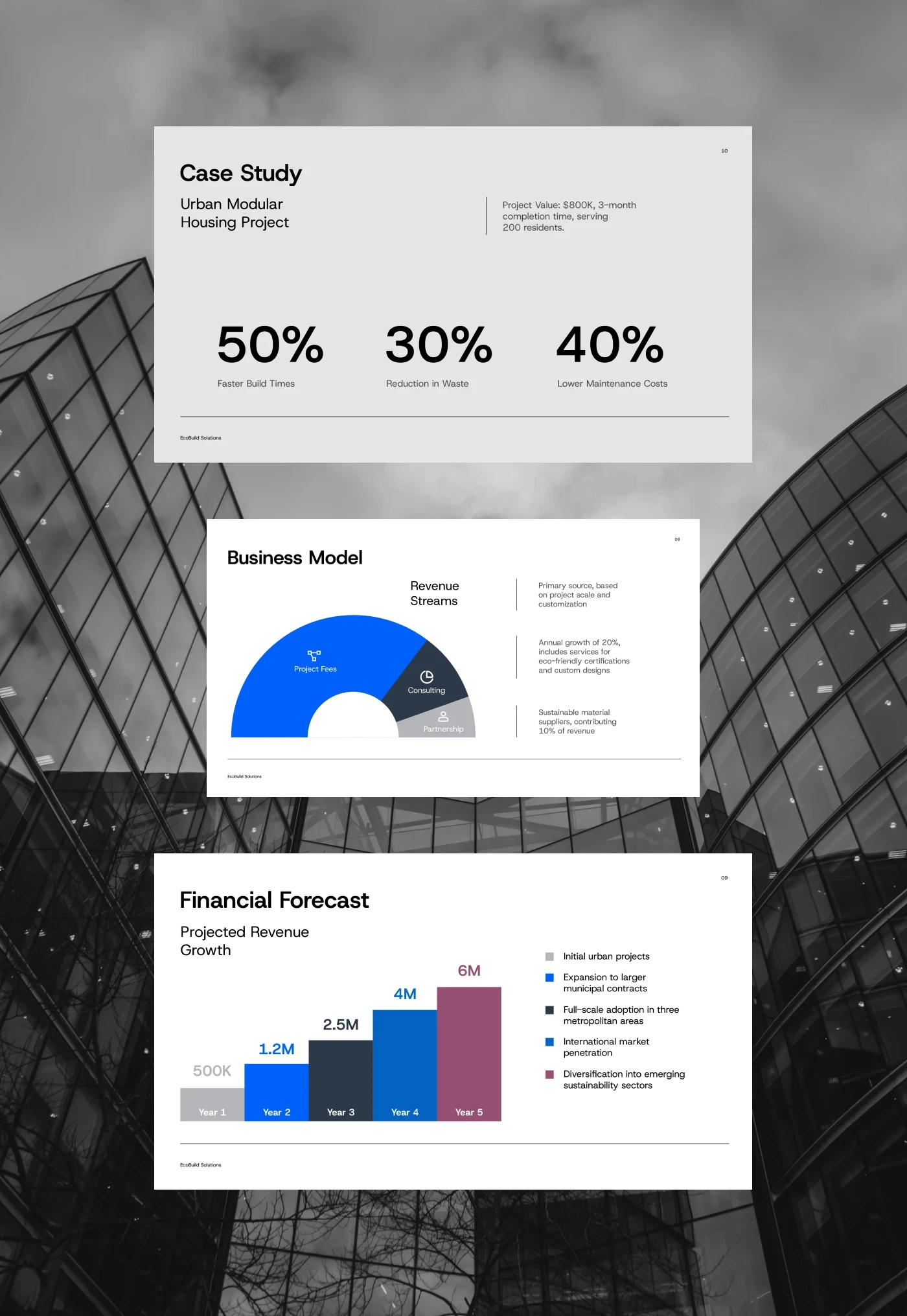 EcoBuild Solutions is an architectural firm dedicated to designing sustainable and adaptive buildings that transform urban environments. Guided by the belief that the future of urban living must be both sustainable and flexible, we create scalable, environmentally responsible designs that promote smart growth, community development, and thriving cities for generations to come.