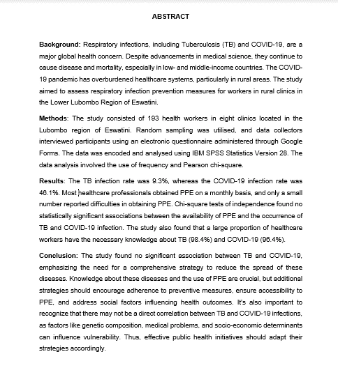 It was a research project for my South African Client. It is a research project on the respiratory infection rates among healthcare workers. Research design was quantitative and strategy was correlational. I am uploading a image of abstract for reference.