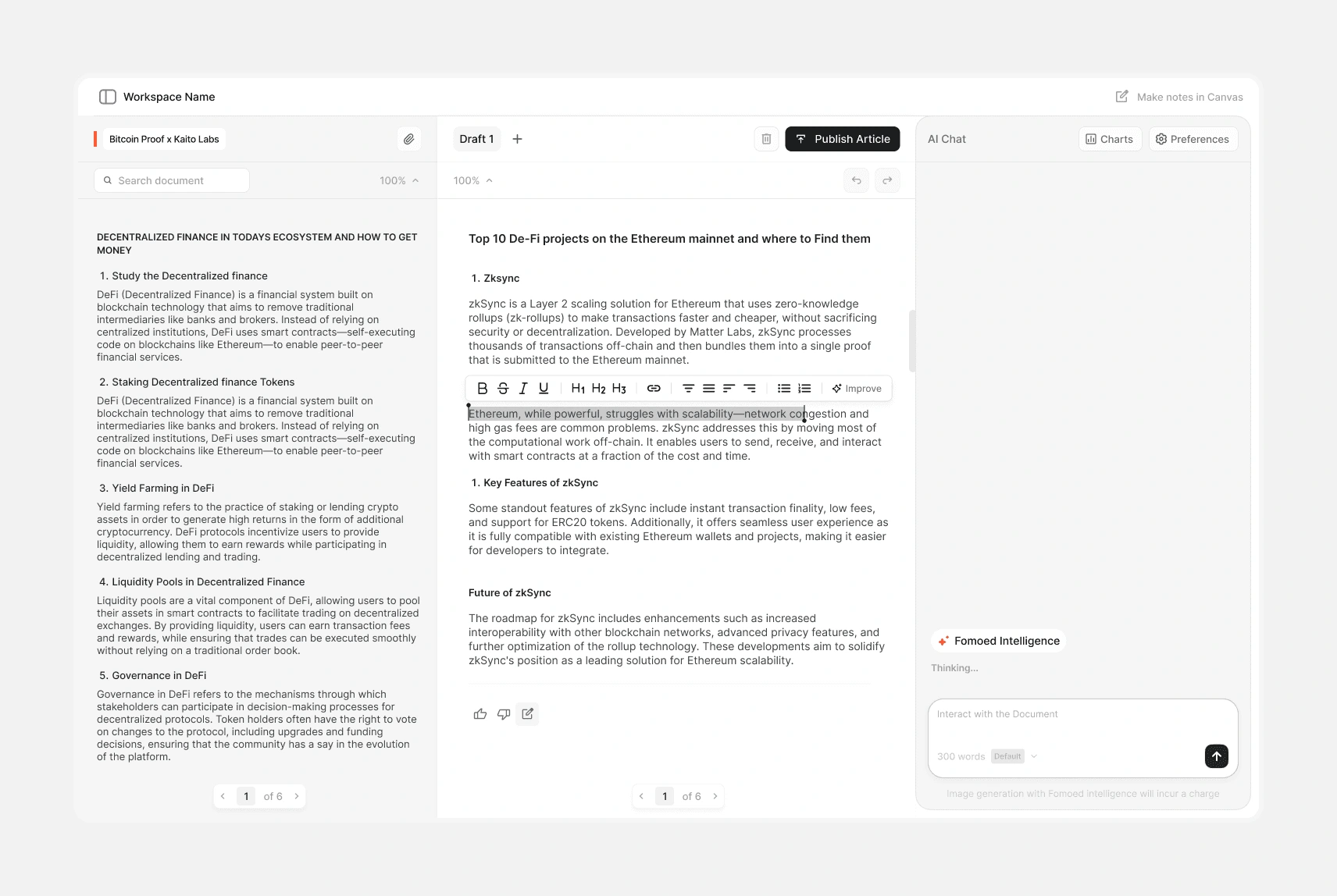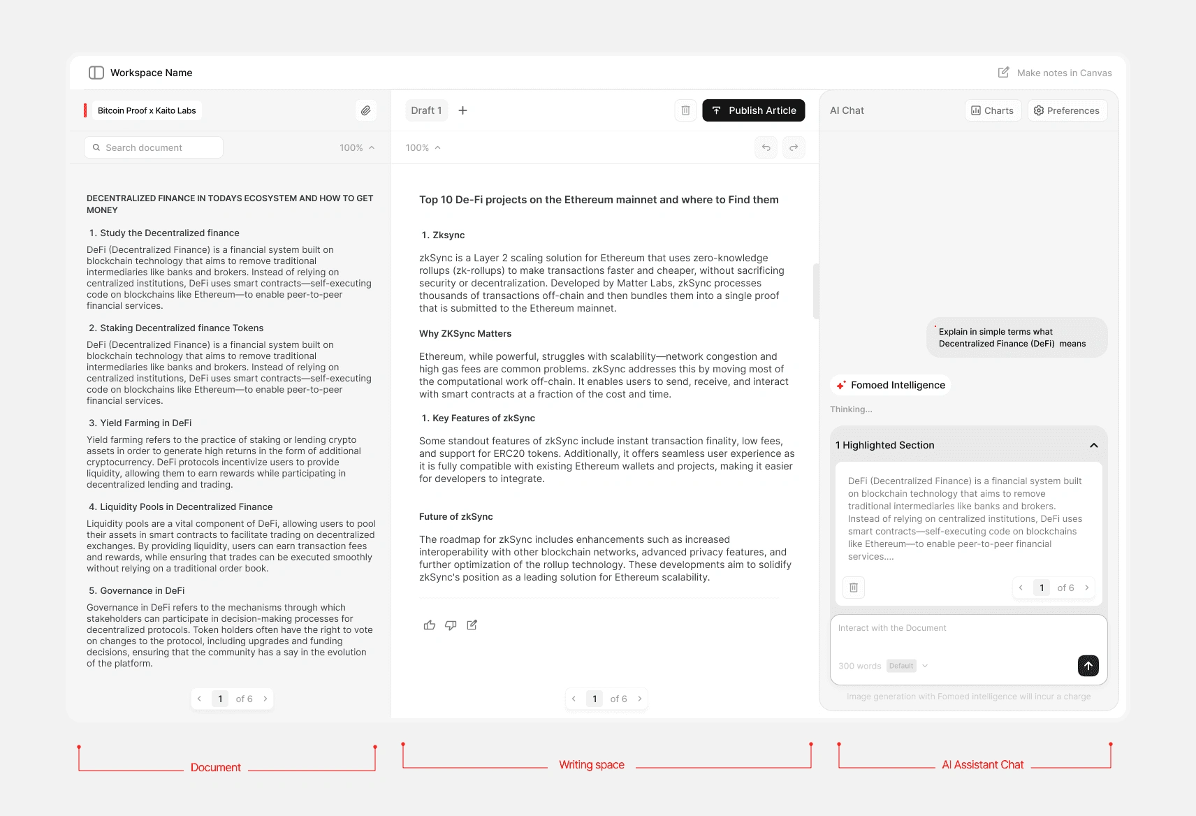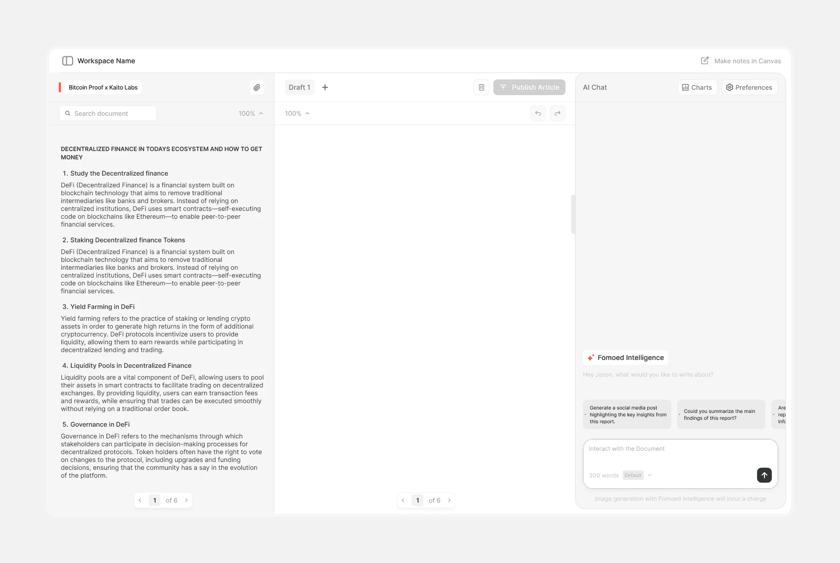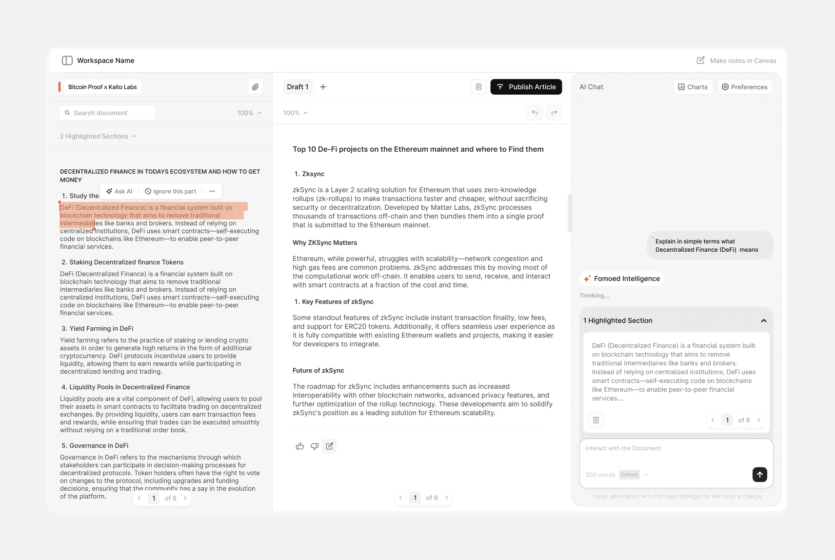 The AI Canvas was introduced as a dedicated solution to these challenges. It allows KOLs to upload campaign documents directly into the workspace, where the system can intelligently parse and make them referenceable. Through a simple prompt interface, KOLs can instruct the AI to generate content based on these documents whether it’s a long-form article, a simplified summary, or a social media thread. The Canvas returns structured, editable rich text that the KOL can format to their voice and style. More importantly, the AI Canvas includes tools for embedding CTAs within the content, with every link carrying pre-configured tracking IDs for both the campaign and the KOL. This ensures that any engagement driven by the content, be it off-chain clicks or on-chain actions it is automatically logged and attributed. Once finalized, content can be saved, versioned, and submitted for campaign approval, all within the same interface.