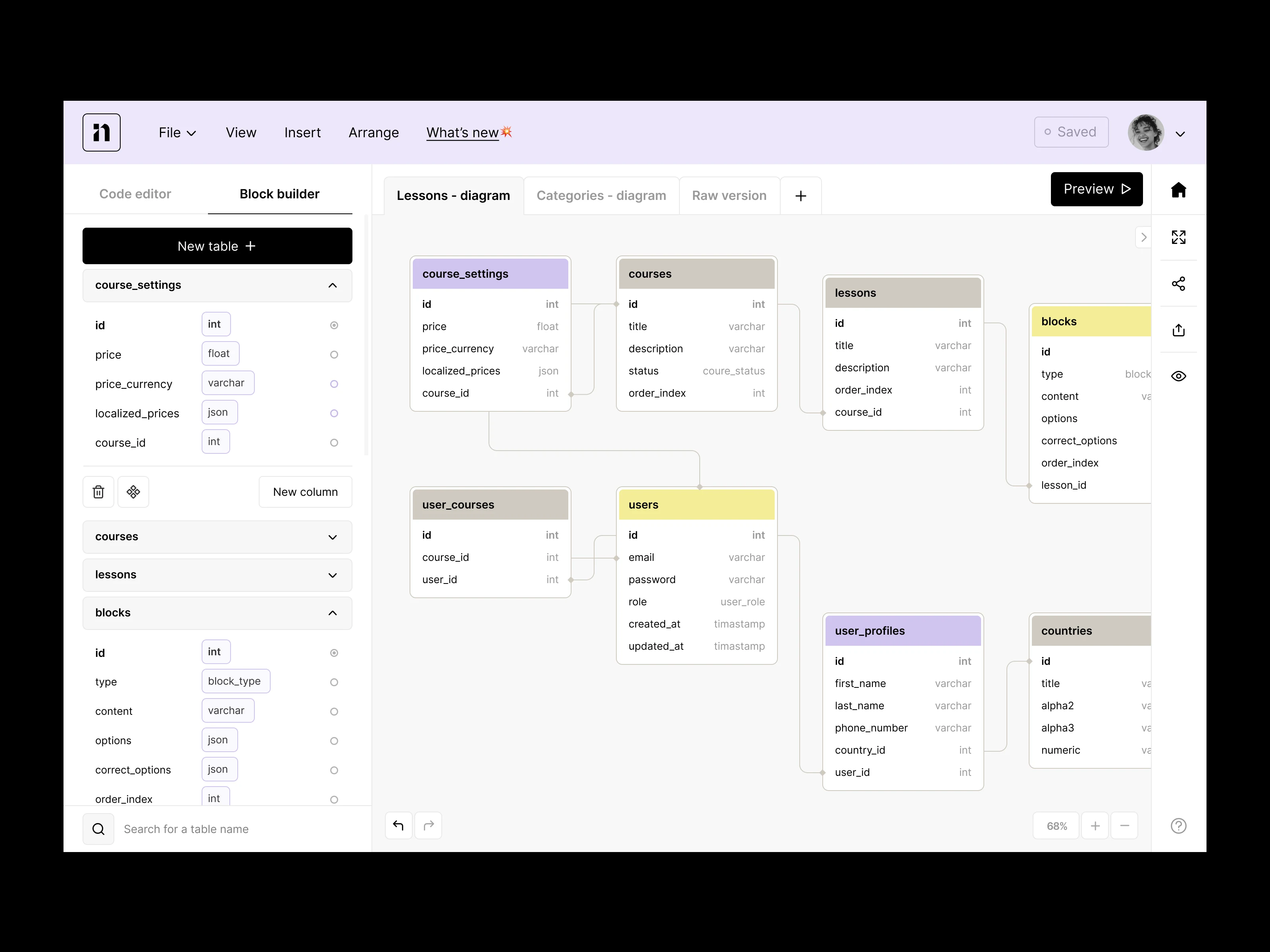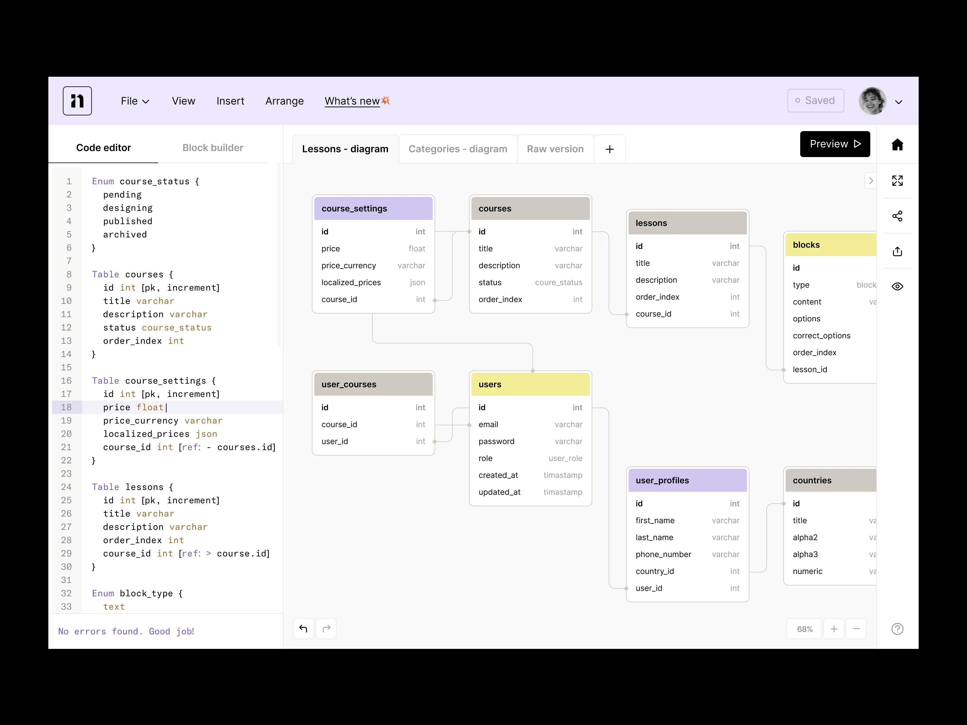 Database visual editor: web app, dashboard