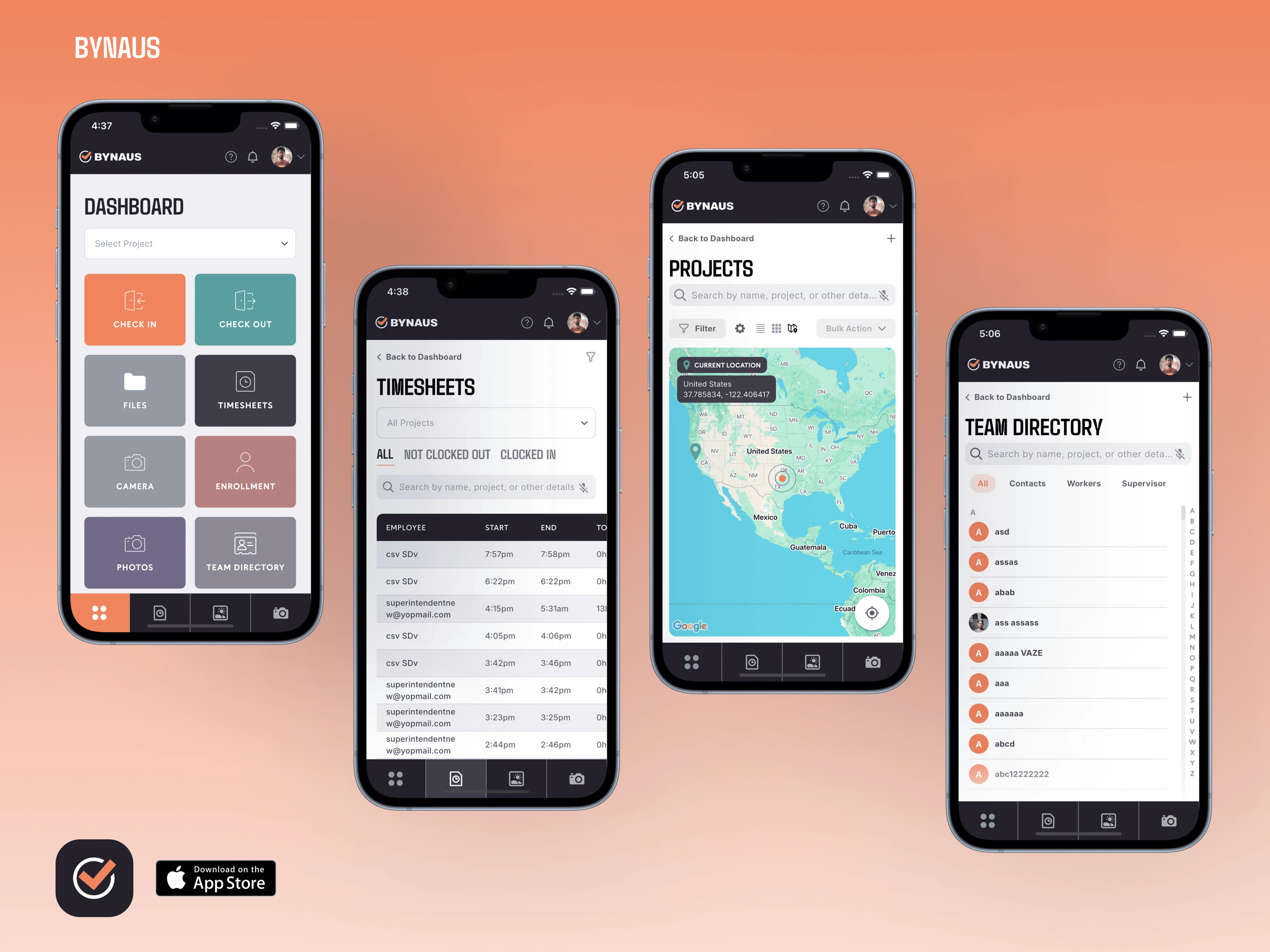 Bynaus is a construction workforce app with facial recognition, geofencing, and photo documentation to boost productivity, security, and accountability.