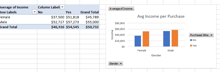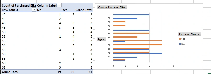 These images show summaries of data related to bike purchases analyzed based on commute distance and age.