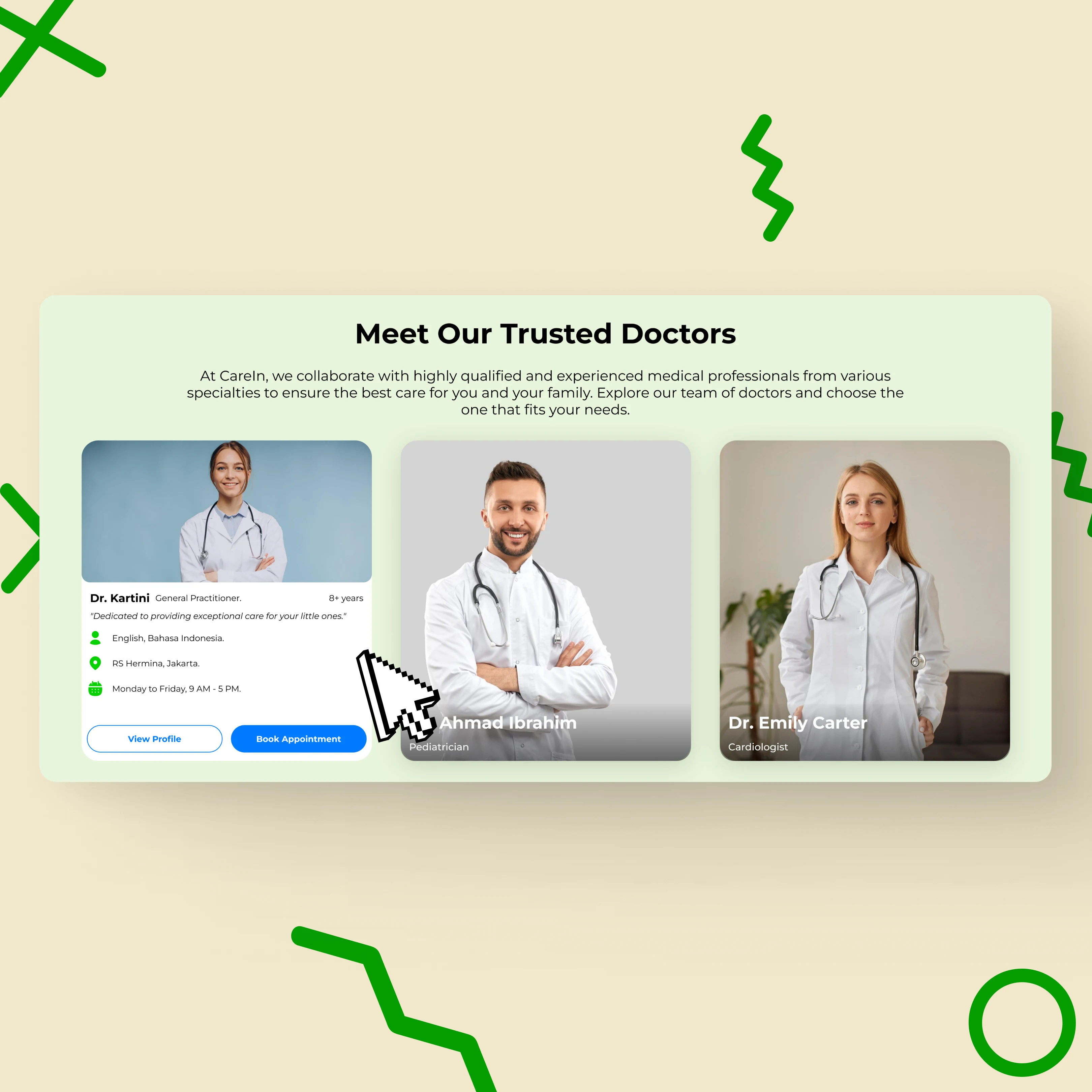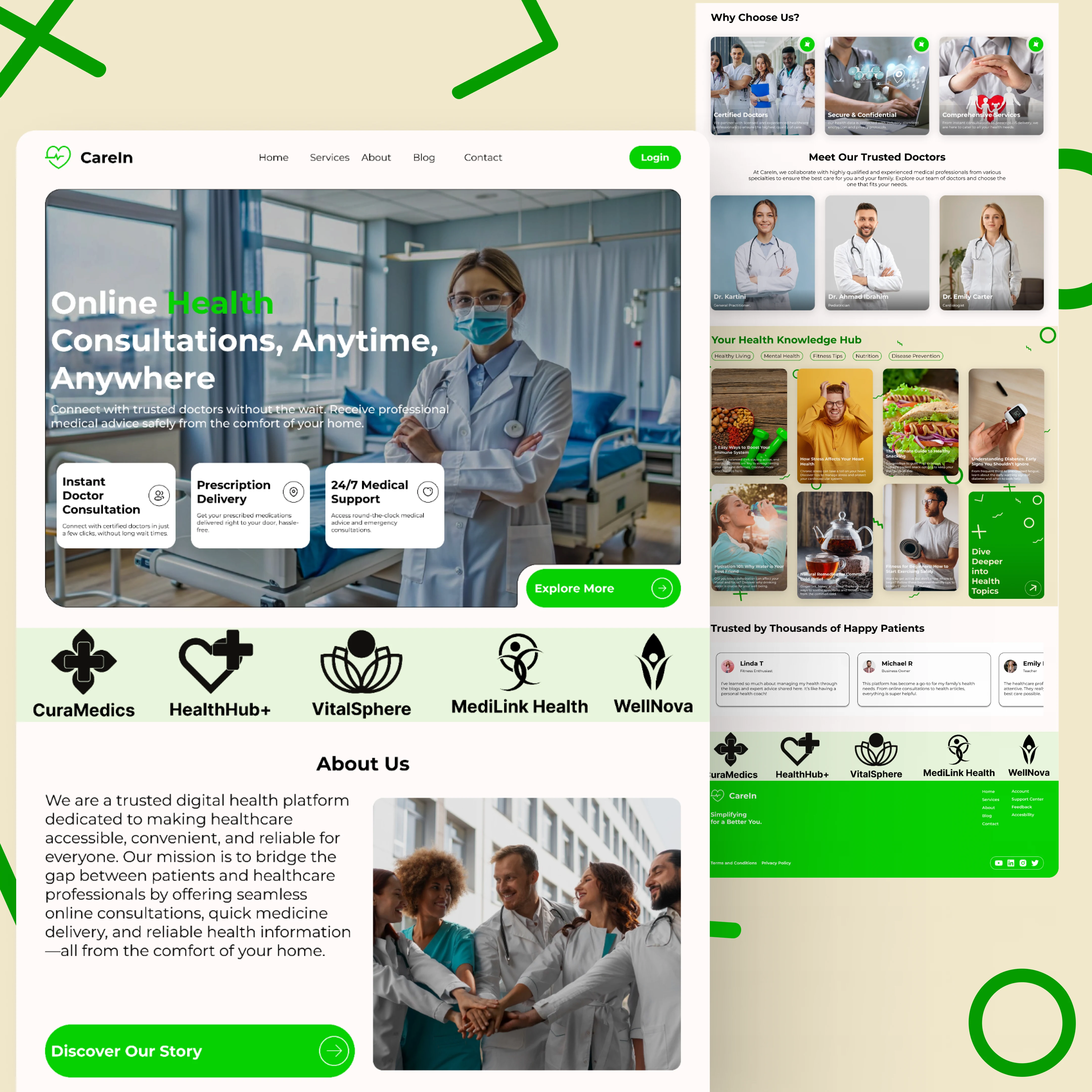 Hero Section: A welcoming layout that highlights the essence of CareIn and its mission to connect users with trusted healthcare.