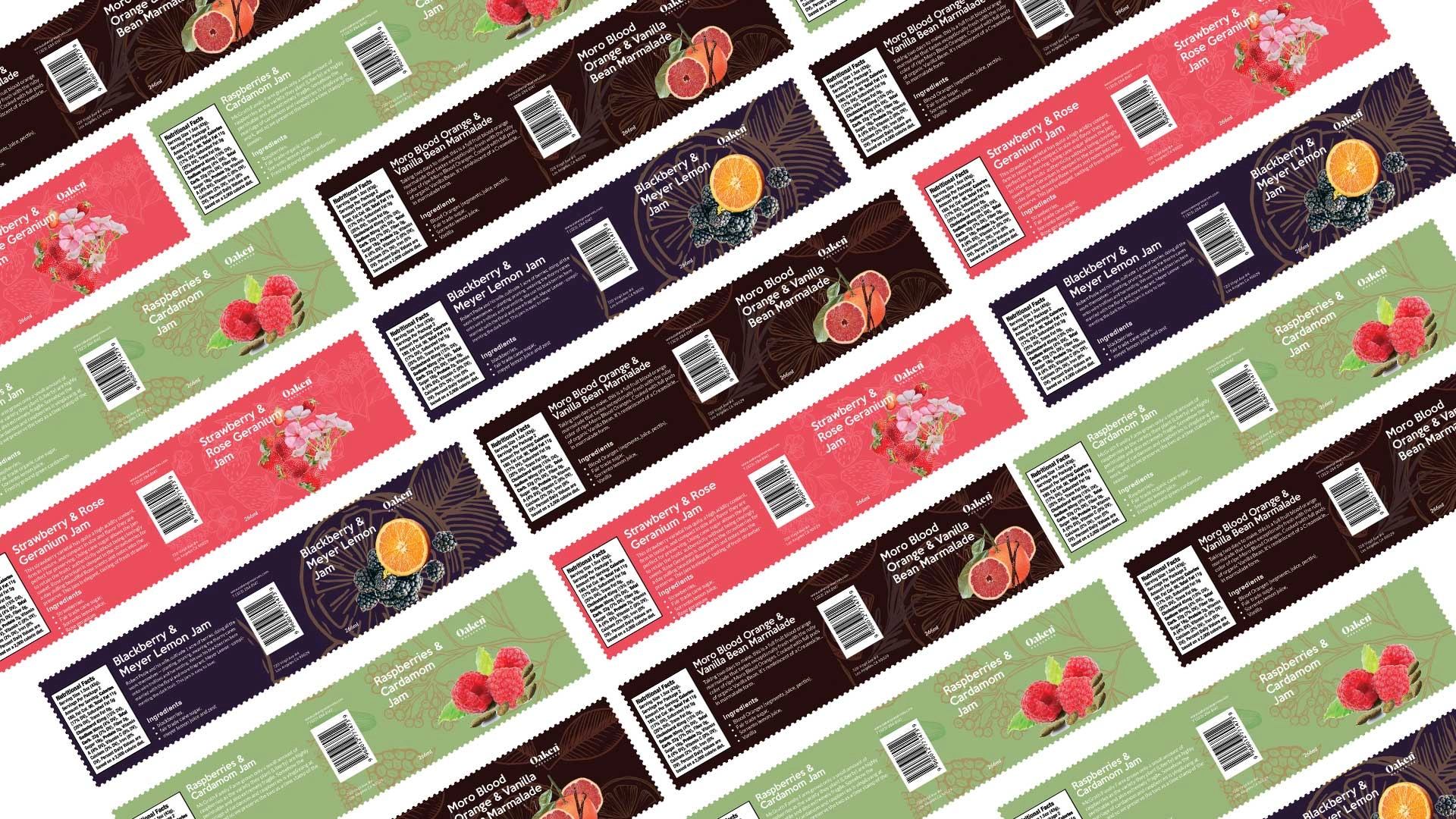 The client requested a bold and cohesive presence across their jam product line, so the designer focused on creating a unified design through consistent colour schemes and spatial arrangements. They created a wave-inspired pattern to capture customers' attention and create a sense of continuity between the different jam varieties. Additionally, they included a clean and modern typography style to enhance the visual appeal of the packaging and communicate the brand's commitment to quality. By using a legible and concise font, the product information and key features would be easily digestible for customers, providing an effortless and enjoyable experience while browsing Oaken Preserves jam products.