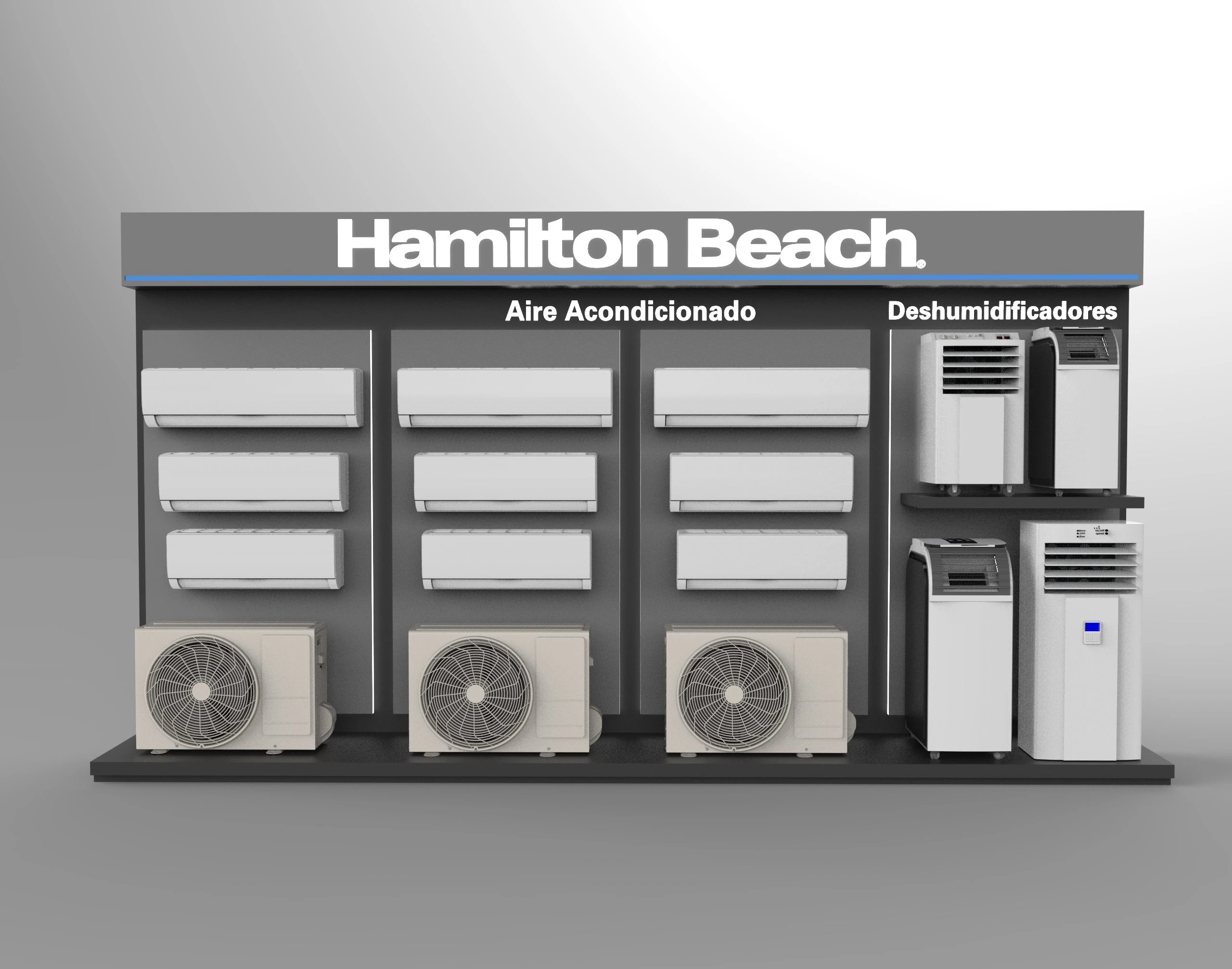 Designed full display system for Hamilton Beach HVAC & appliances. 3D planning, KeyShot/SketchUp renders, specs and detailing—executed showroom in Panama City.
