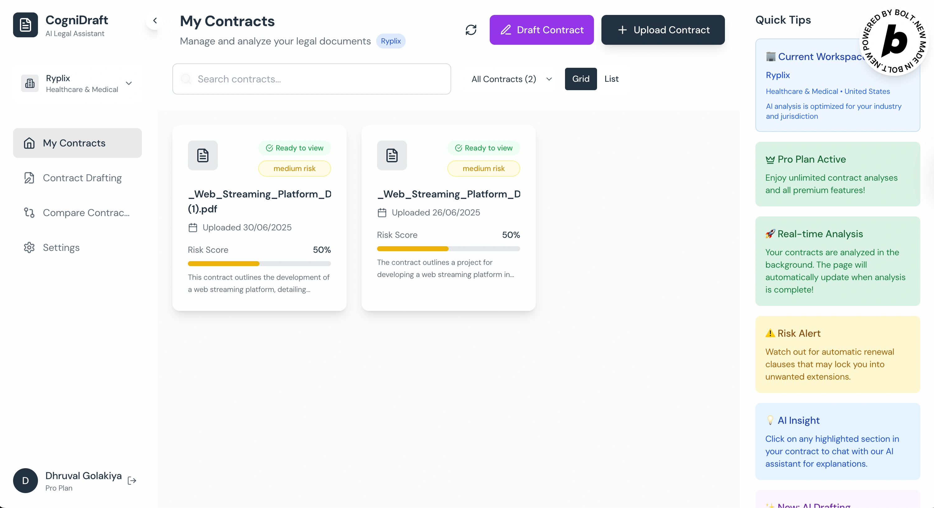 Real-time Responsiveness: The implementation of real-time updates for contract analysis and streaming AI responses for drafting and chat significantly enhances the user experience, making the application feel dynamic and responsive.