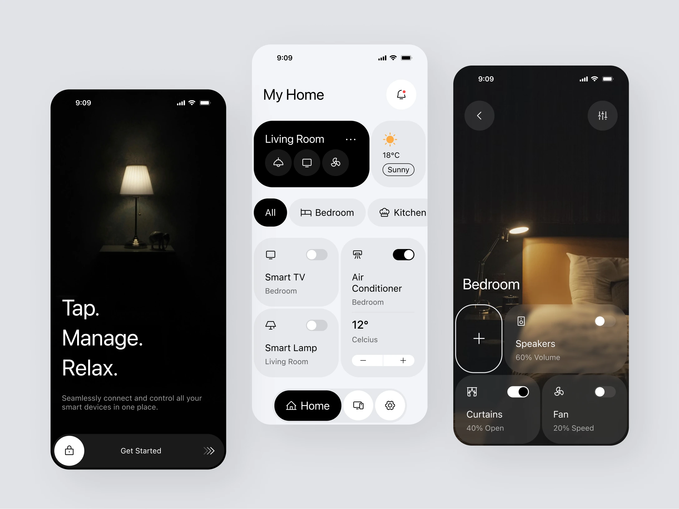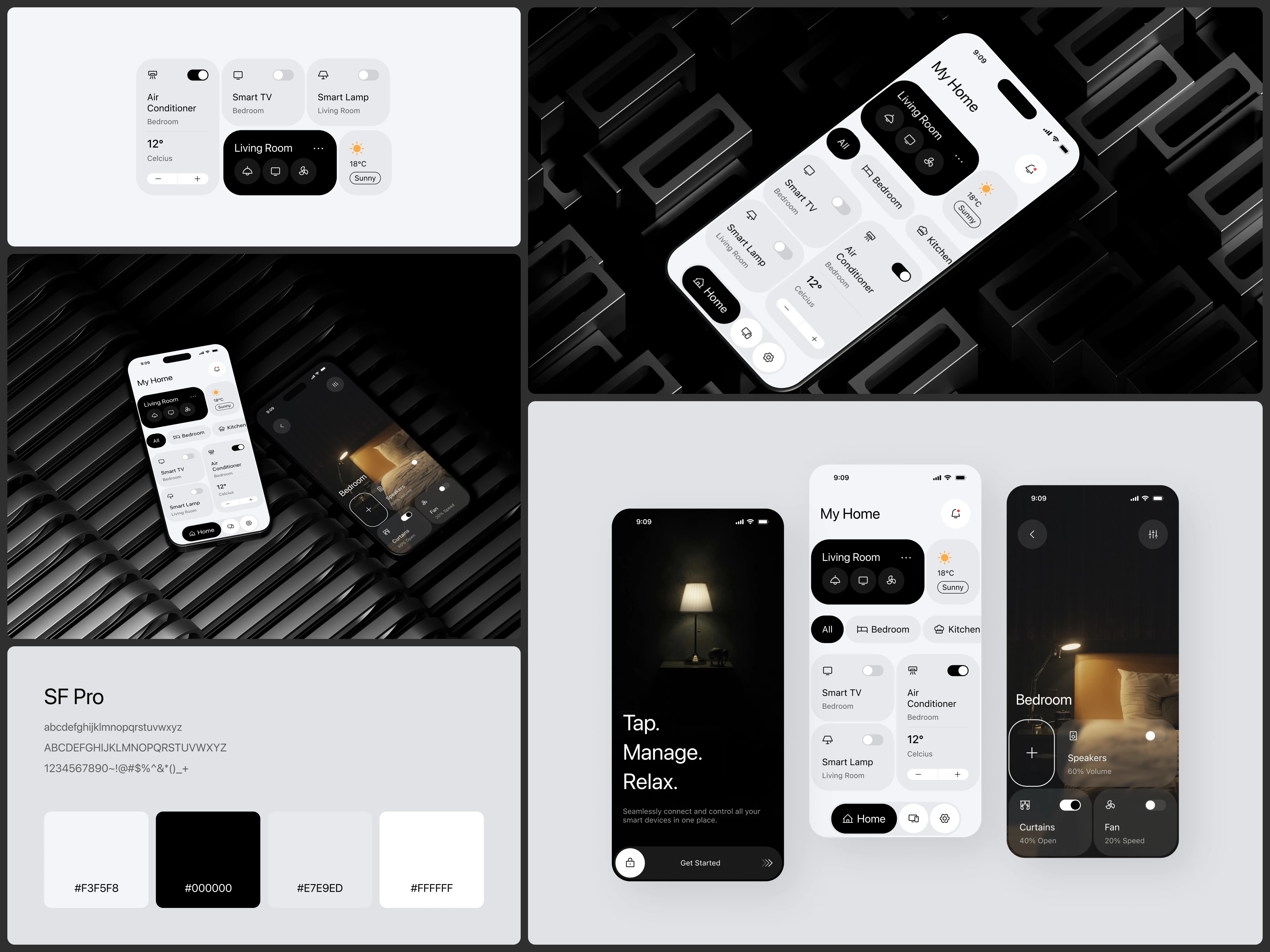 A sleek smart home app concept designed for effortless control of your living space. Manage lights, speakers, temperature, and more. All from one intuitive interface. Minimal design, smooth interactions, and a cozy atmosphere to make home automation feel personal.