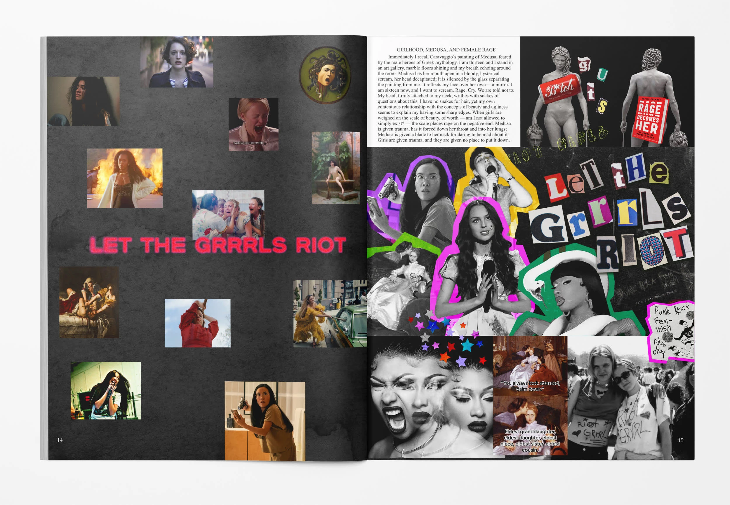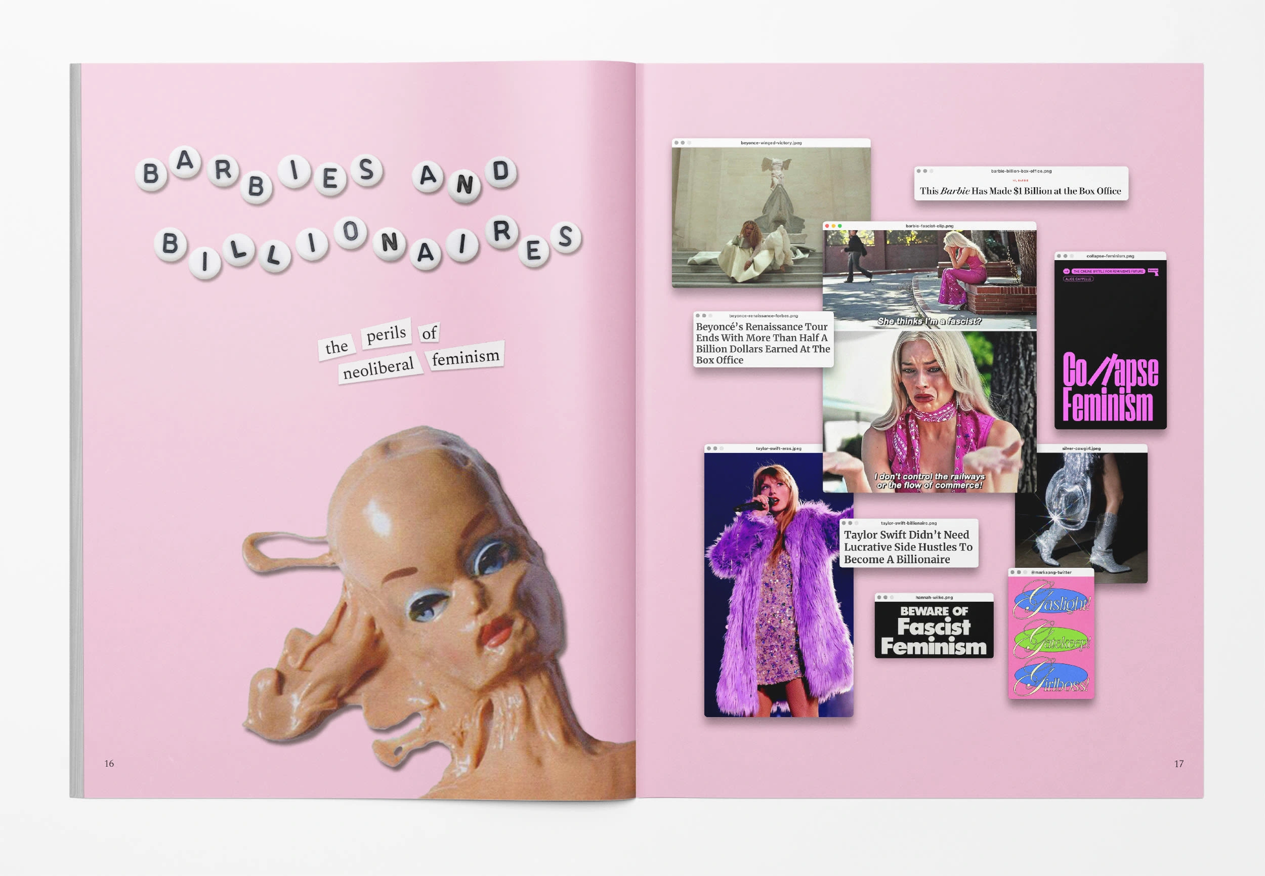 My undergraduate thesis "2023: Year of Girlhood" is a reflection on the girl trends of 2023 and related socio-political events surrounding gender. The project consists of four essays in an interactive website, a live installation at the Redline Contemporary Art Center (April-May 2024), and a printed booklet.