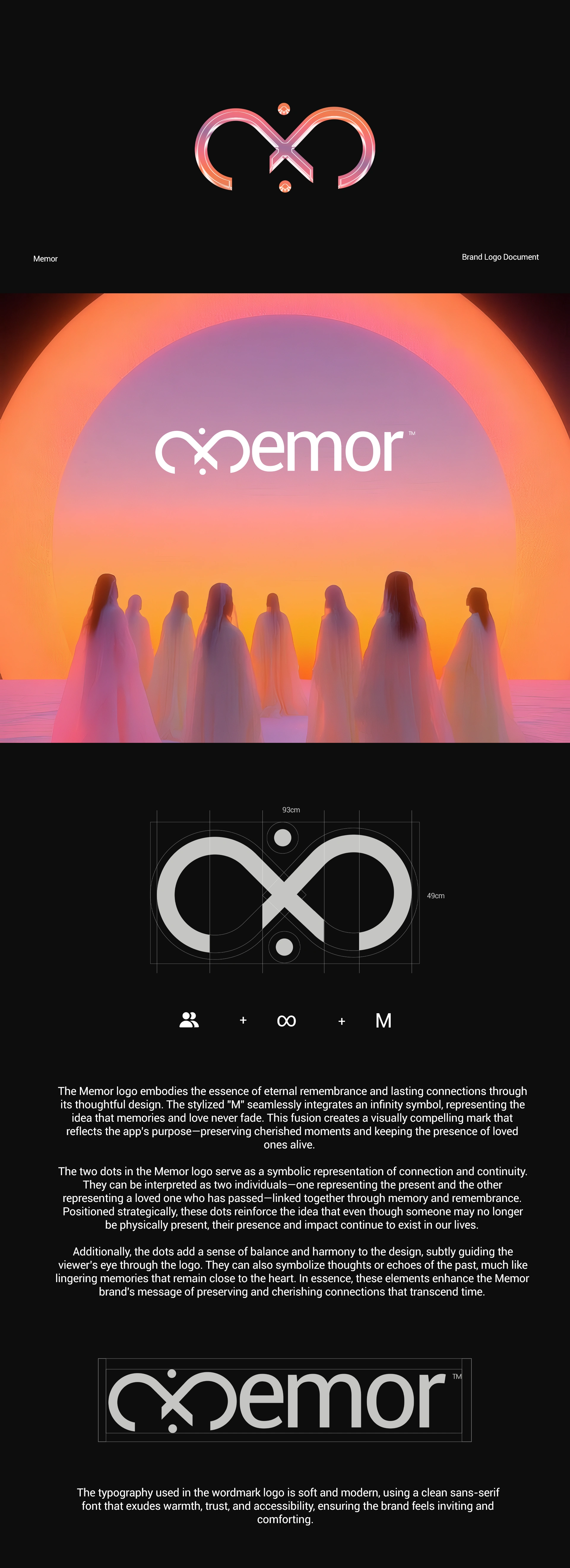 The name Memor is derived from the word "memory," and reflects a commitment to honoring the past in a modern, accessible format. The design philosophy behind the brand centers on simplicity, empathy, and emotional clarity. Everything from the user interface to the logo—featuring a stylized “M” merged with an infinity symbol—speaks to the brand’s message of everlasting connection. Colors like deep blue and soft gold are used to convey trust, calm, and timelessness, ensuring every interaction with the platform feels safe, warm, and intentional.