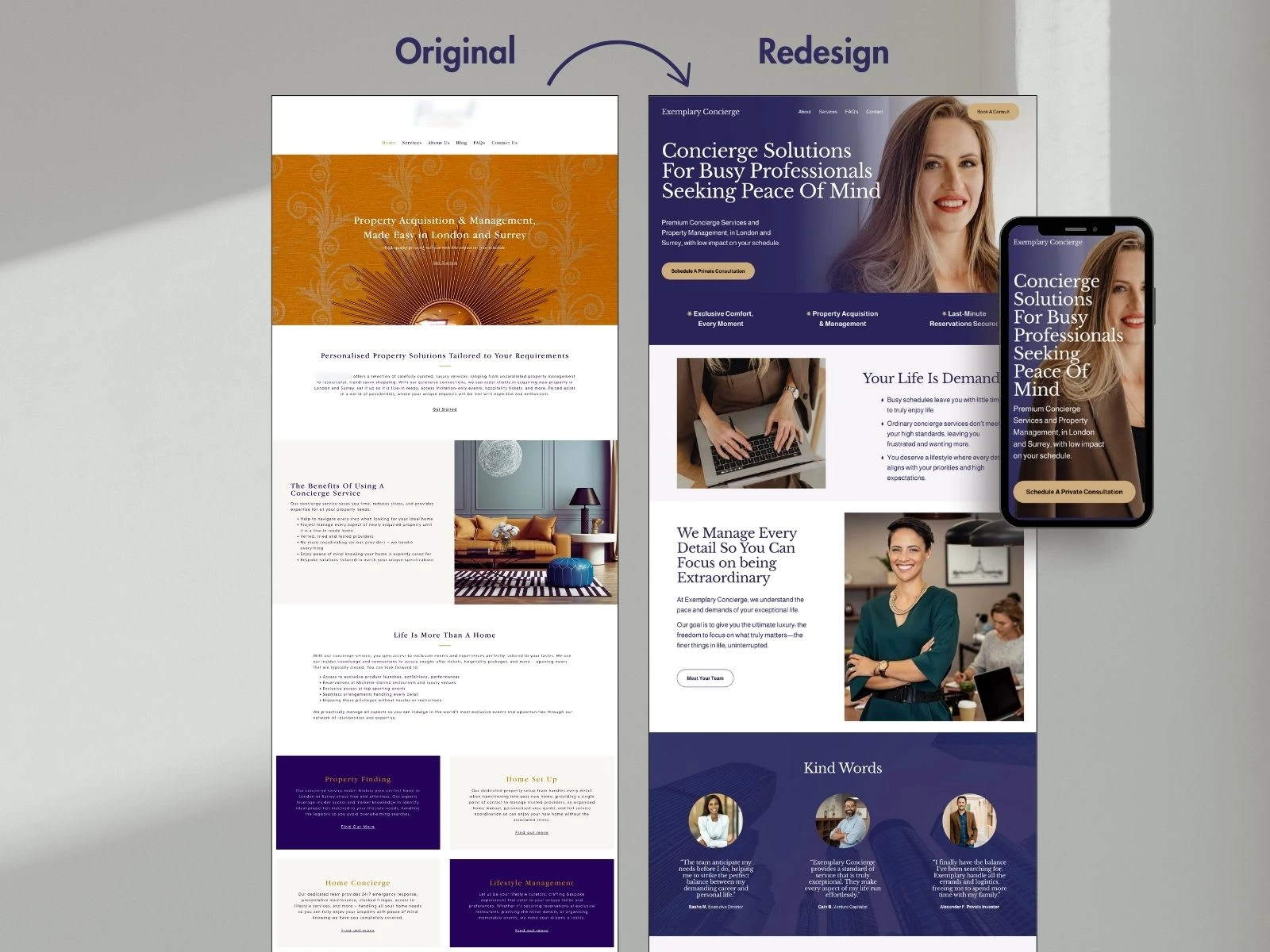 The redesign makes high-net-worth clients the hero, positions the concierge as the Guide, & uses a clear 3-step plan with strong calls to action for engagement.