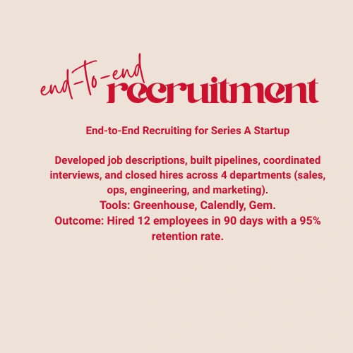 Developed job descriptions, built pipelines, coordinated interviews, and hired across 4 departments Hired 12 employees in 90 days with a 95% retention rate.