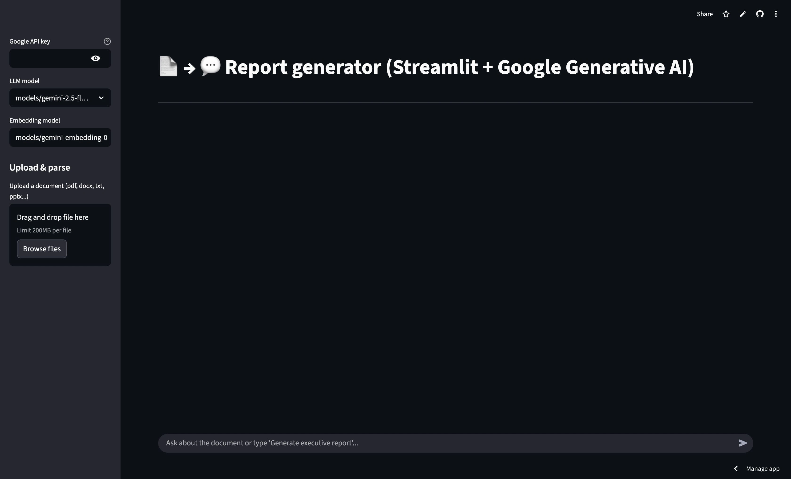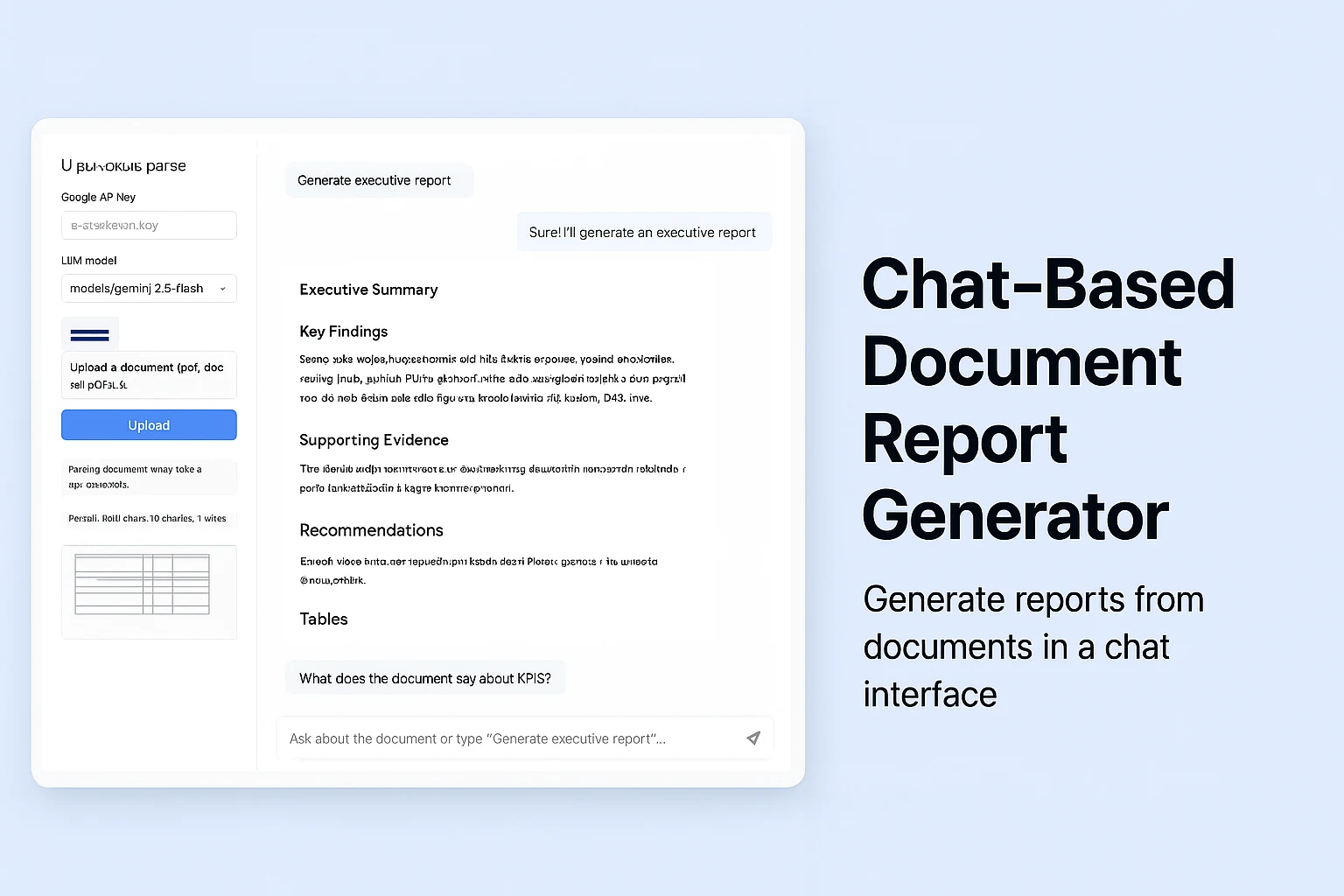 A chat-based Document Report Generator that lets users upload PDFs, Word docs, Excel files, or slides and instantly turn them into structured executive reports.