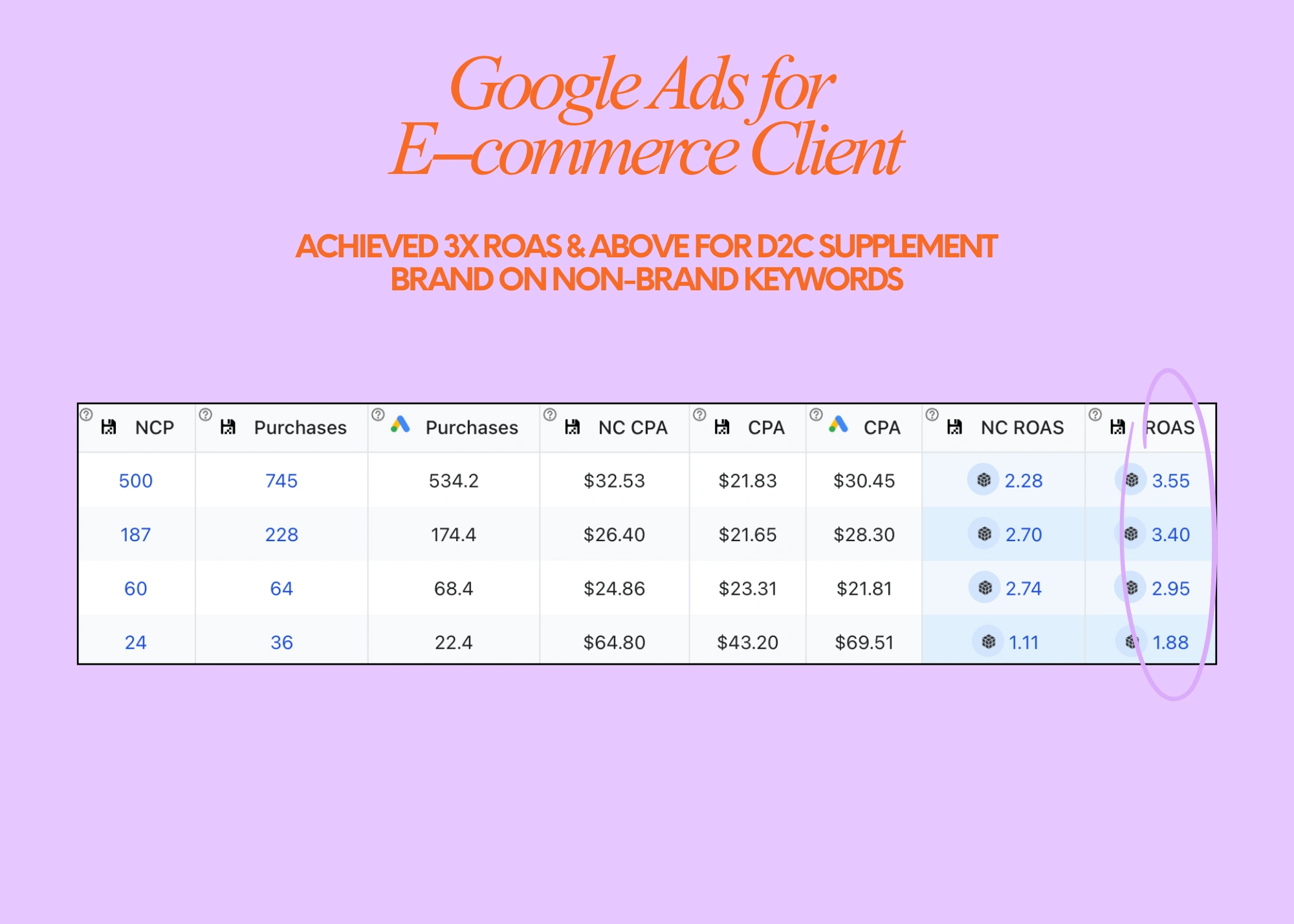 Audited & rebuilt Google ads account with new structure, campaigns, keywords & more. Now driving 9% CVR, $41K revenue, $2.8 ROAS and up to $3.5 ROAS in 90 days.