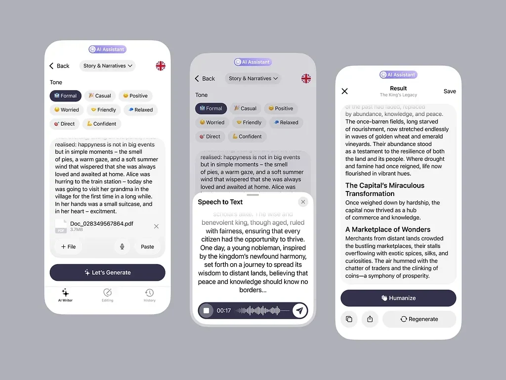 The iterative design approach shows in our prominent action buttons, real-time text processing, and smart regeneration options. Our goal was to make AI editing feel like having a writing mentor rather than just a tool, and this educational framework naturally guides users toward better writing while maintaining their authentic voice throughout the revision process.
