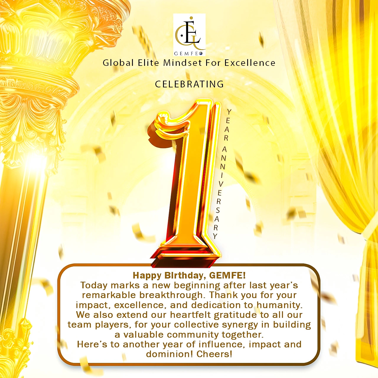 This vibrant flyer design commemorates the first anniversary of Global Elite Mindset For Excellence (GEMFE)