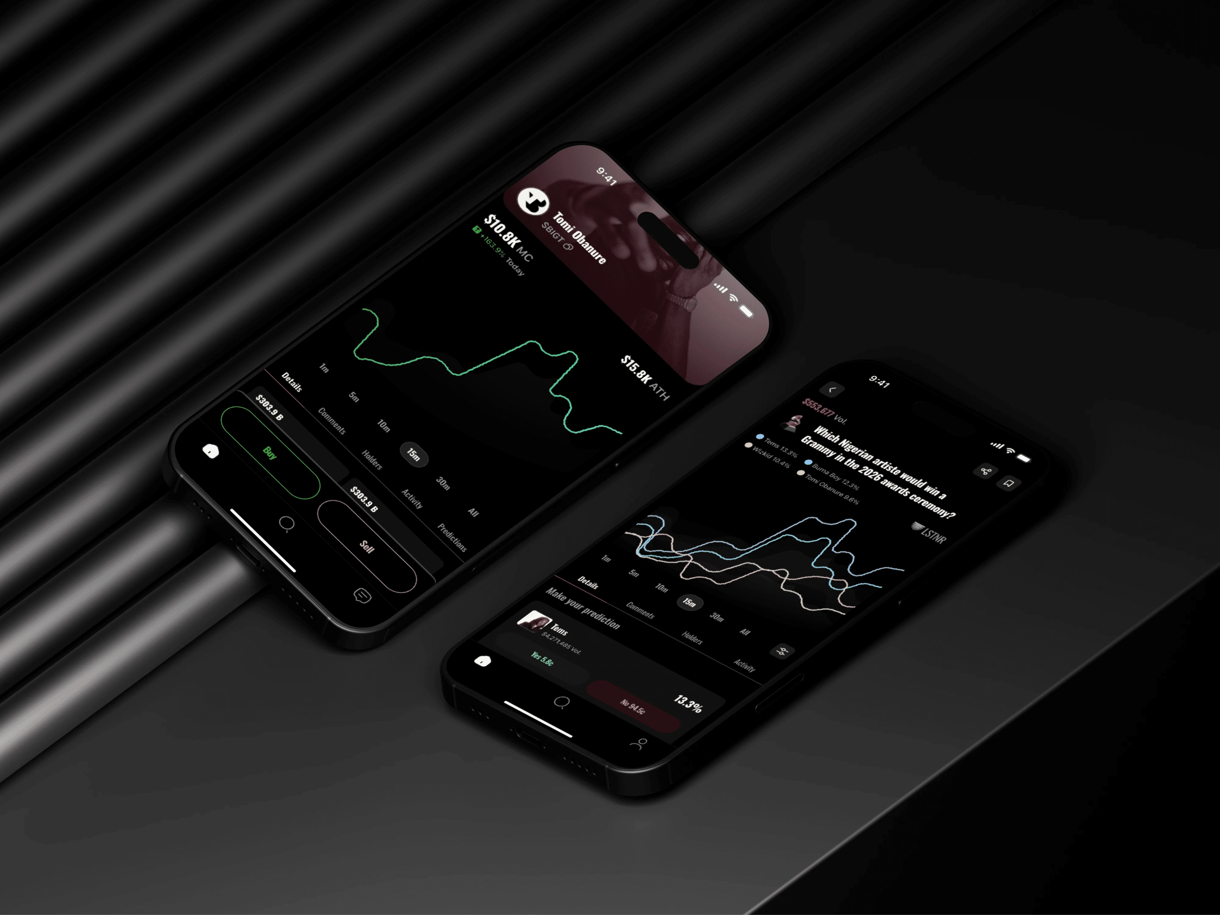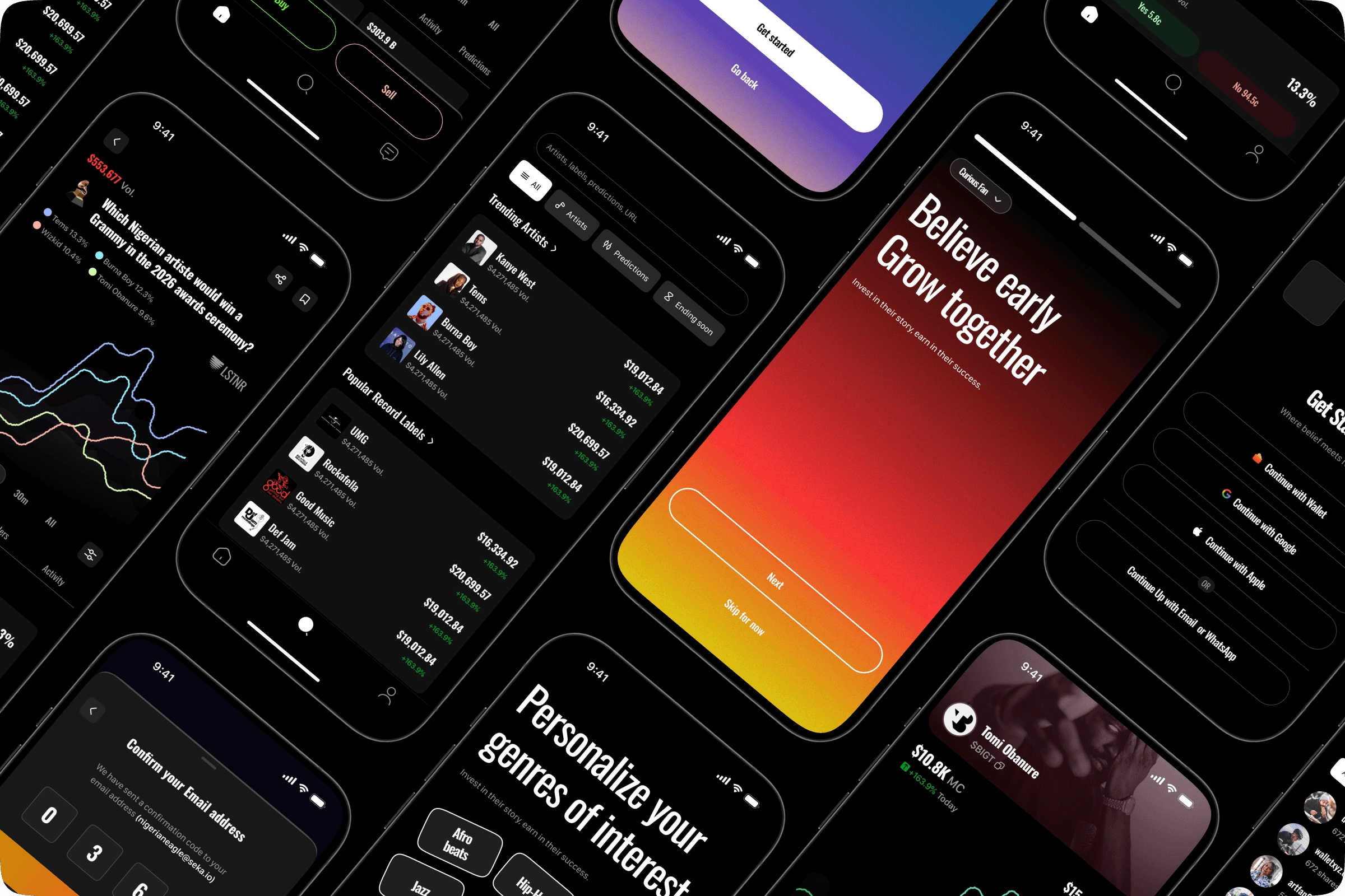 A prediction market app that allows fans to invest in artists' careers by trading shares and betting on streaming milestones and success metrics.