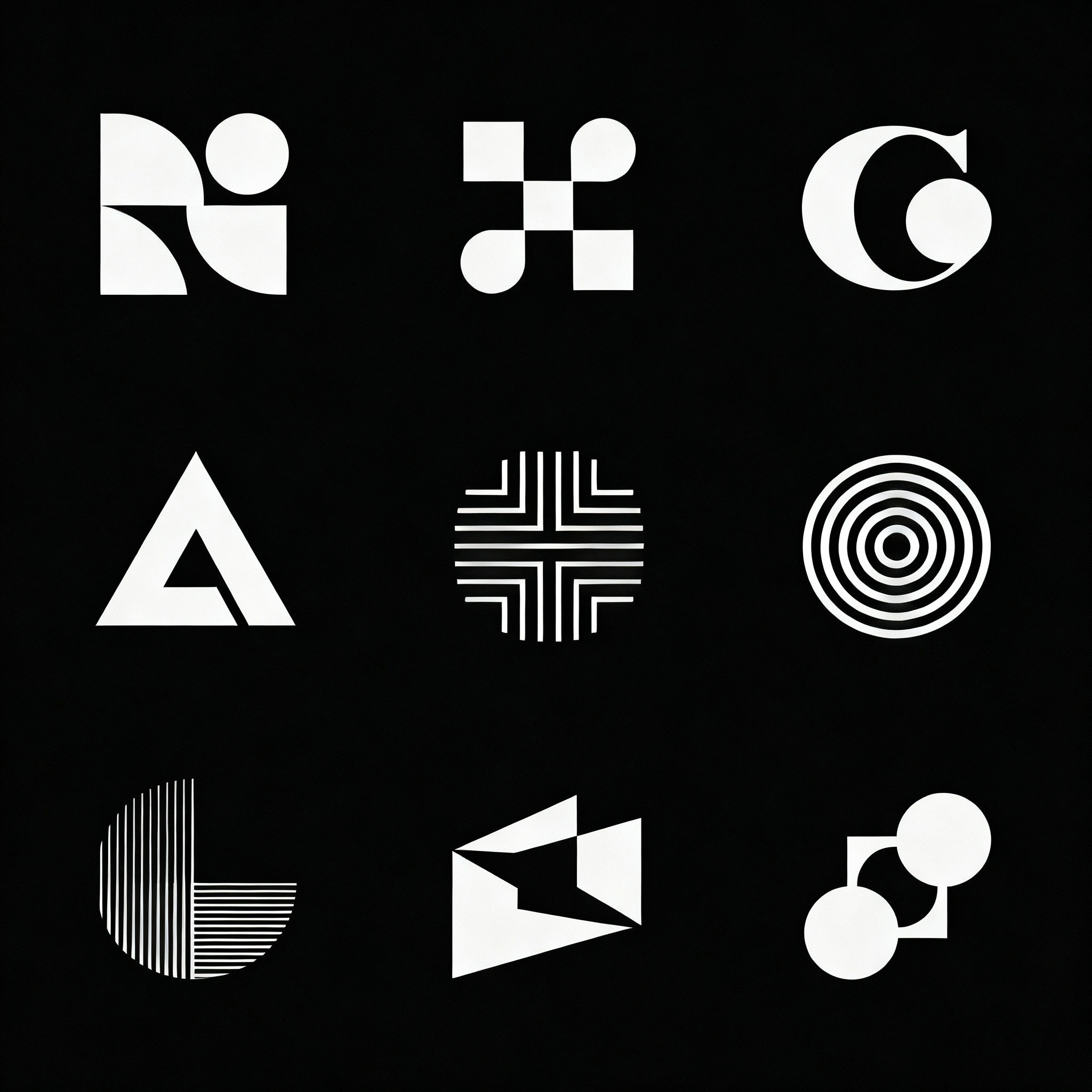A collection of minimalist black and white logos that combines geometric symbols, monograms, and abstract marks with clean lines and high contrast.