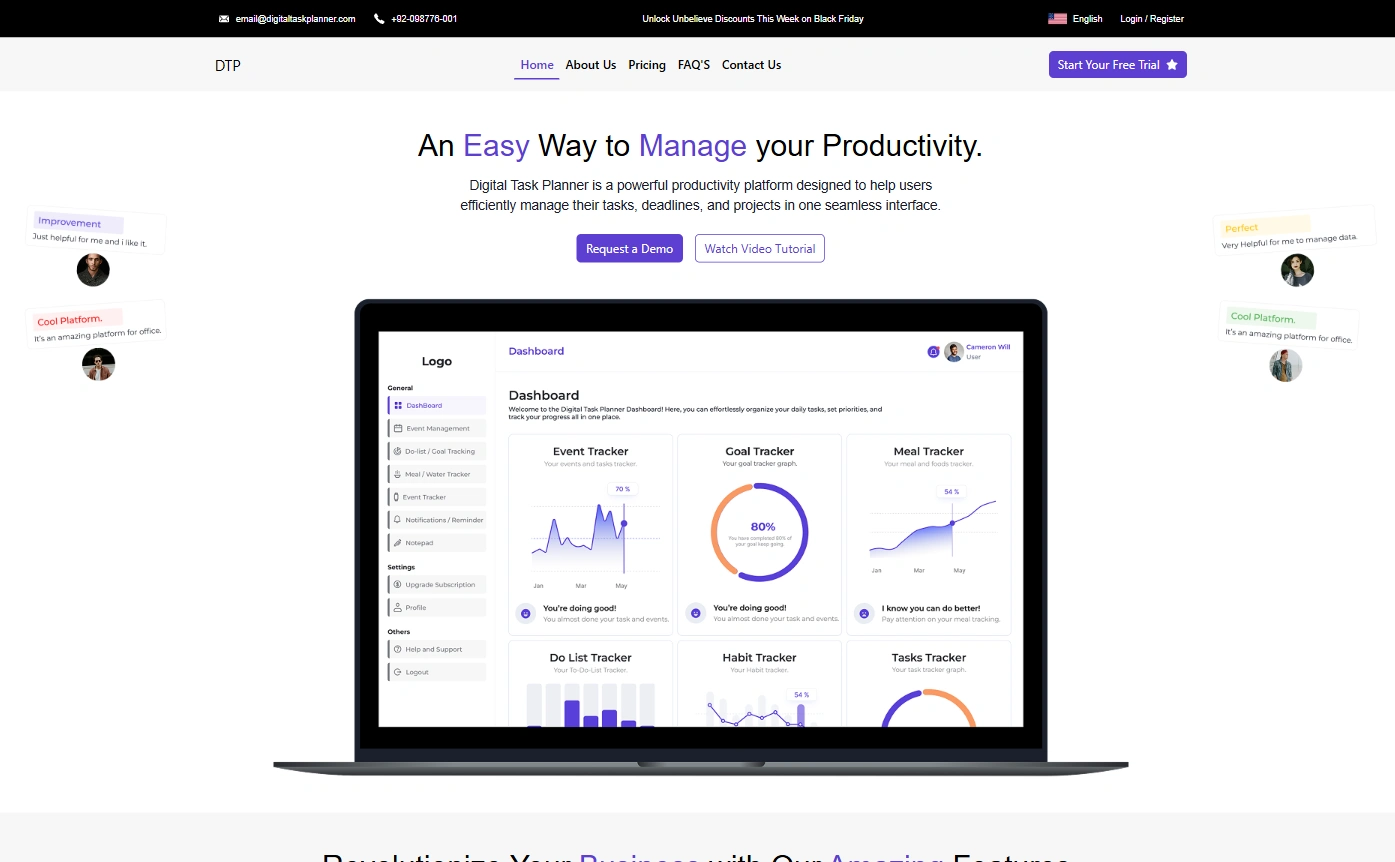 Discover an intuitive dashboard designed to effortlessly manage tasks, deadlines, and projects. Featuring event, goal, and meal trackers with real-time progress visuals, this platform enhances productivity with a seamless, user-friendly interface.