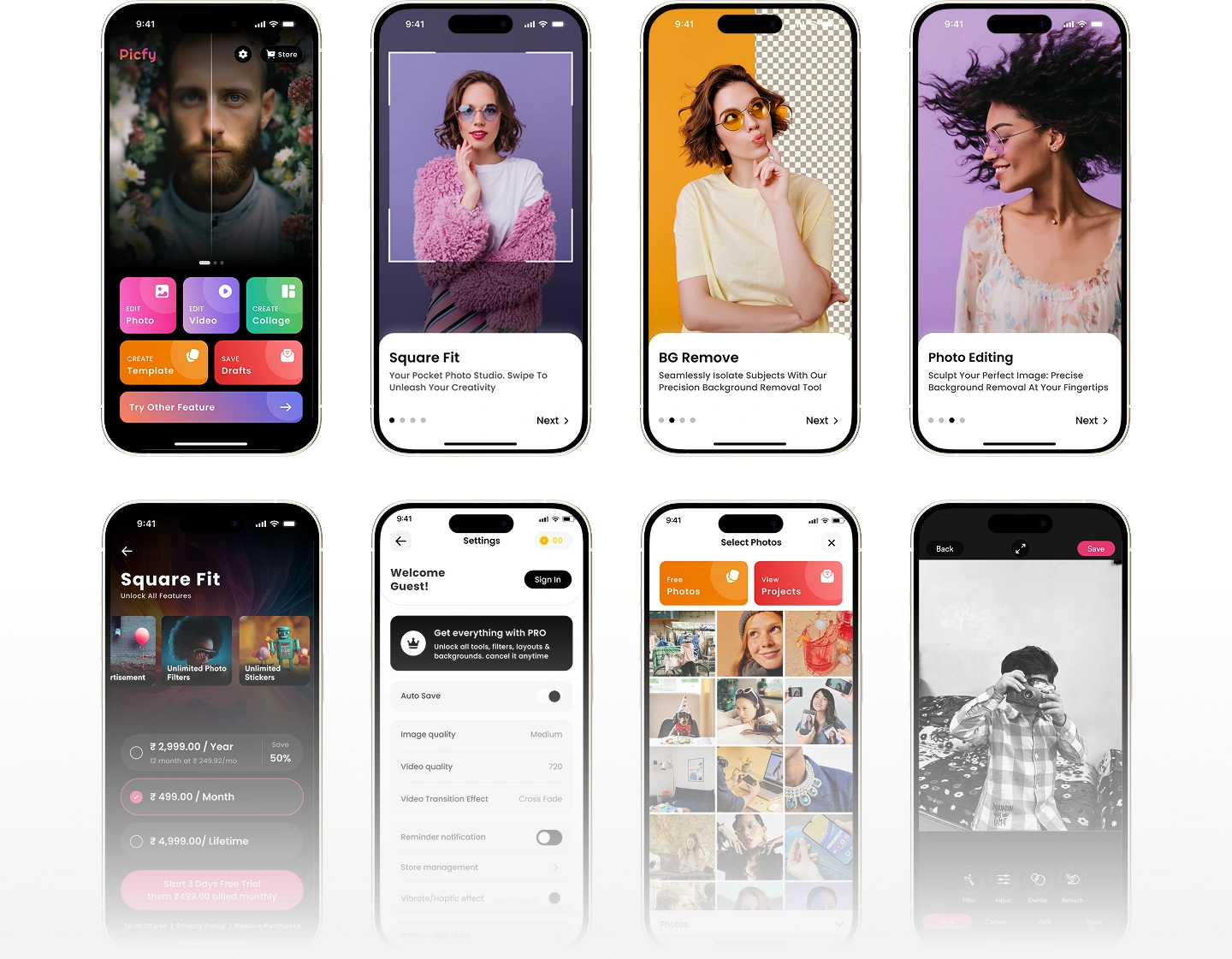 Square Fit is a full-stack photo and video editing platform designed for creators, influencers, and everyday users who want professional-grade results directly from mobile. Originally launched as Picfy and later evolved into Square Fit, the product expanded into a comprehensive editing ecosystem with advanced media tools, social-ready formats, and performance-optimized workflows.