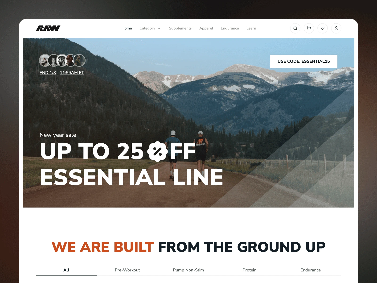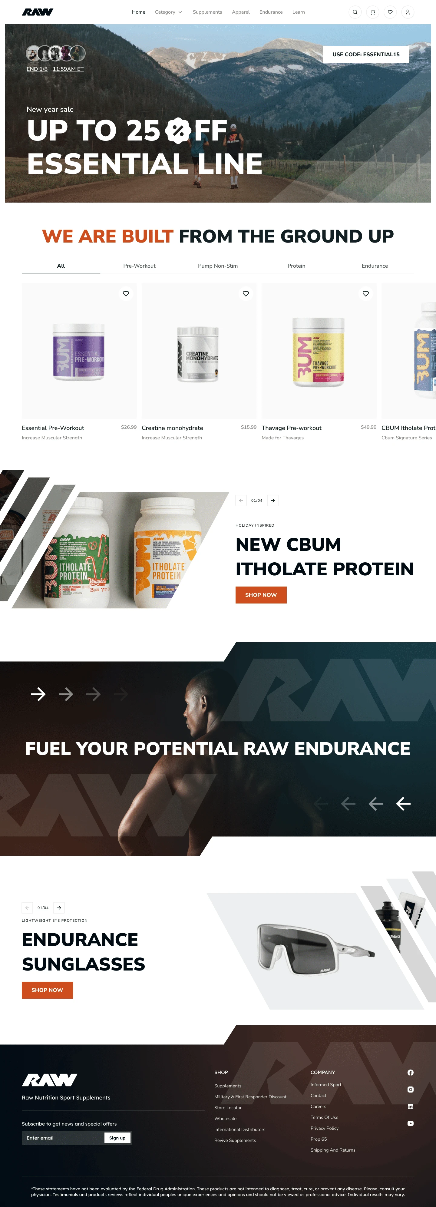 Homepage redesign for RAW Nutrition's store, enhancing product visibility, performance branding and shopping flow