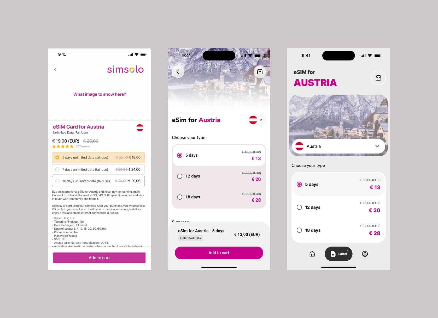 This is a part of an app that is created as an alternative to physical SIM cards. The user can purchase an eSim with unlimited data by selecting an EU country (the app is available only for the EU countries). The app is created in Figma and within a design system. This was actually a redesign task.