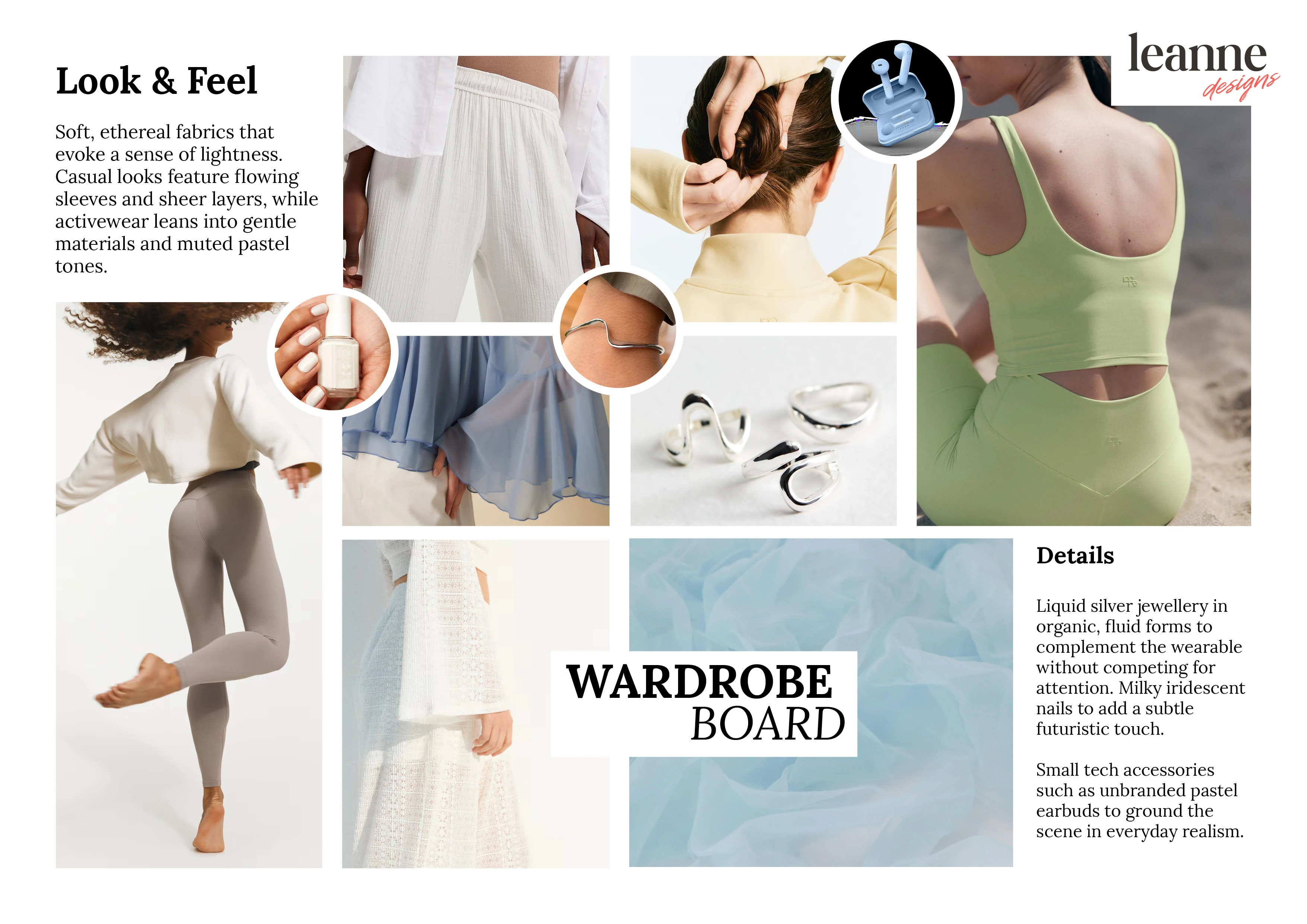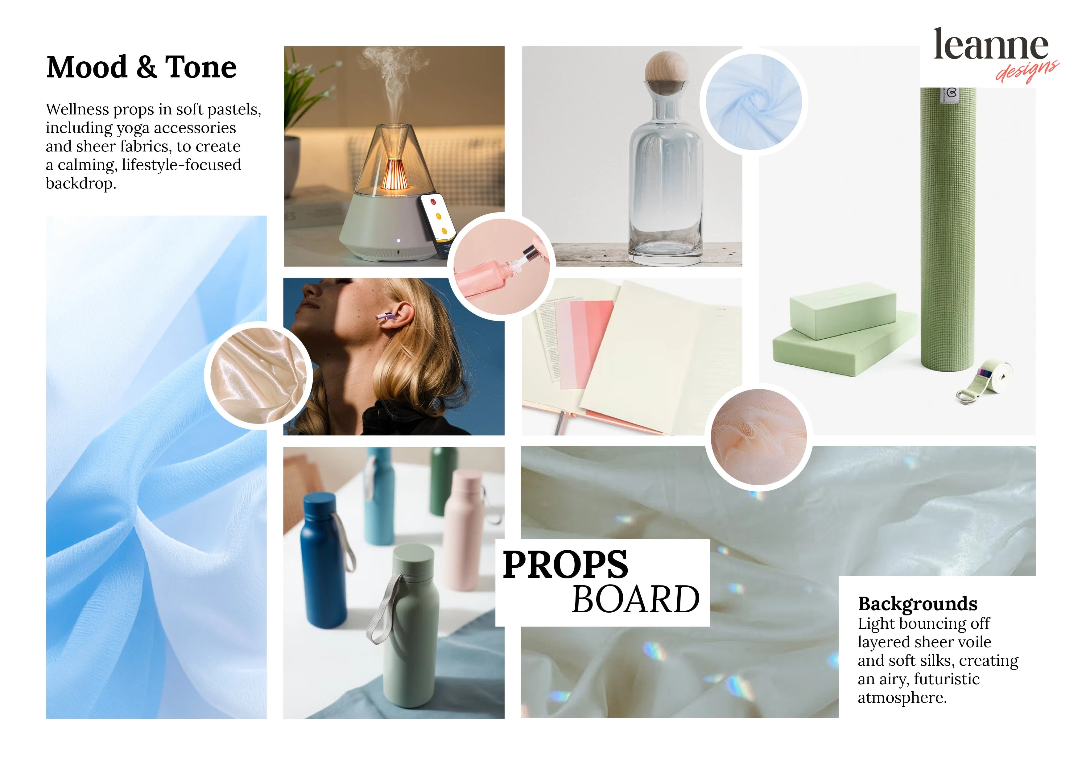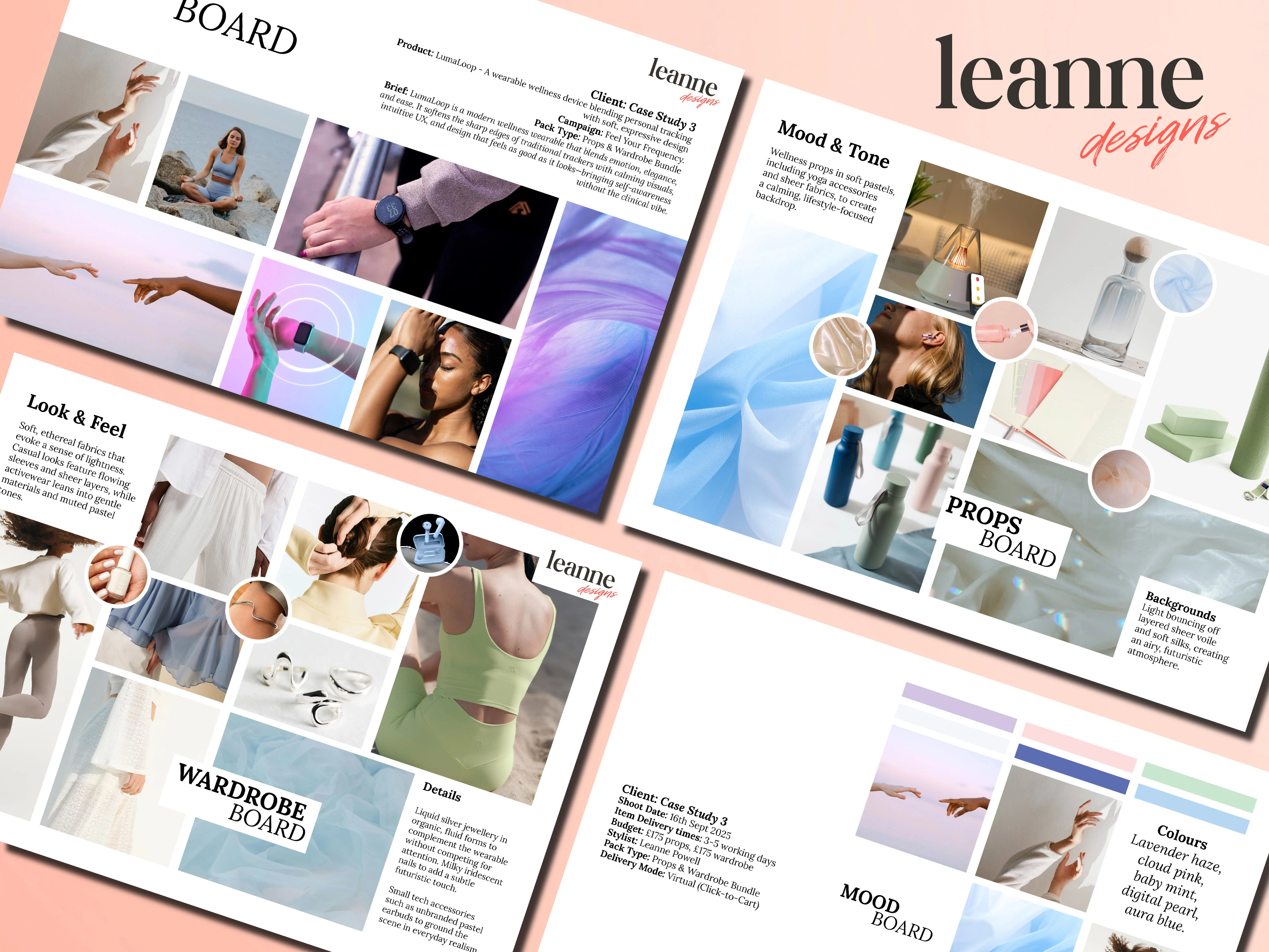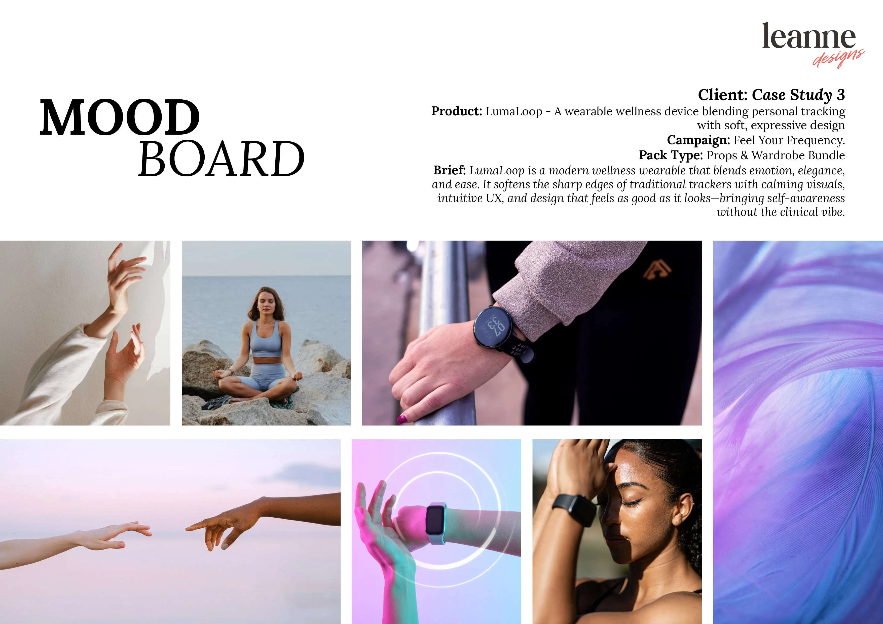 A calming, soft-futurist concept for LumaLoop, a modern wellness wearable. This moodboard explores smooth silicone textures, layered sheer fabrics, ambient lighting, and pastel tech tones—designed to evoke clarity, emotion, and effortless modernity in wellness-focused product styling.