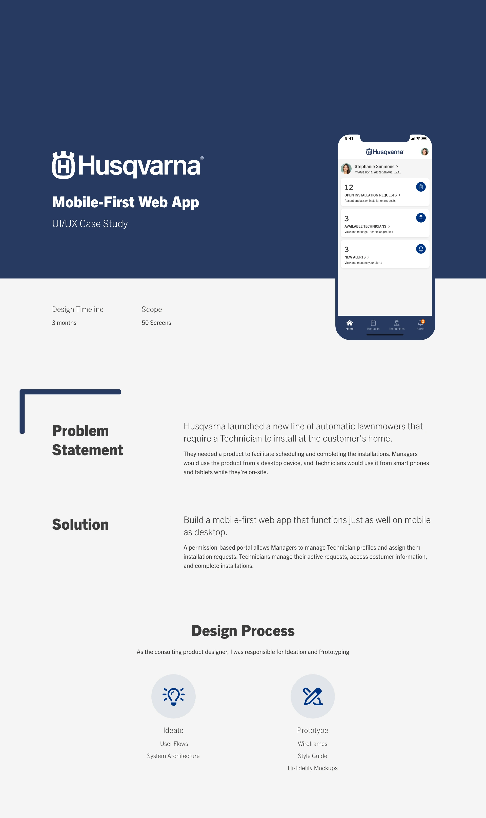 To accompany the launch of a new line of robotic lawnmowers, they needed a platform to coordinate and facilitate technicians completing installations at customers' homes. The solution was a permission-based, mobile-first web app that would be used by Technicians in the field and Managers at the office.