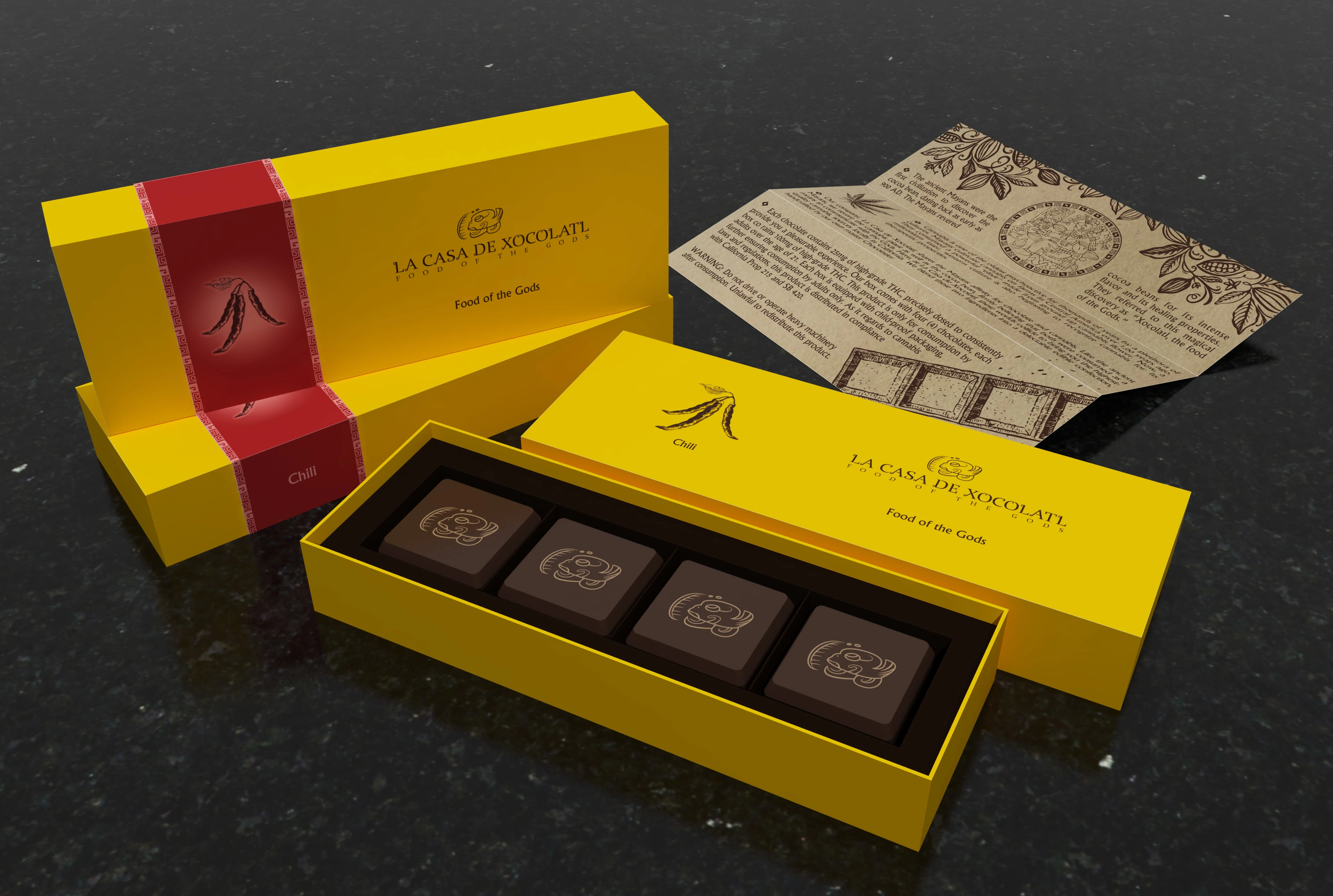La Casa De Xocolatl I redefined premium chocolate packaging using a striking mustard yellow for maximum shelf appeal. The minimalist design features four flavors, each easily identified by a custom silhouette sketch and a color-coded sleeve. It’s a perfect blend of artistic style and functional design.