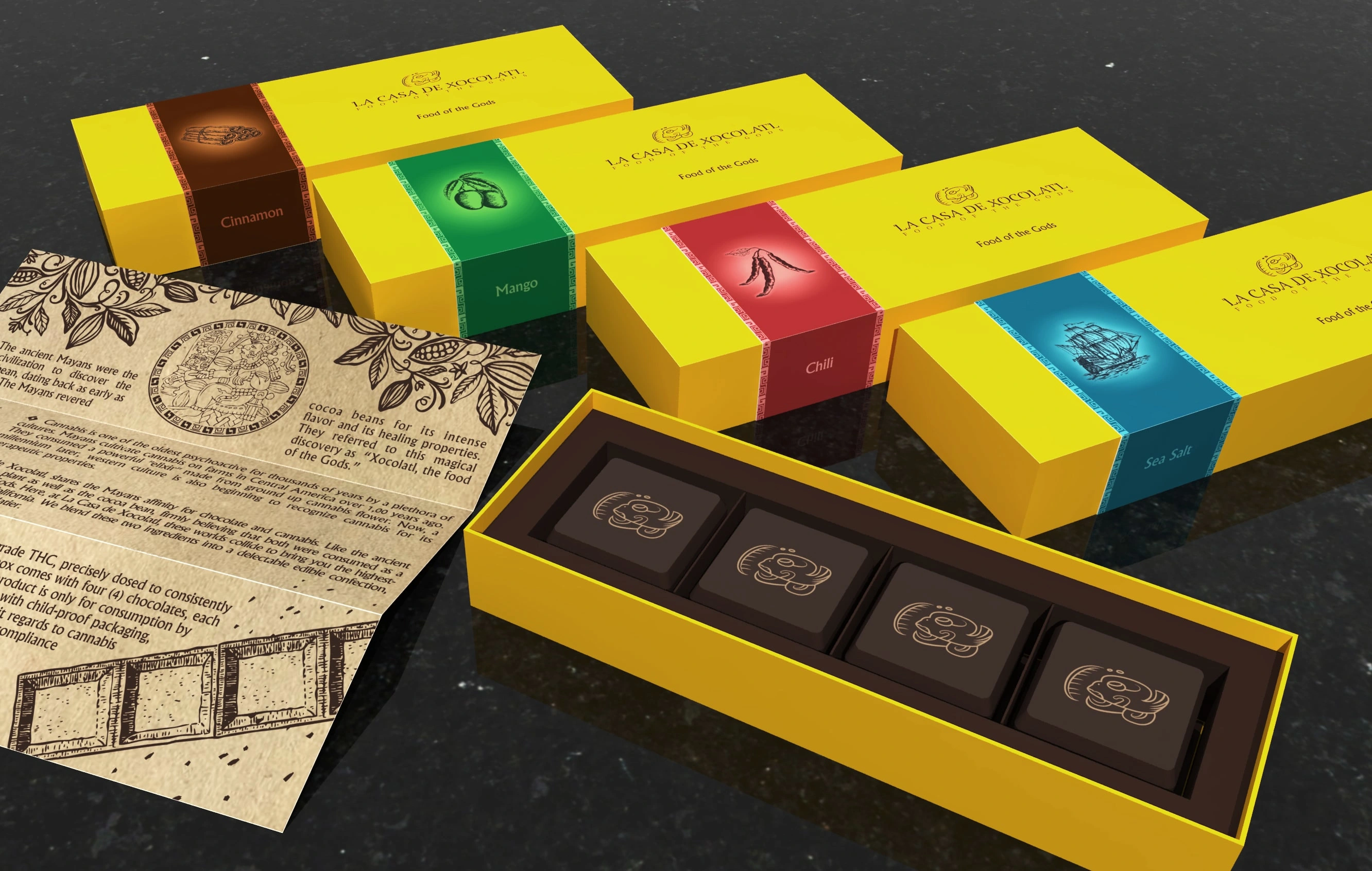 La Casa De Xocolatl: Premium chocolate in striking mustard yellow. Minimalist, artistic design with custom sketches and color-coded sleeves for shelf appeal.