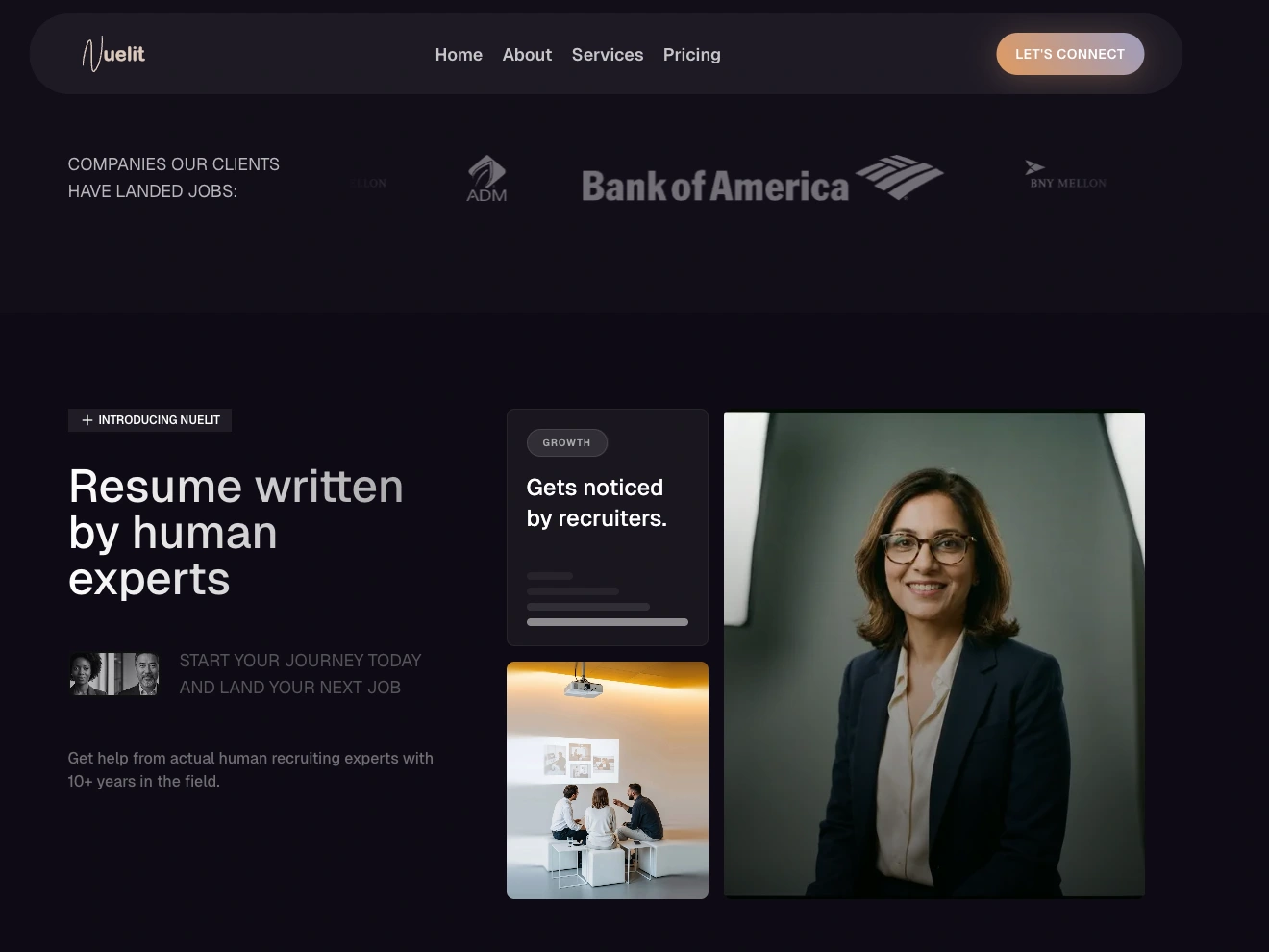 Nuelit is a professional career services platform that bridges high-end recruitment expertise with modern software development. Originally a collaborative effort between a professional recruiter and me, the platform has evolved into a comprehensive hub for career coaching, resume writing, and ATS optimization, services.